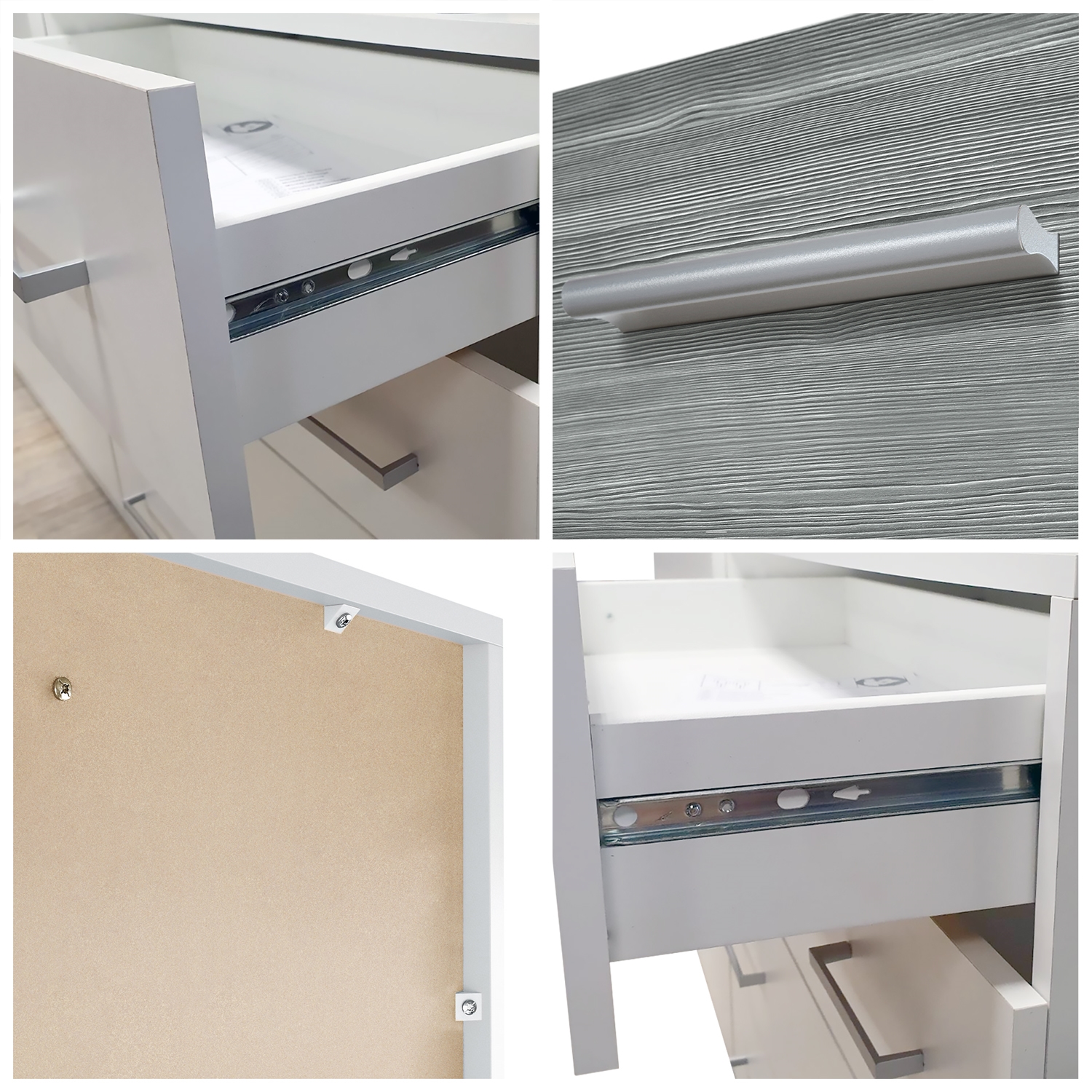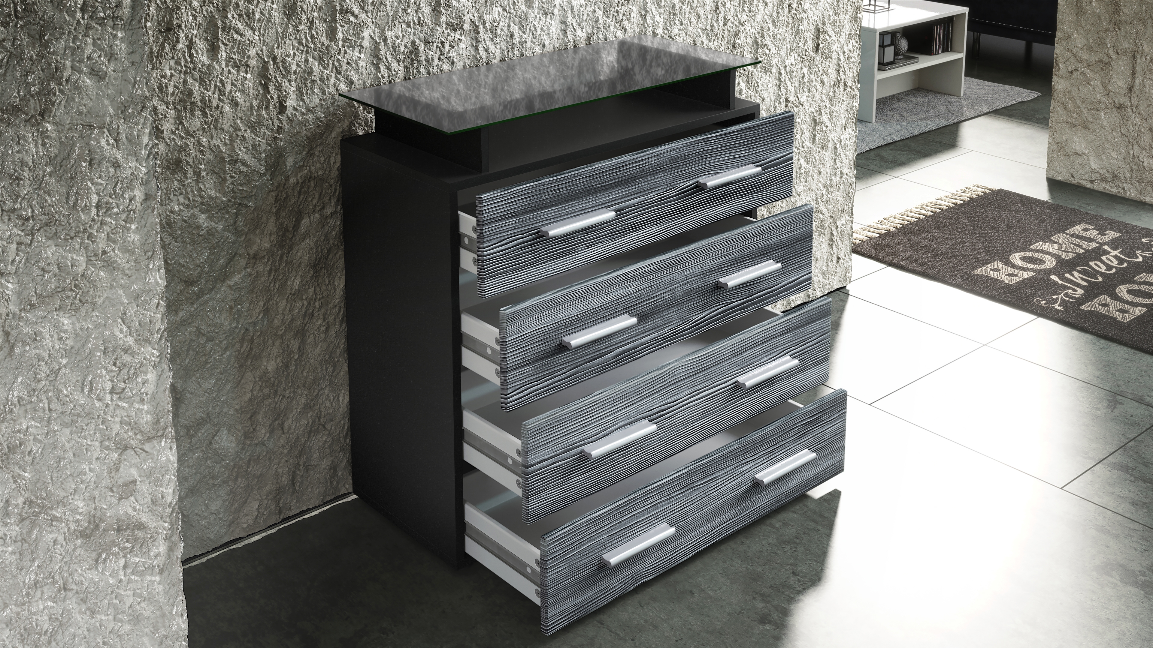 Ob als modernes Sideboard im Wohnzimmer, Kommodenschrank für's Schlafzimmer, Anrichte im Flur oder als Kommode im Kinderzimmer - die geräumige Kommode Pavos V2 präsentiert sich als praktisches Möbelstück mit modernem Design, hergestellt in Deutschland. Der Beistellschrank ist mit einer dekorativen Glasablage und vier leichtgängigen Schubladen ausgerüstet. Diese verlaufen dank Laufschienen aus Metall nahezu geräuschlos und sorgen für eine leichte Handhabung. Die Schubladen sind mit dezenten, silbernen Griffen ausgestattet. Optional können Sie das Sideboard auch ohne die Glasablage wählen. Eine Rückwand in Holzoptik aus Hartfaserplatten ist im Lieferumfang enthalten.