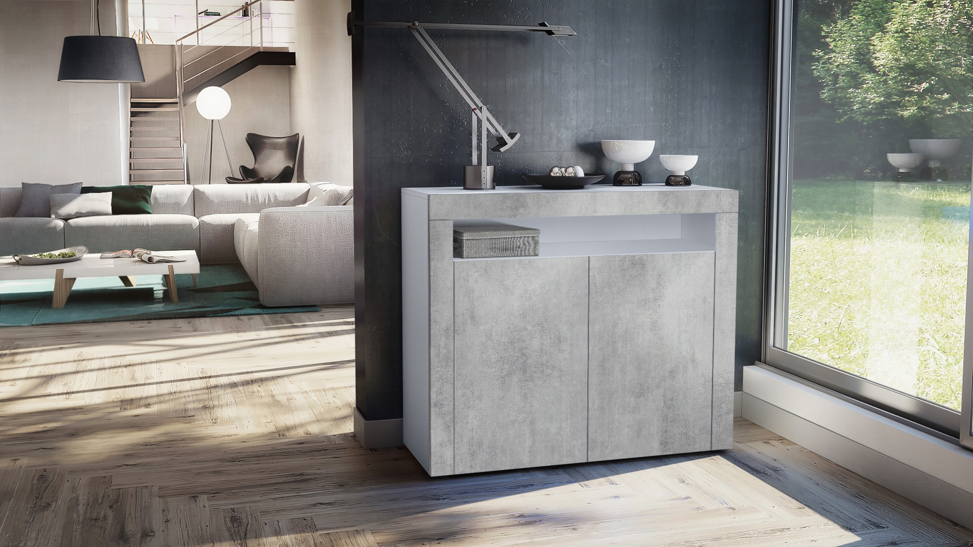 Produktinformationen "Kommode Valencia mit 2 Türen und 1 offenem Fach Weiß matt/Beton Oxid Optik/Beton Oxid Optik (108 x 92 x 40 cm)"