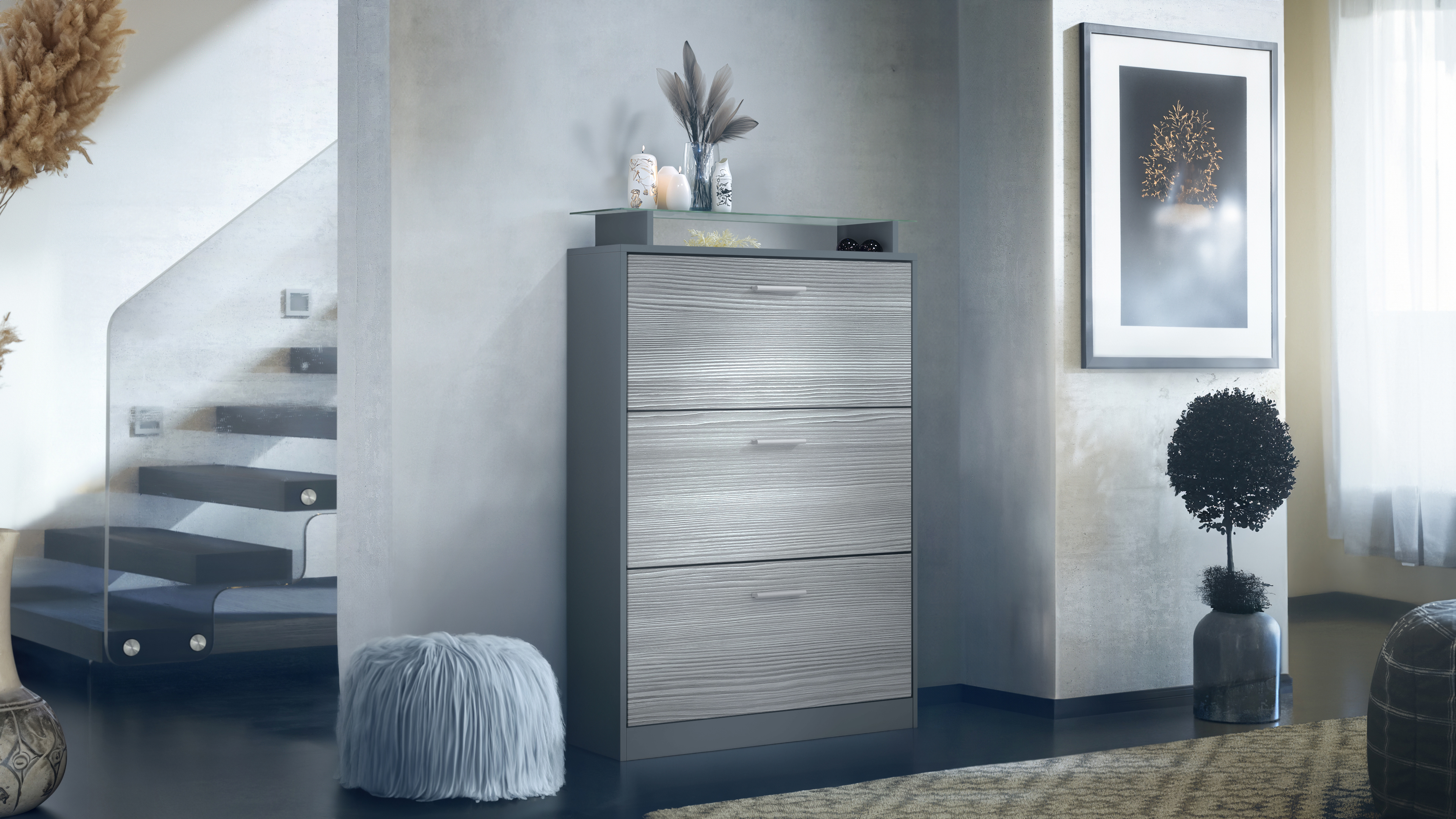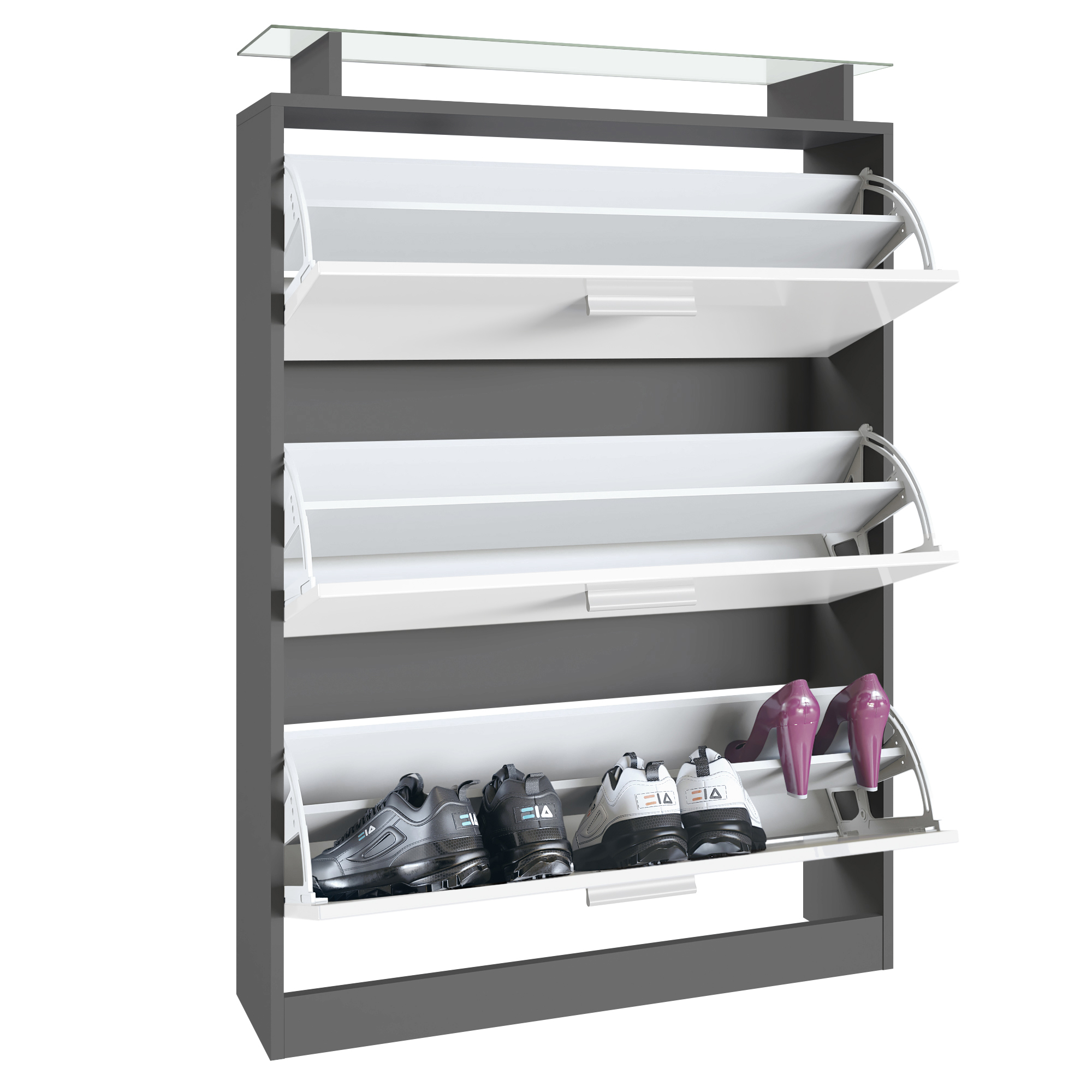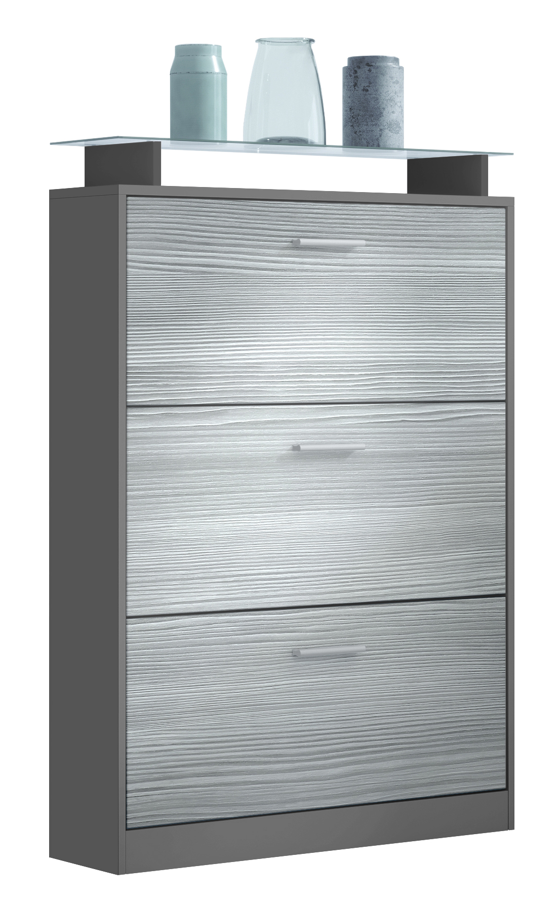 Produktinformationen "Lavia Schuhschrank Anthrazit matt für 24 Paar Schuhe mit 3 Klappen und Glasablage Anthrazit matt/Avola-Anthrazit (89 x 128 x 23 cm)"