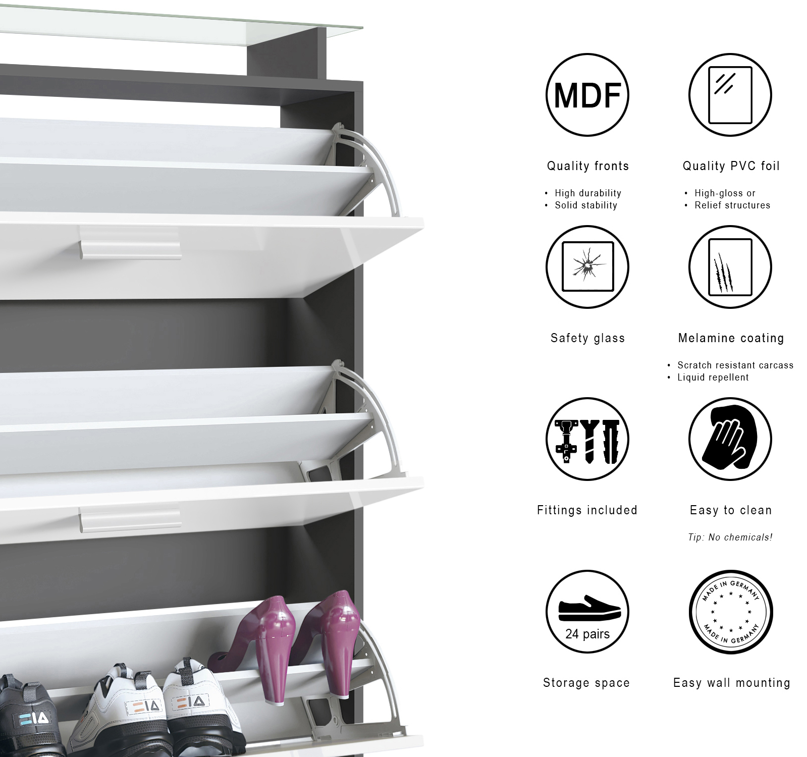 Durch das schlichte, moderne Design lässt sich der schmale Schuhschrank mit vielen verschiedenen Einrichtungsstilen kombinieren. Für eine besondere Eleganz sorgen die Fronten des Schuhkippers, erhältlich in vielen verschiedenen Farbvarianten, die Ihnen eine Vielzahl an Kombinationsmöglichkeiten bieten. Durch die Oberflächenbeschichtung erhalten Sie ein besonders pflegeleichtes Produkt. Für die Reinigung können Sie auf Chemie verzichten - es genügt ein leicht angefeuchtetes Tuch, um die wasserfeste Oberfläche angemessen zu reinigen.