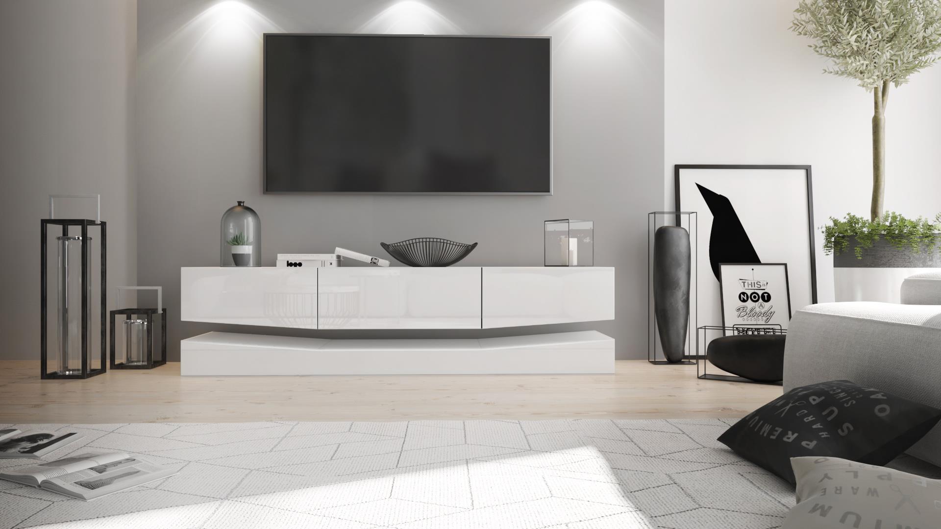 Das TV-Lowboard City eignet sich als TV-Tisch für jeden Wohnraum. Die geräumige TV-Kommode präsentiert sich als praktisches Möbelstück mit modernem Design, hergestellt in Deutschland. Das Fernsehboard ist mit einem großen, offenen Fach und drei Schubladen ausgerüstet. Der große Oberboden bietet auch für größere Fernseher ausreichend Platz. Die Unterseite des hängenden Elements des TV-Unterschranks kann optional mit einer LED-Beleuchtung versehen werden. Außerdem kann das obere Element bezüglich der Höhe individuell an der Wand montiert werden. Das Sockelelement ist stehend. Die leichtgängen Schubladen lassen sich dank praktischer Überstände ganz bequem öffnen und verlaufen auf Laufschienen aus Metall nahezu geräuschlos. Auf eine Rückwand wurde bei diesem Lowboard verzichtet.