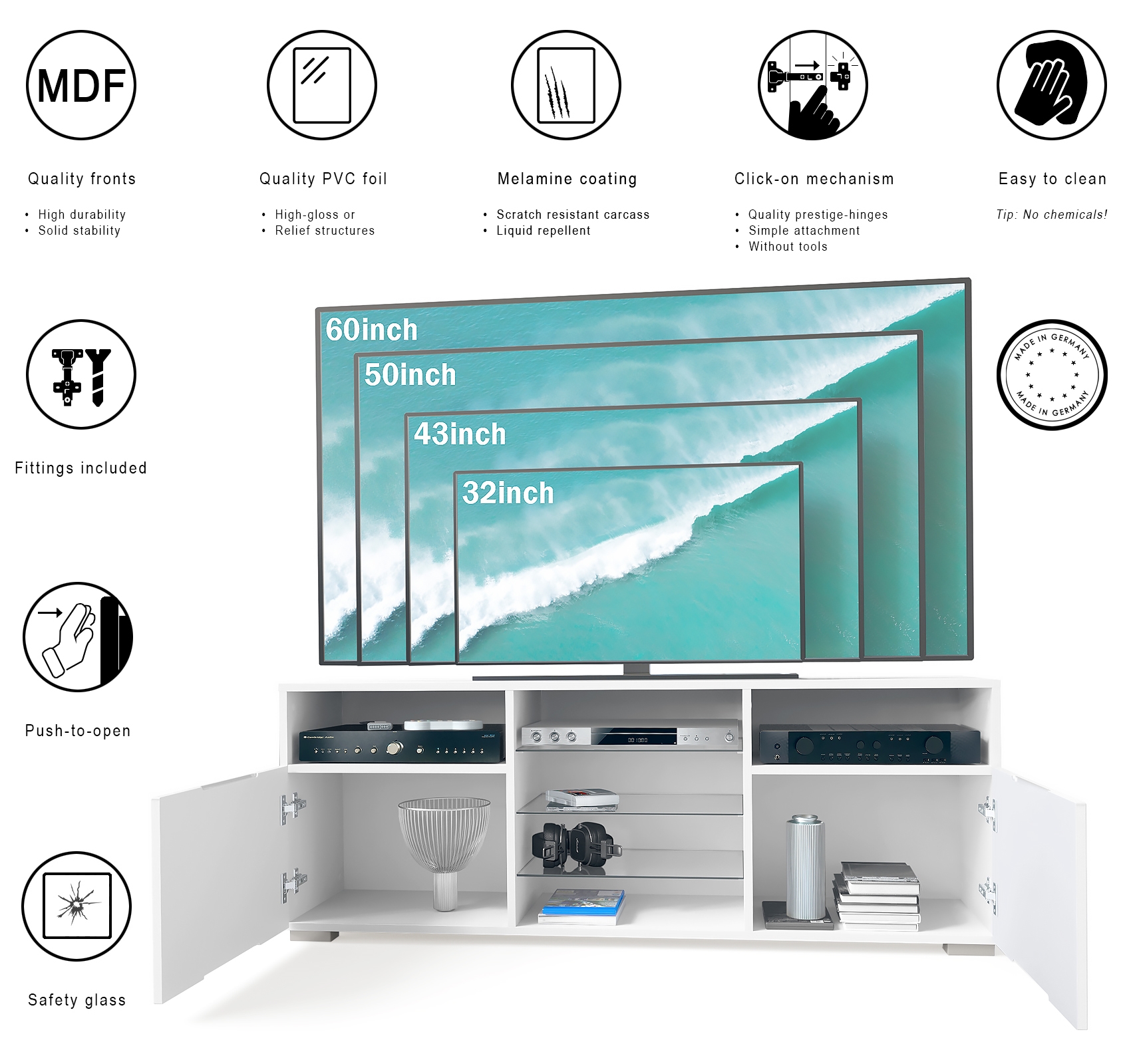 Hochwertig foliierte MDF-Fronten und ein Korpus aus Spanplatten mit Melaminbeschichtung gewährleisten eine langlebige und pflegeleichte Qualität. Das TV-Board ist leicht, stabil und bietet Ihnen somit ein Möbelstück, das sowohl funktional als auch robust ist – Verarbeitung Made in Germany.
