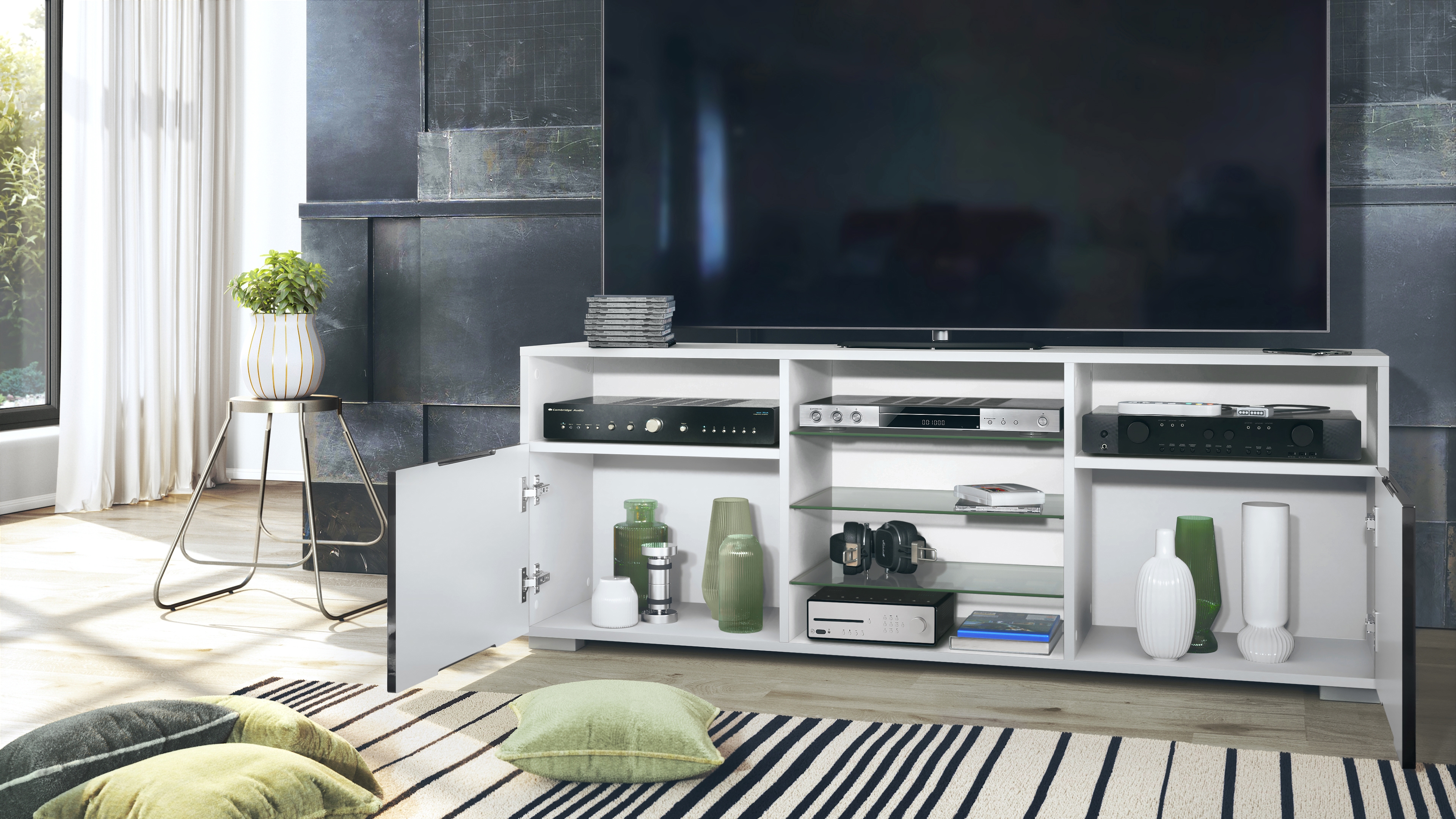 Das Granada Open-Storage TV-Board vereint elegantes Design mit durchdachter Raumausnutzung. Offene Fächer präsentieren Elektronik, während diskrete Türen geschickt Stauraum bieten.