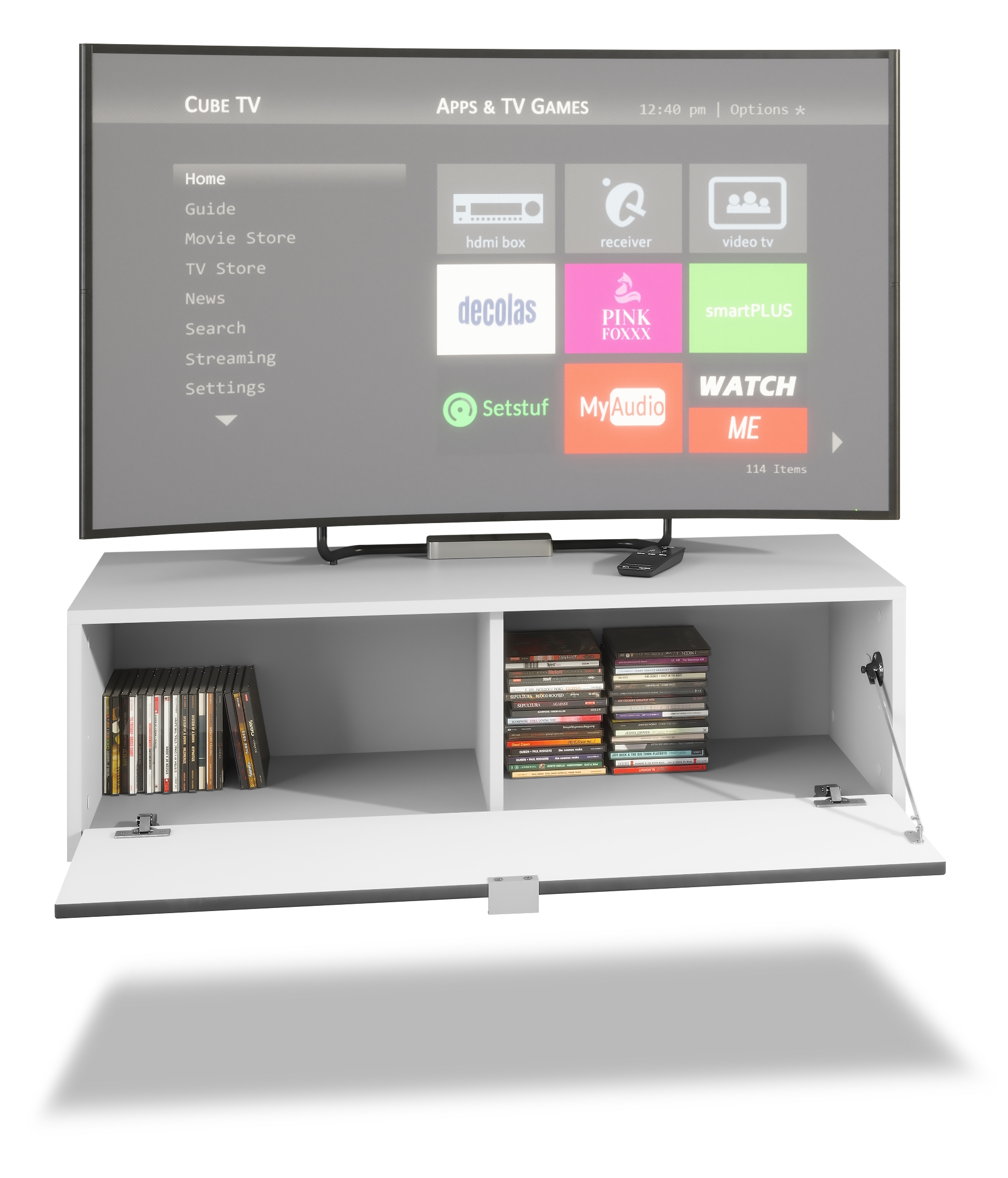 Das TV Board Lana besitzt eine große Klappe, die mit einem metallischen Winkelgriff versehen ist. Hinter der Klappe befinden sich zwei Fächer mit reichlich Raum zum Verstauen von persönlichen Habseligkeiten. Ob CDs, Videospiele, Bücher, Kleidung oder andere Gegenstände: In dem Lana TV Board wird alles sicher untergebracht und bleibt vor Staub geschützt.