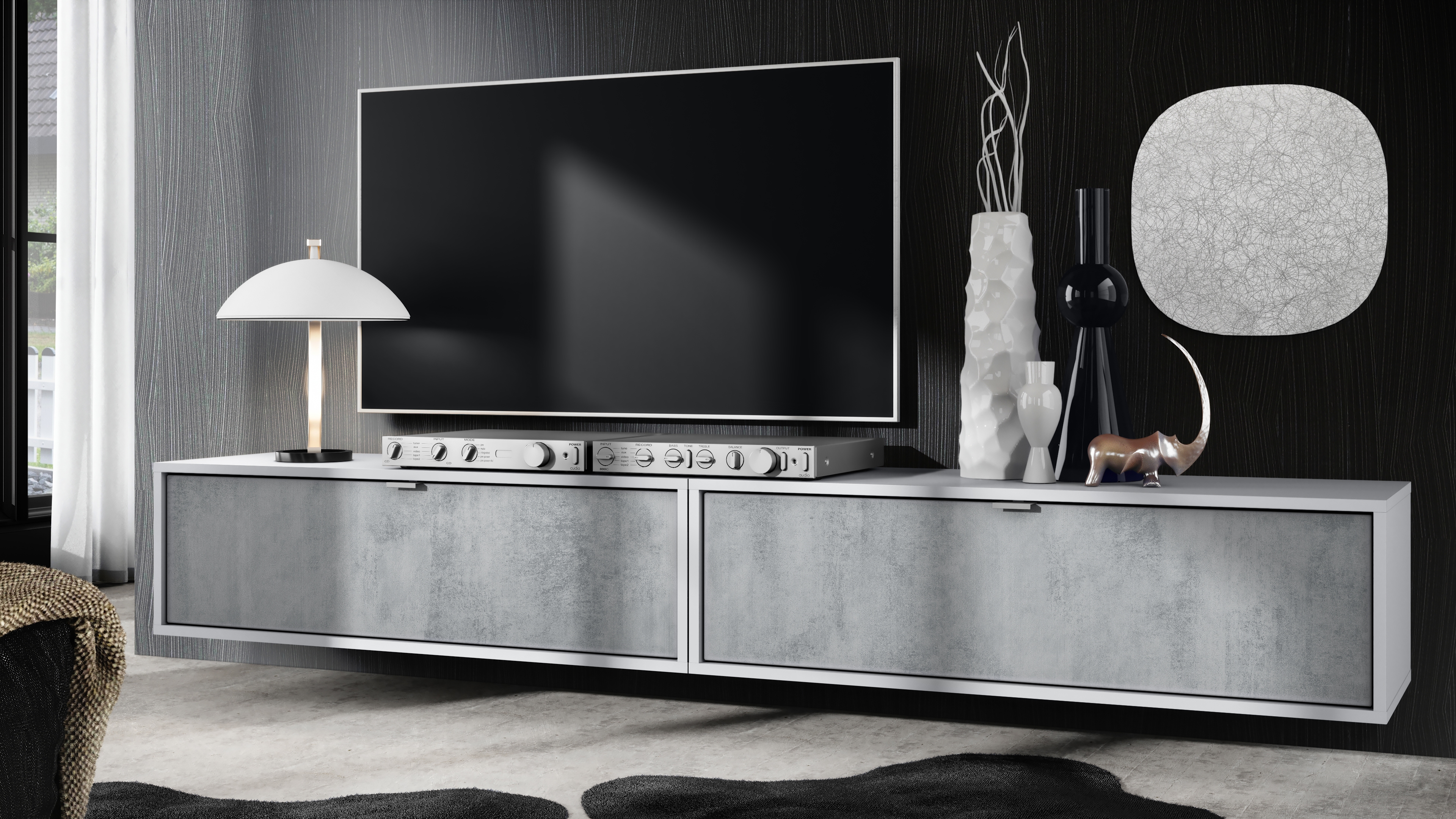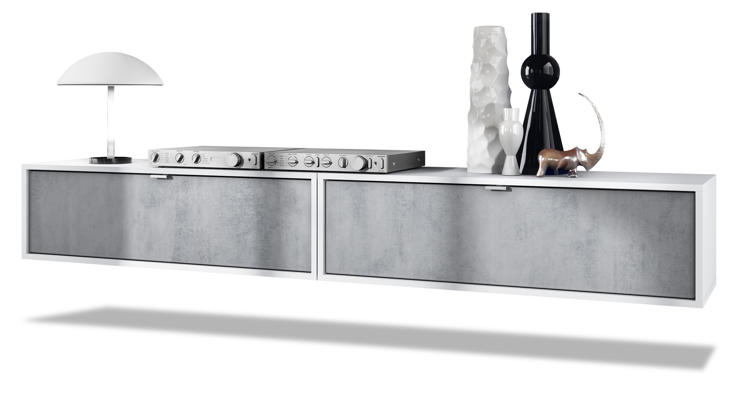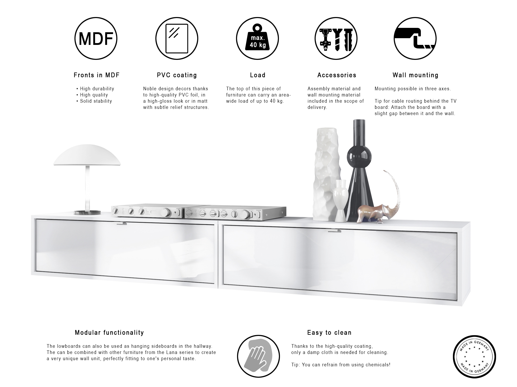 Der Korpus des TV Boards hat die Farbe Weiß matt. Um dem Möbelstück einen futuristischen Stil zu verleihen, wird es hängend an der Wand befestigt. So kann man es nahezu überall im Haus anbringen. Dies ist gerade dann praktisch, wenn auf dem Boden nicht genügend Platz für stehende Möbel verfügbar ist.