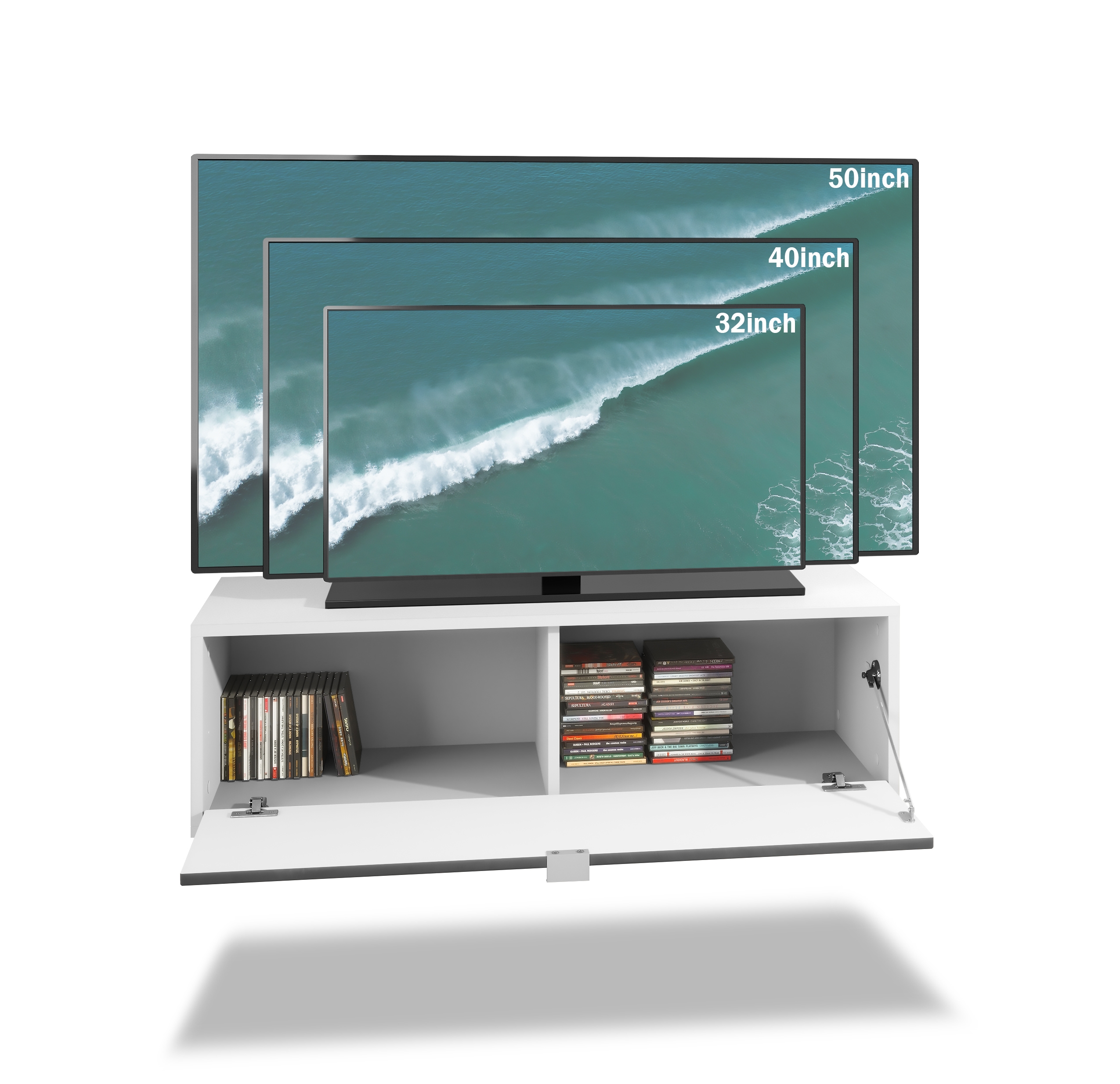 Der Korpus des TV Boards hat die Farbe Weiß matt. Um dem Möbelstück einen futuristischen Stil zu verleihen, wird es hängend an der Wand befestigt. So kann man es nahezu überall im Haus anbringen. Dies ist gerade dann praktisch, wenn auf dem Boden nicht genügend Platz für stehende Möbel verfügbar ist.