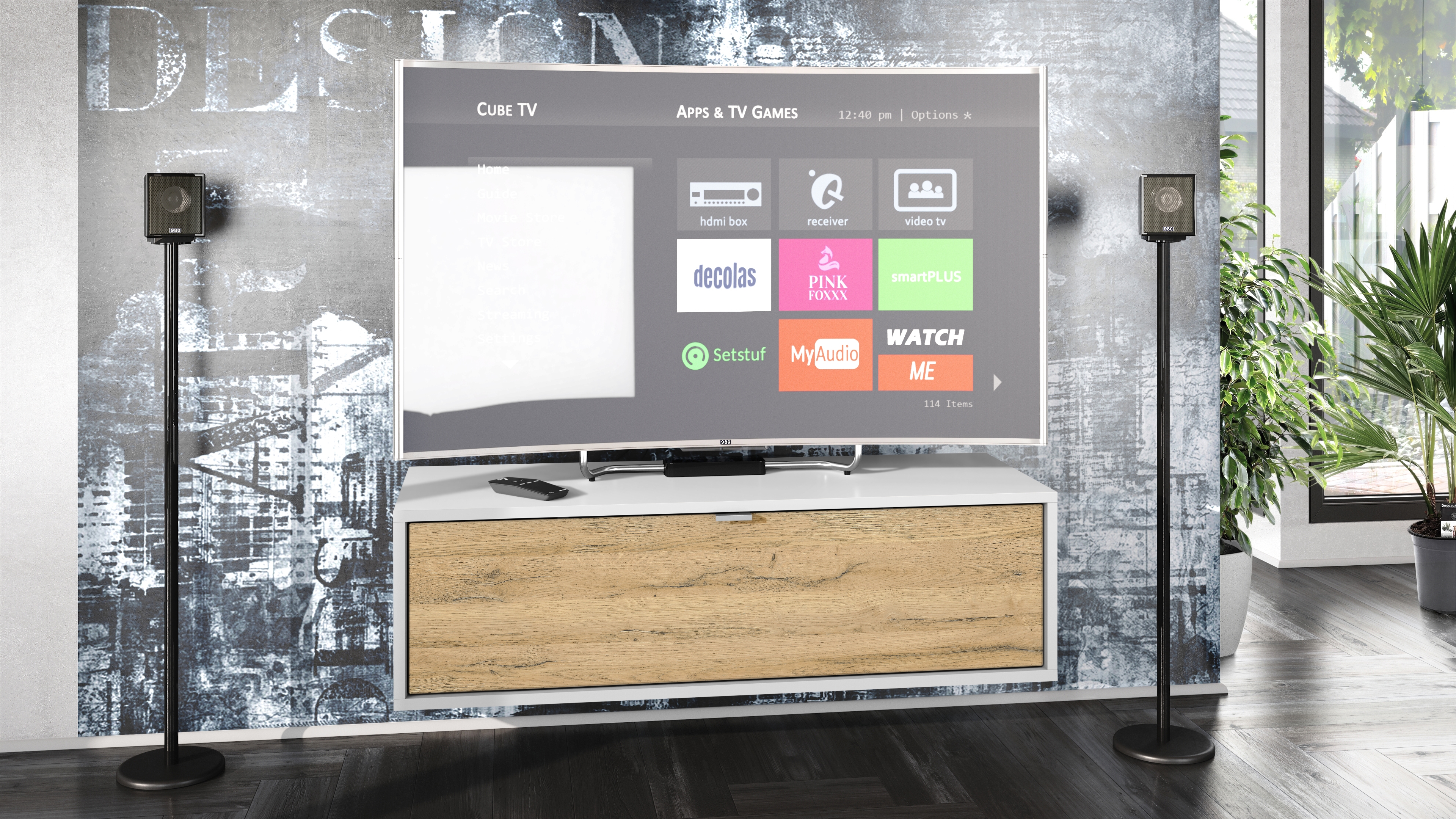 Das charmant schlichte TV Board Lana 100 überzeugt durch sein zeitloses Design und seinen großzügigen Stauraum.