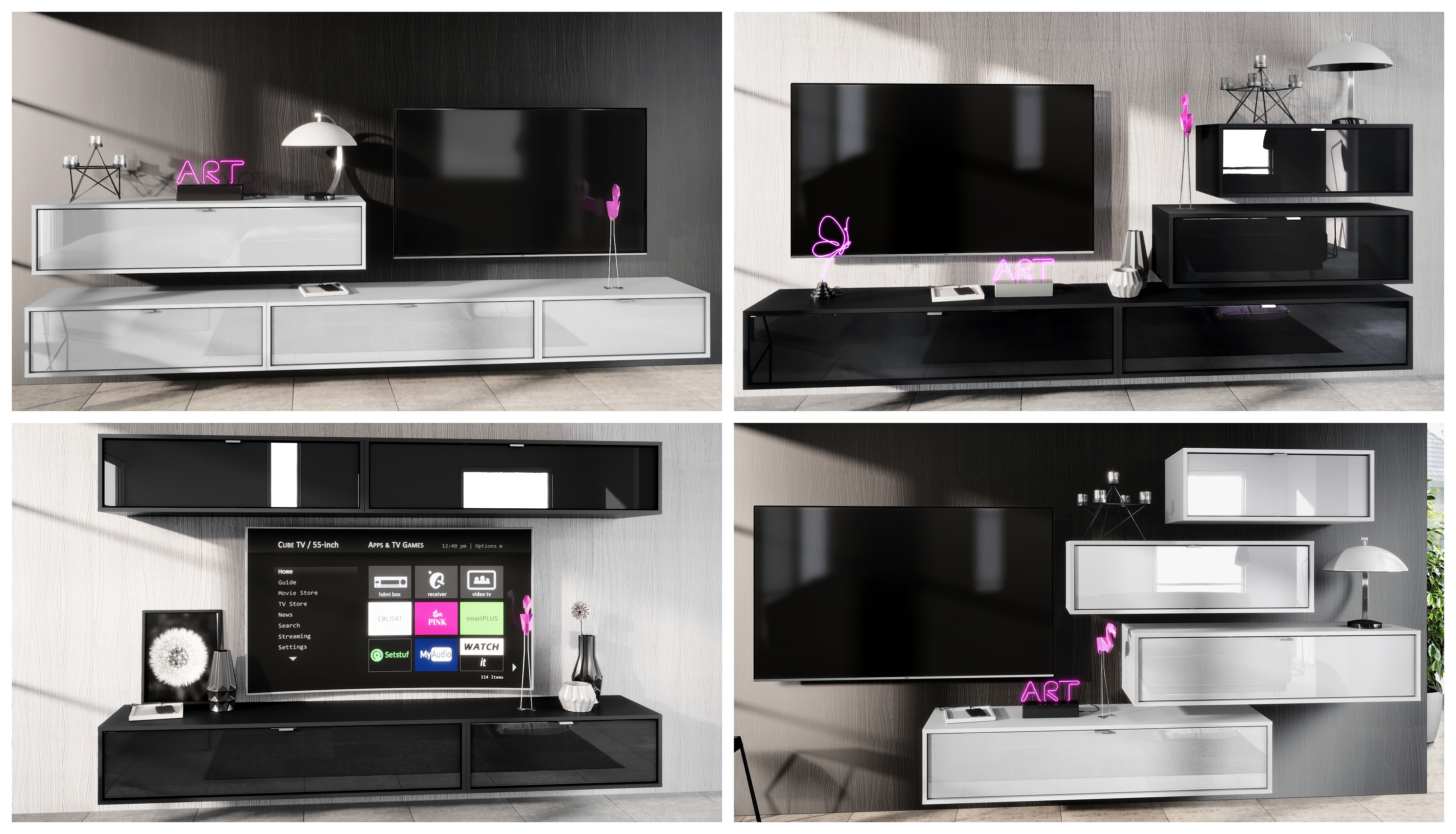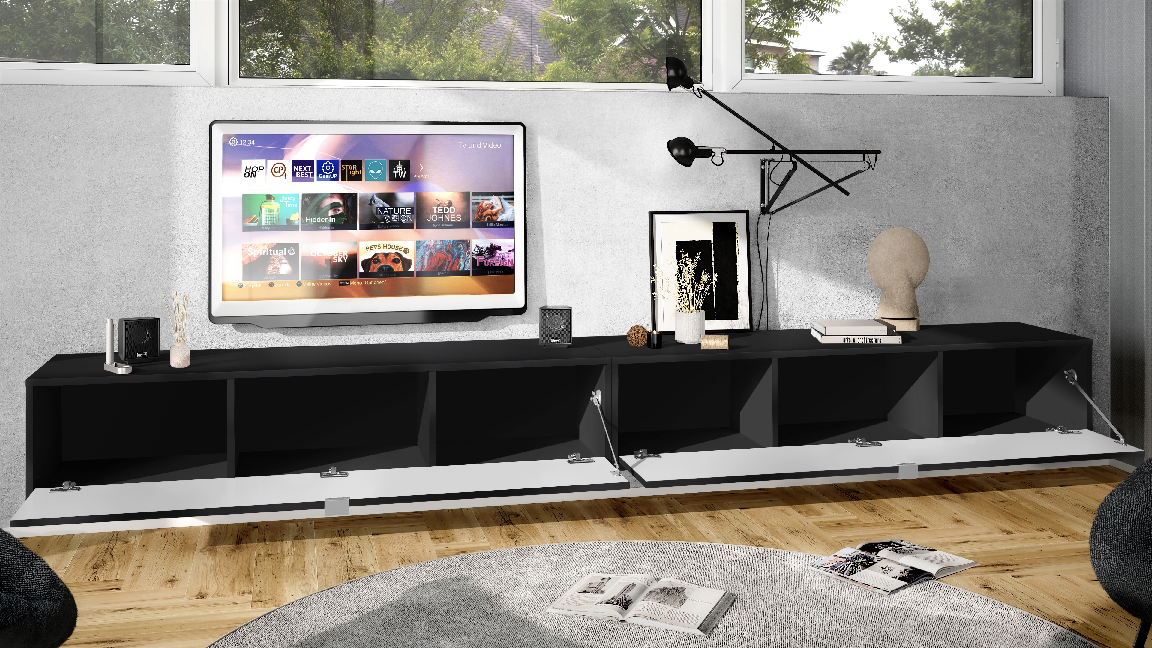 Der Korpus des TV Boards hat die Farbe Schwarz matt. Um dem Möbelstück einen futuristischen Stil zu verleihen, wird es hängend an der Wand befestigt. So kann man es nahezu überall im Haus anbringen. Dies ist gerade dann praktisch, wenn auf dem Boden nicht genügend Platz für stehende Möbel verfügbar ist.