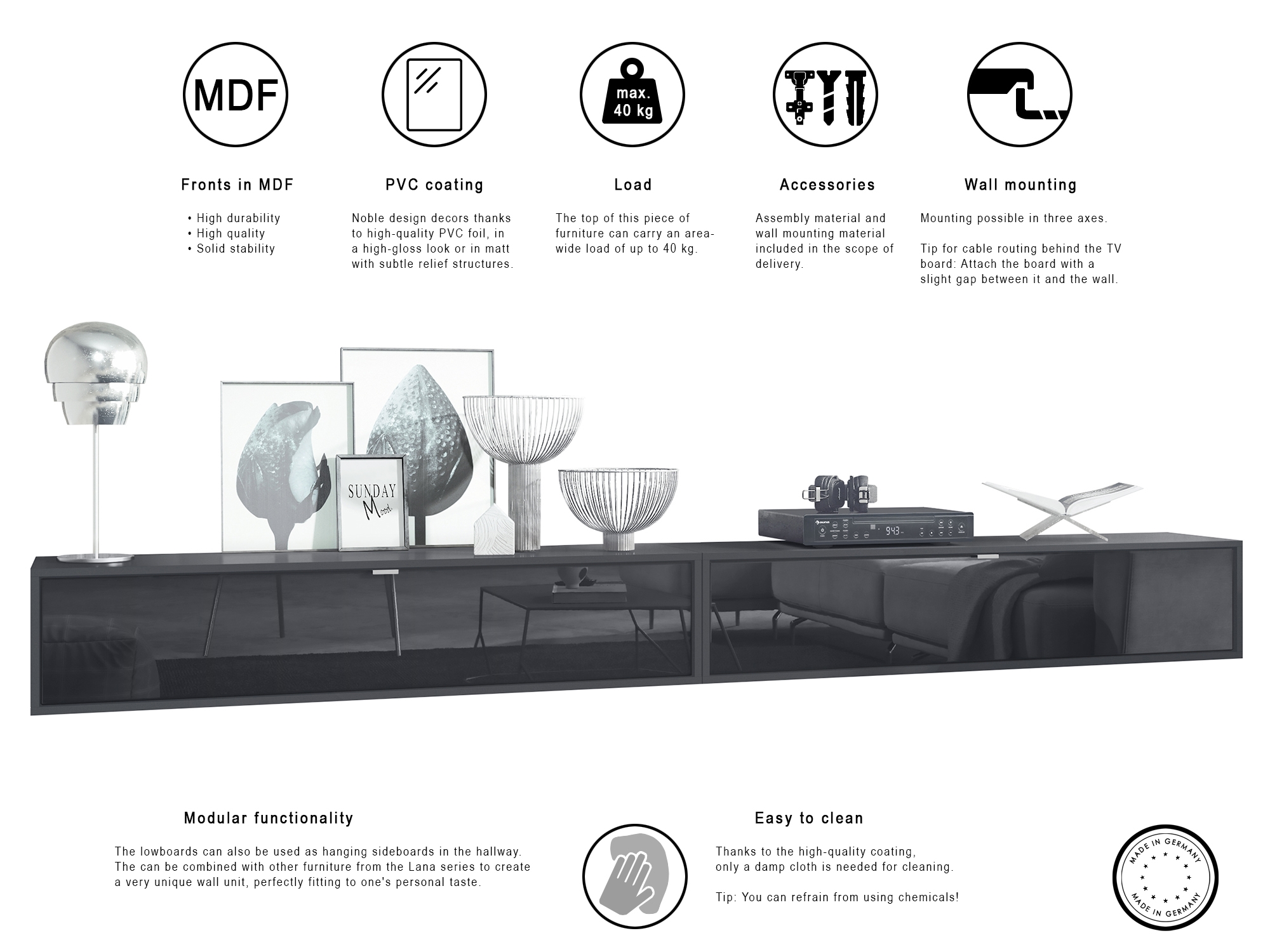 So viel mehr als nur ein TV Board: Das Hängeelement Lana demonstriert, was „Multifunktionalität“ bedeutet. In erster Linie als Lowboard gedacht, kann es genauso gut als Sideboard, Büro- oder Dielenmöbel genutzt werden. Es stellt die perfekte Ergänzung für jeden Haushalt dar.