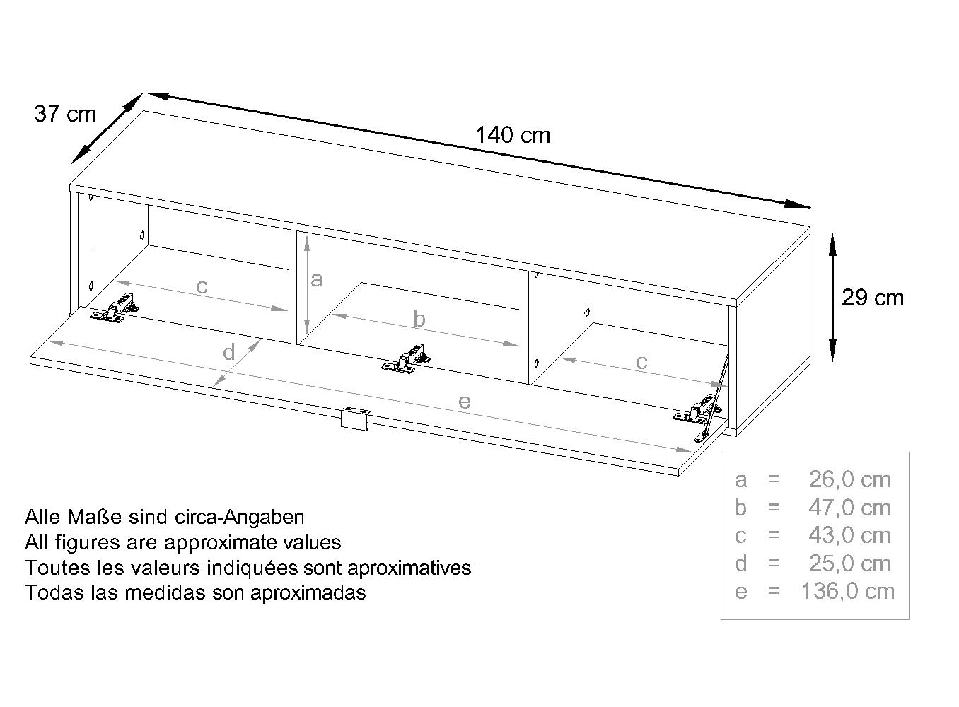 Maße eines einzelnen TV Boards (BxHxT): 140 x 29 x 37 cm