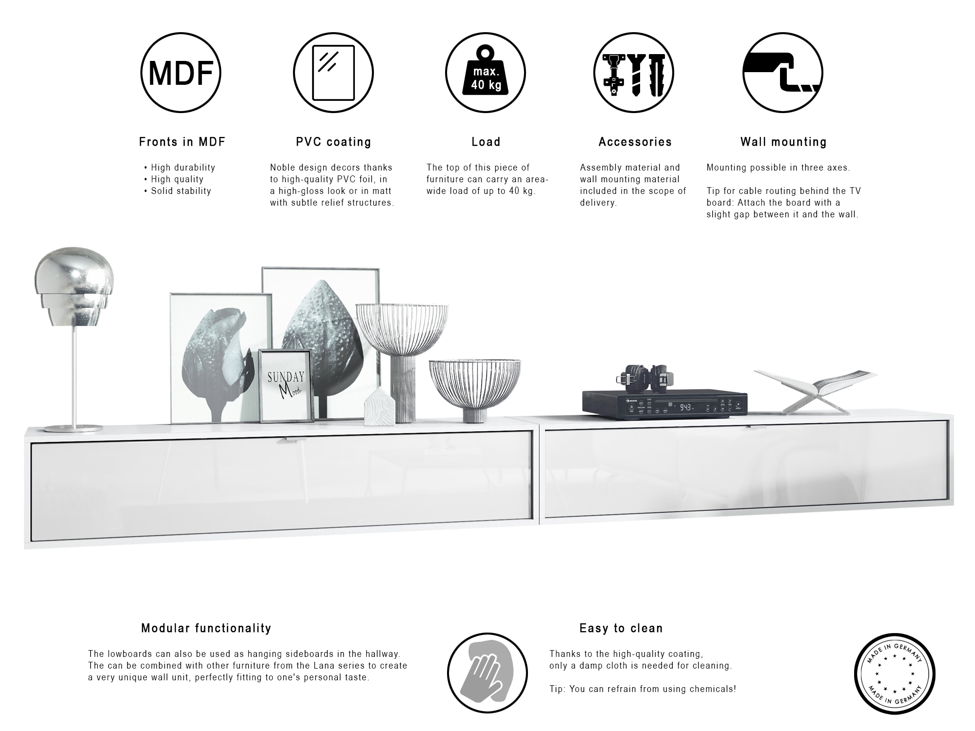 So viel mehr als nur ein TV Board: Das Hängeelement Lana demonstriert, was „Multifunktionalität“ bedeutet. In erster Linie als Lowboard gedacht, kann es genauso gut als Sideboard, Büro- oder Dielenmöbel genutzt werden. Es stellt die perfekte Ergänzung für jeden Haushalt dar.