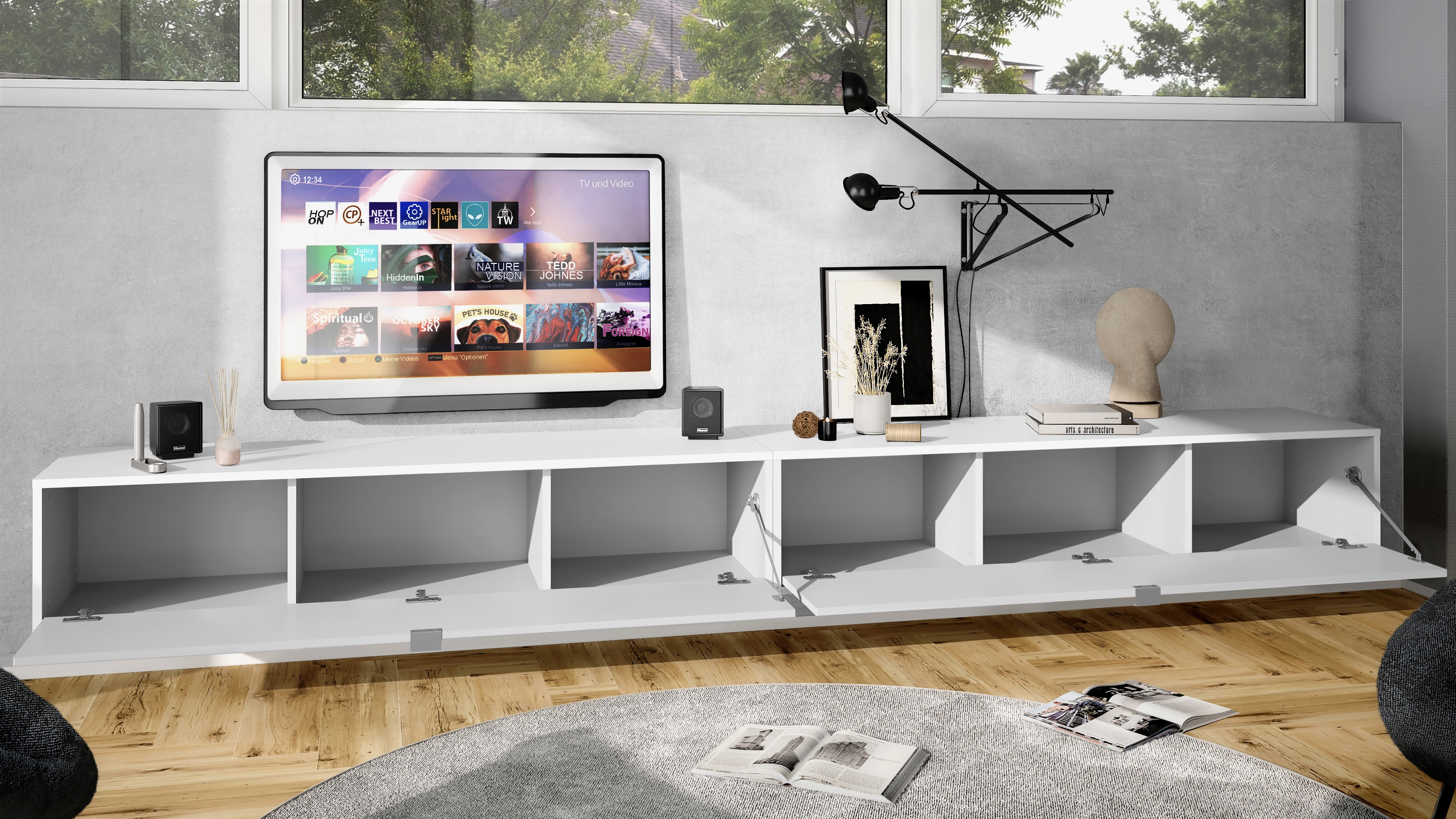 Der Korpus des TV Boards hat die Farbe Weiß matt. Um dem Möbelstück einen futuristischen Stil zu verleihen, wird es hängend an der Wand befestigt. So kann man es nahezu überall im Haus anbringen. Dies ist gerade dann praktisch, wenn auf dem Boden nicht genügend Platz für stehende Möbel verfügbar ist.