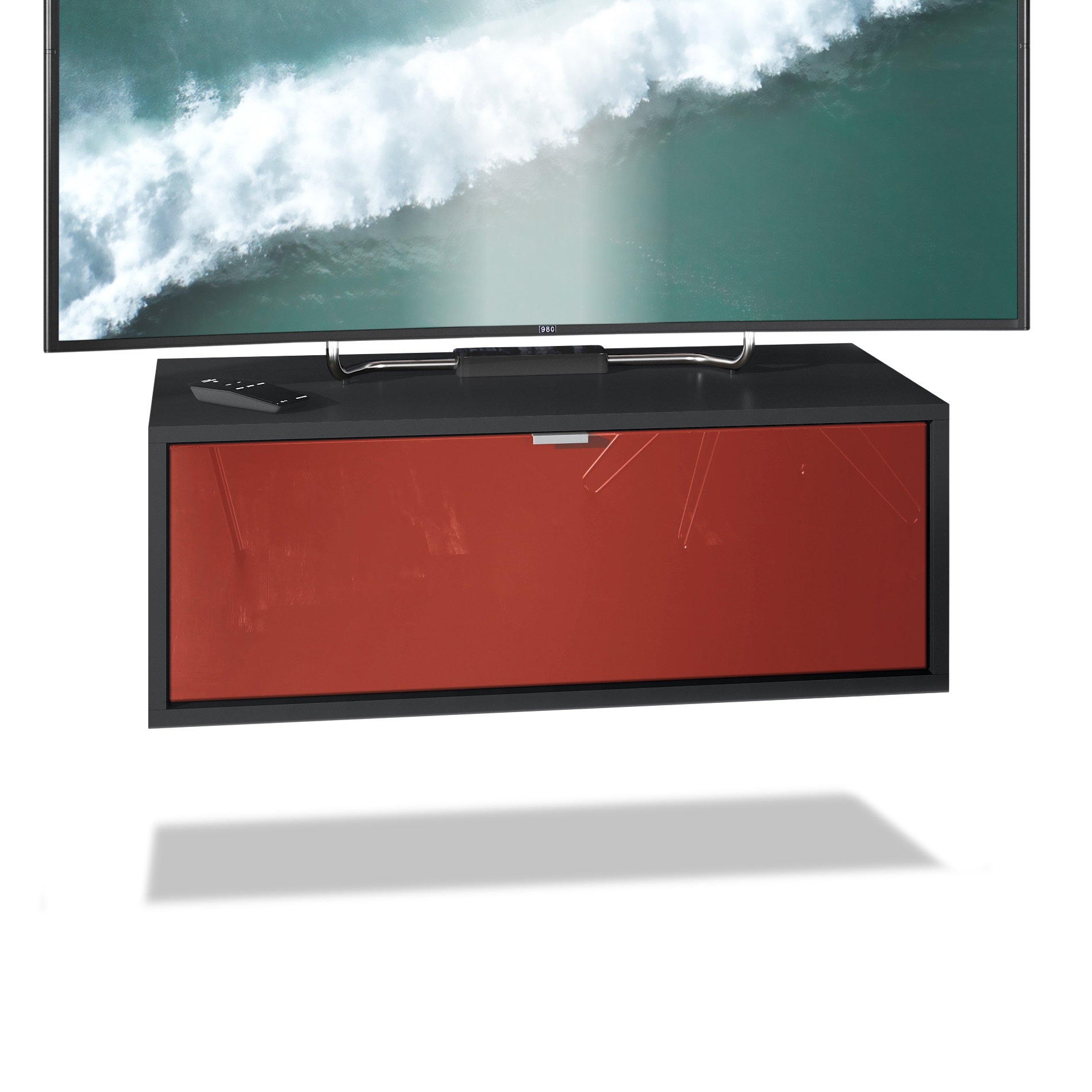 Der Korpus des TV Boards hat die Farbe Schwarz matt. Um dem Möbelstück einen futuristischen Stil zu verleihen, wird es hängend an der Wand befestigt. So kann man es nahezu überall im Haus anbringen. Dies ist gerade dann praktisch, wenn auf dem Boden nicht genügend Platz für stehende Möbel verfügbar ist.