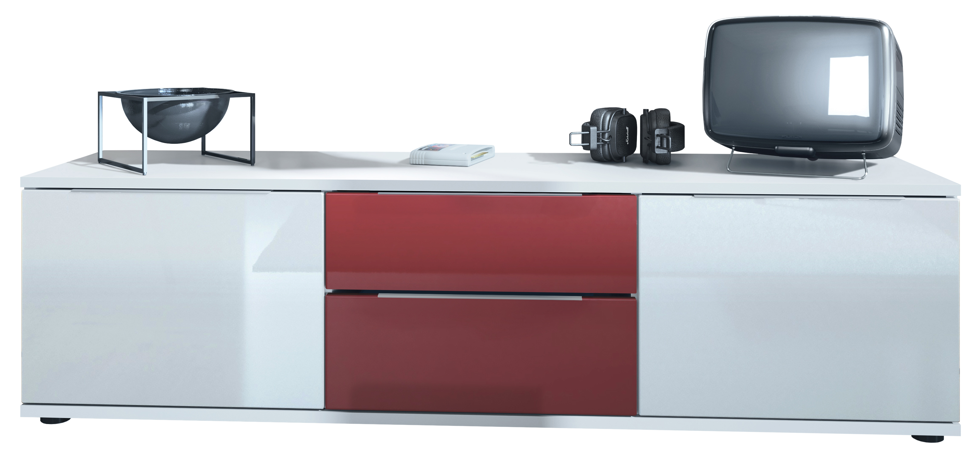 Produktinformationen "Lowboard Linio V1 mit 2 Türen und Schubladen Weiß / Bordeaux Hochglanz (138,5 x 37,5 x 35 cm)"