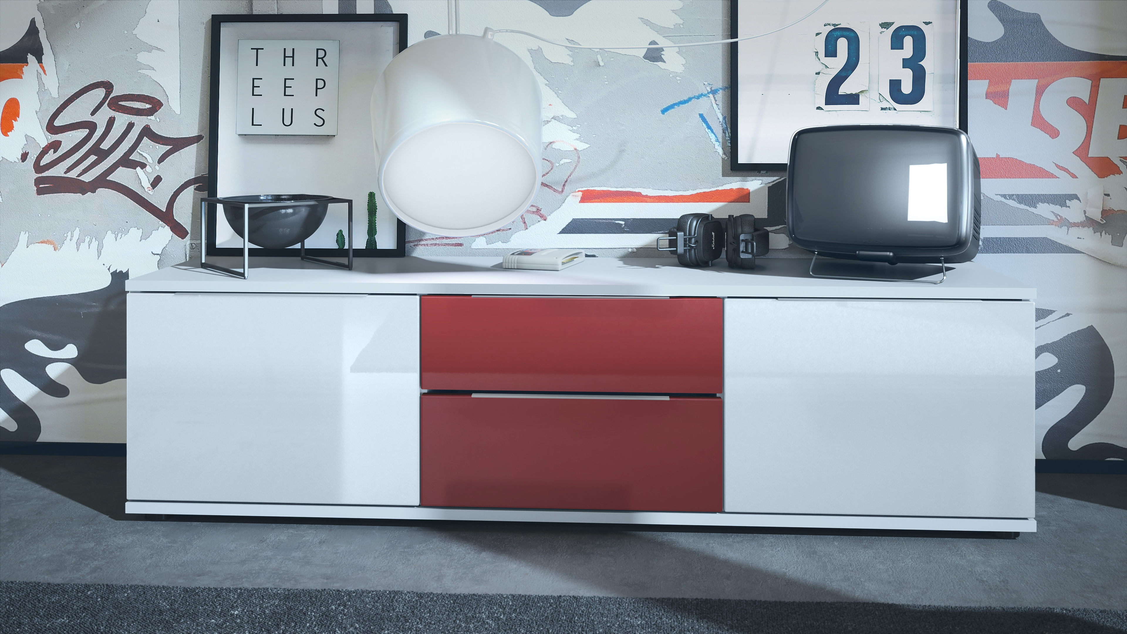 Die Türen des Möbelstücks sind aus glatten, weiß hochglänzenden MDF-Fronten gefertigt, während die Schubladen in einer Vielzahl von Farben erhältlich sind. Gestalten Sie Ihr Zuhause nach Ihren Wünschen und integrieren Sie den Fernsehtisch harmonisch in jeden Raum. Der Korpus des TV-Boards besteht aus mattweißer Spanplatte.