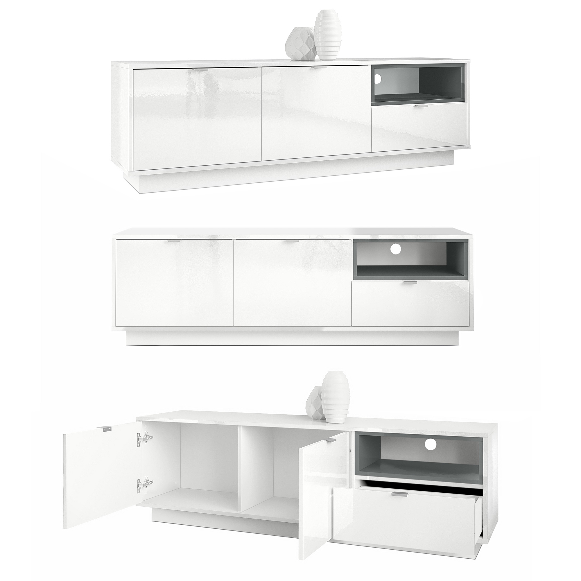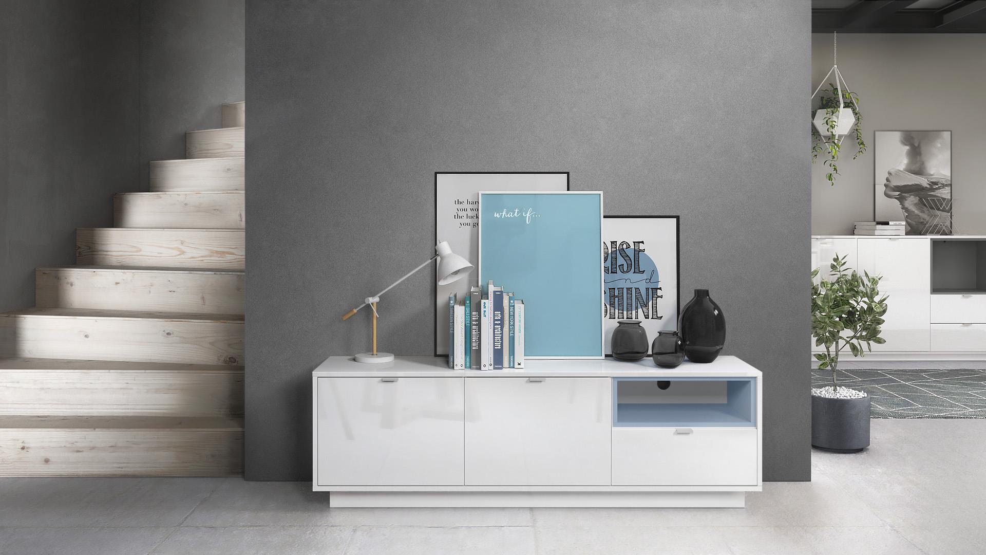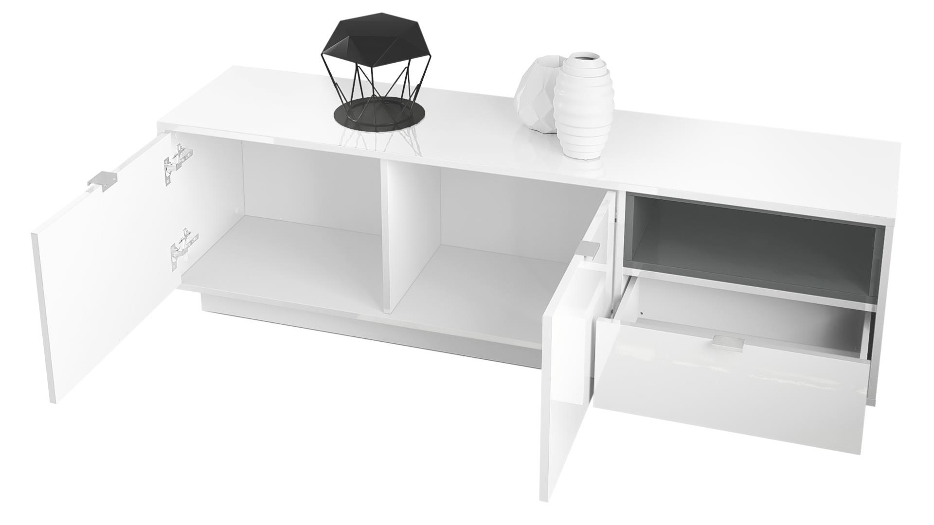 Der glänzende Korpus aus stabiler, melaminbeschichteter Spanplatte verleiht dem TV Board seine Robustheit. Ein farbiger Einsatz aus MDF setzt Deine individuelle Note, während die Türen mit Softclose-Scharnieren sanft schließen. Die Design-Griffe aus hochwertigem Aluminium verleihen dem Möbelstück eine edle Note. Perfekt abgestimmte gedämpfte Unterflurlaufschienen aus Metall sorgen für eine reibungslose Schubladenbewegung.