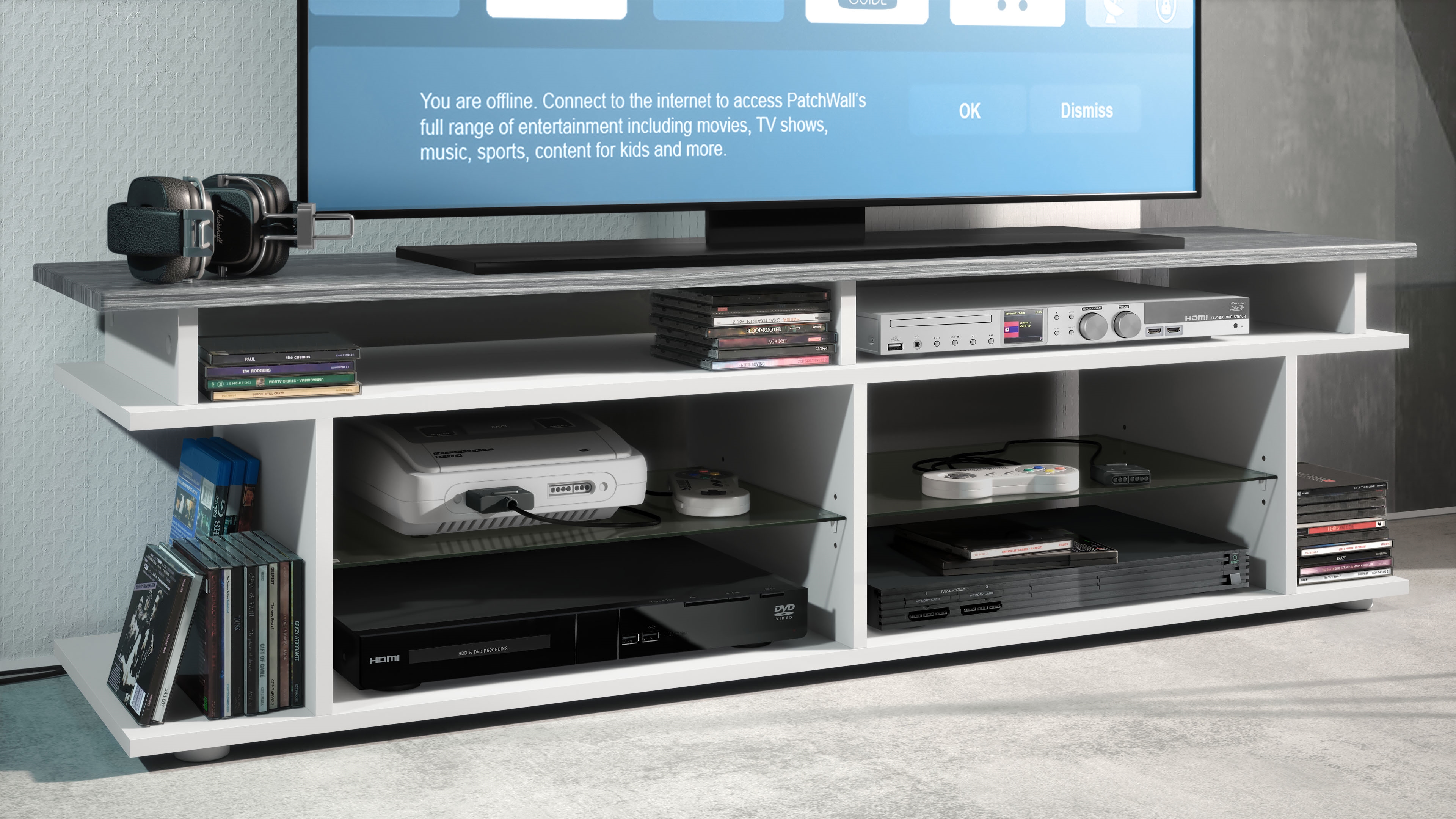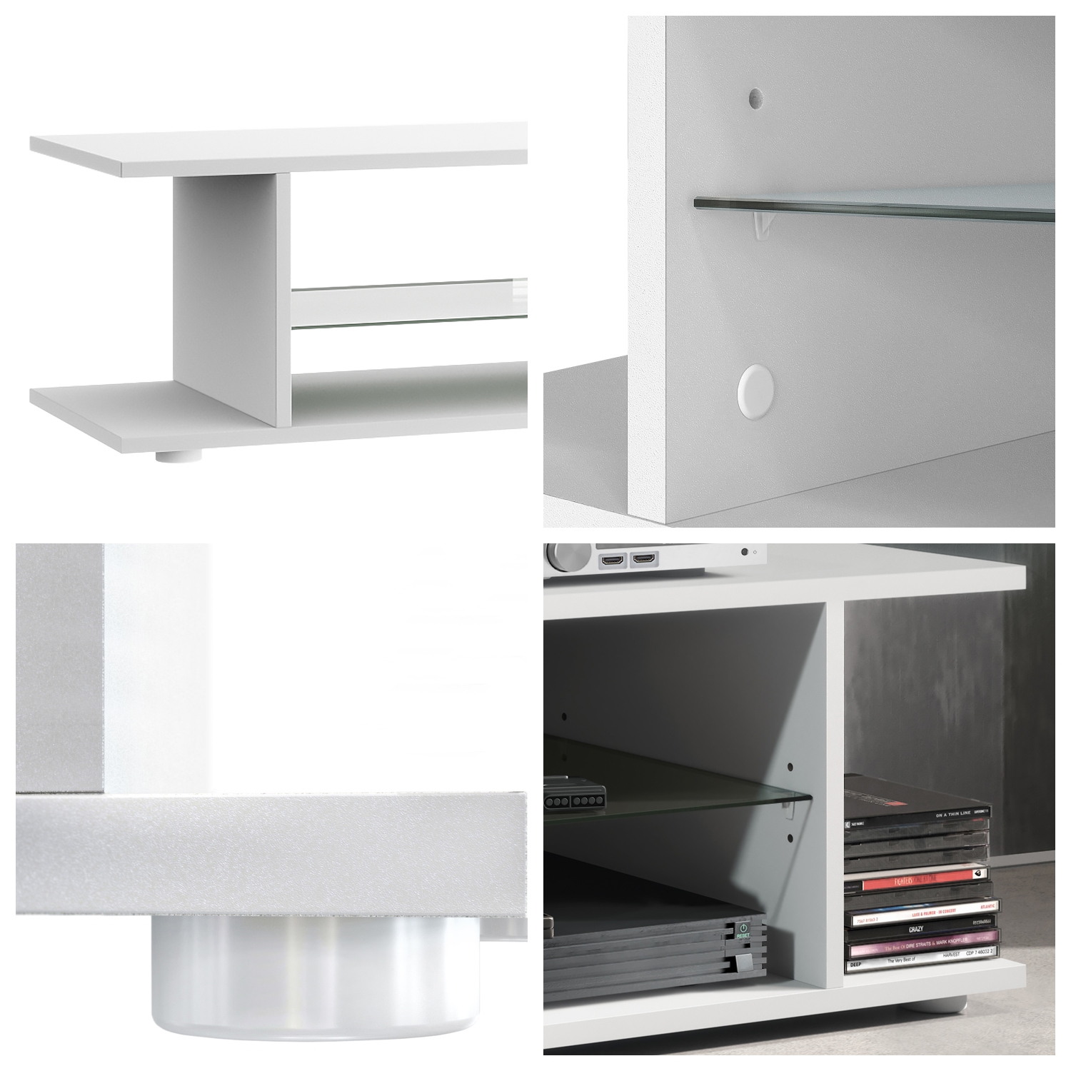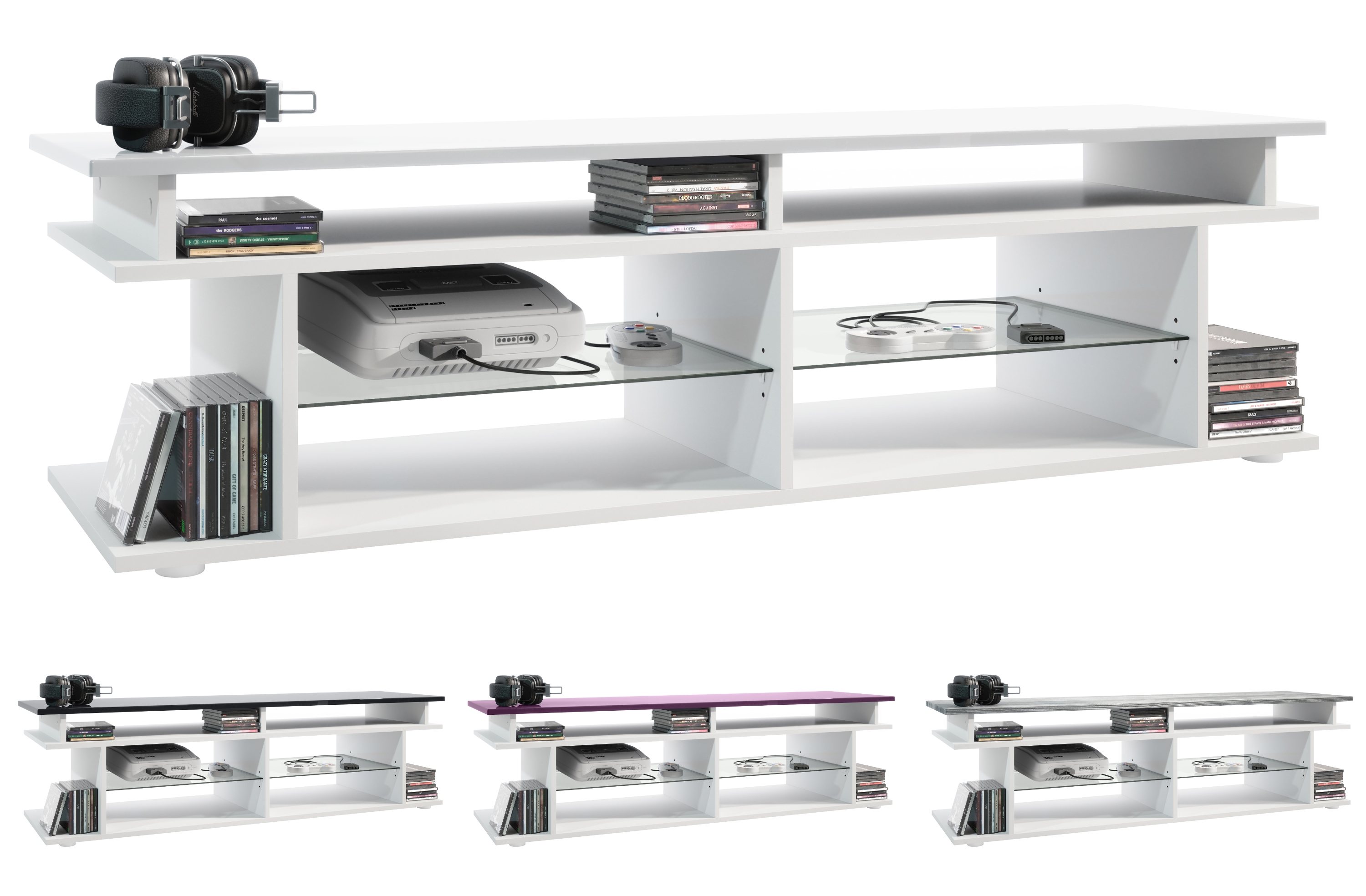 Das TV Board Movie V3 passt mit seinem lockeren, minimalistischen Design in jedes Wohnzimmer. Es besteht aus vier offenen Fächern mit zwei Glaseinlegeböden und zwei seitlichen Fächern. Der Korpus (Ober- und Unterboden, Mittelboden und Seiten) ist Weiß matt.