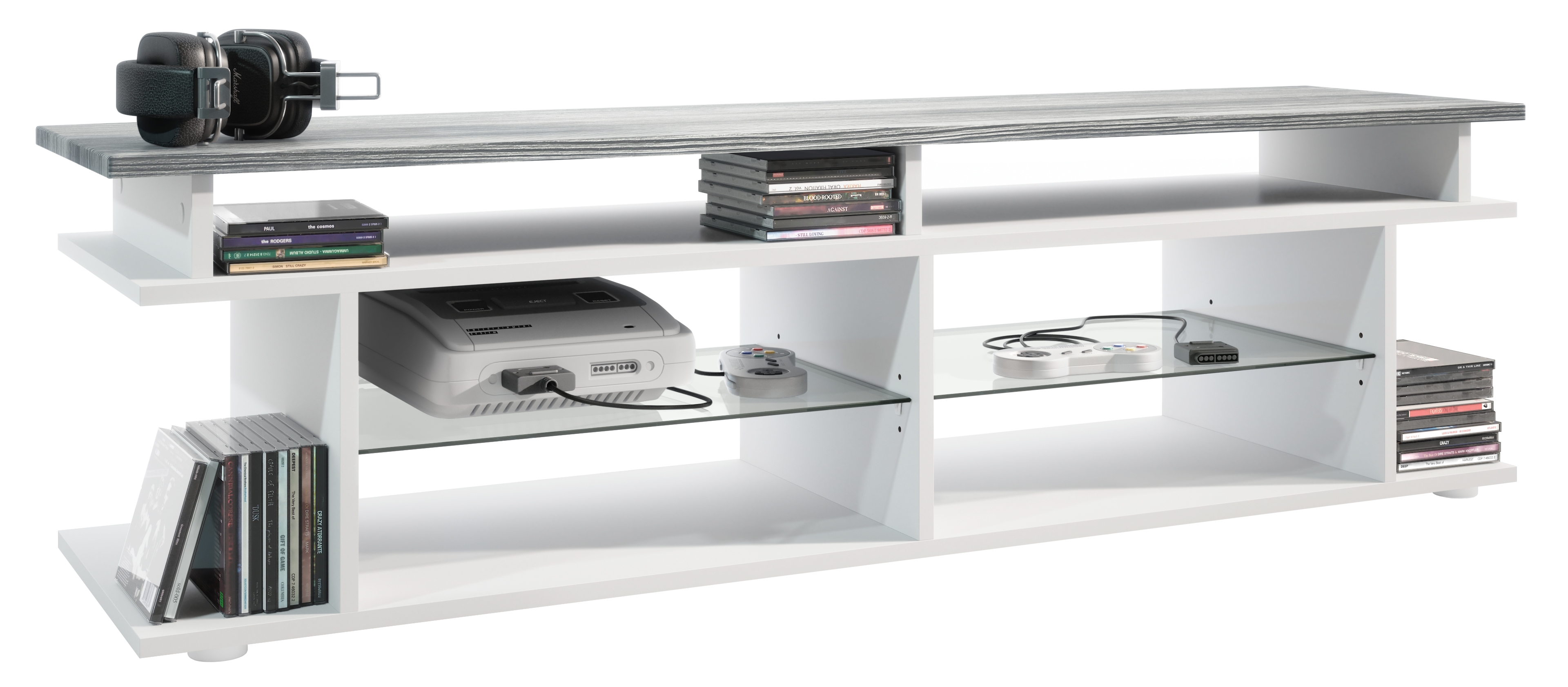 Die zwei seitlichen Fächer befinden sich hinter der rechten und linken Blende. Sie sind optimal zum Verstauen von Blu-Rays, DVDs oder auch Fernsehzeitschriften und Büchern geeignet. Damit Receiver, Fernseher und Spielekonsolen ohne Probleme angeschlossen werden können, wurde auf eine Rückwand gänzlich verzichtet. Durch die fehlende Rückwand wird außerdem gewährleistet, dass Spielekonsolen genug Belüftung erhalten und nicht unnötig heiß laufen, wie es in einem geschlossenen TV-Board der Fall wäre.