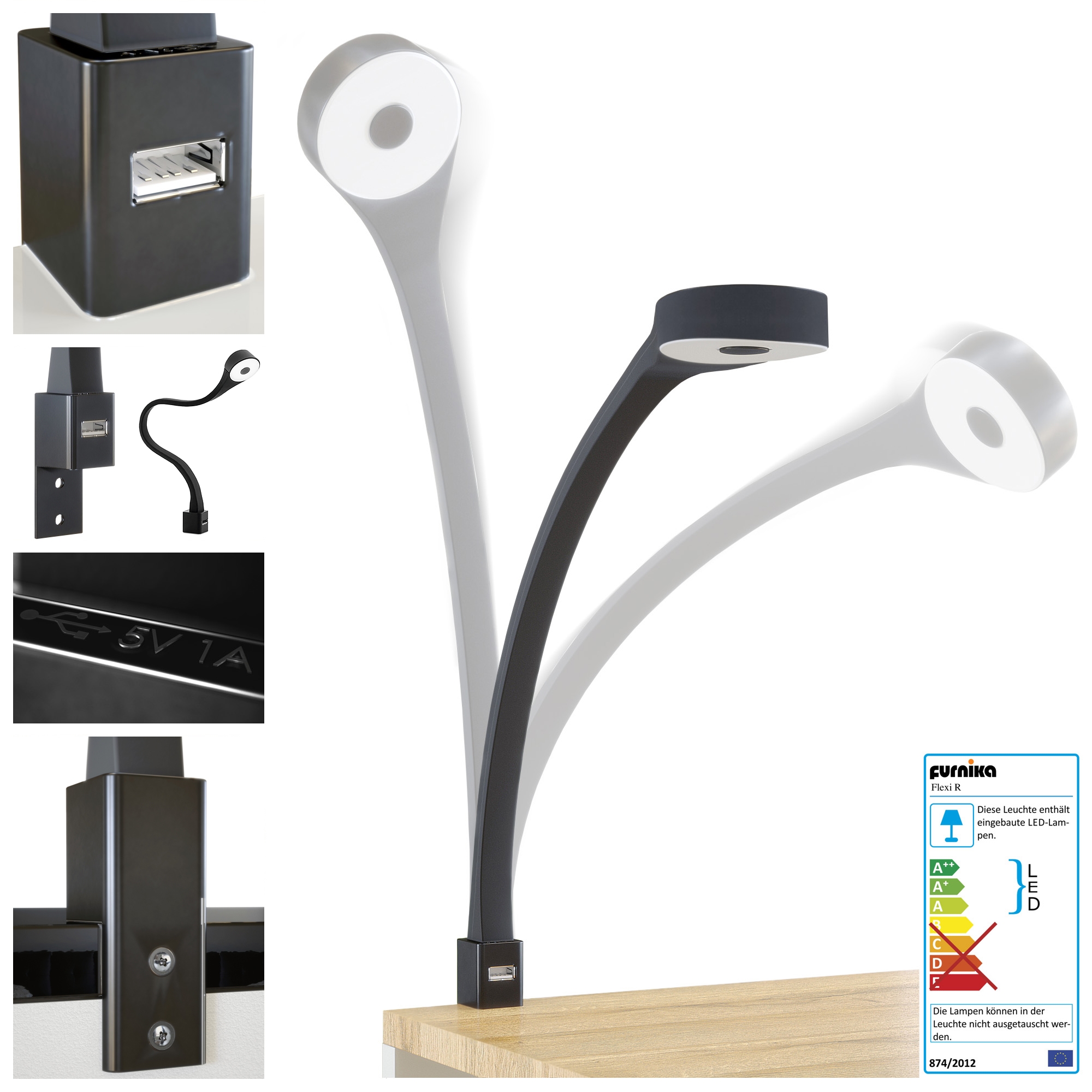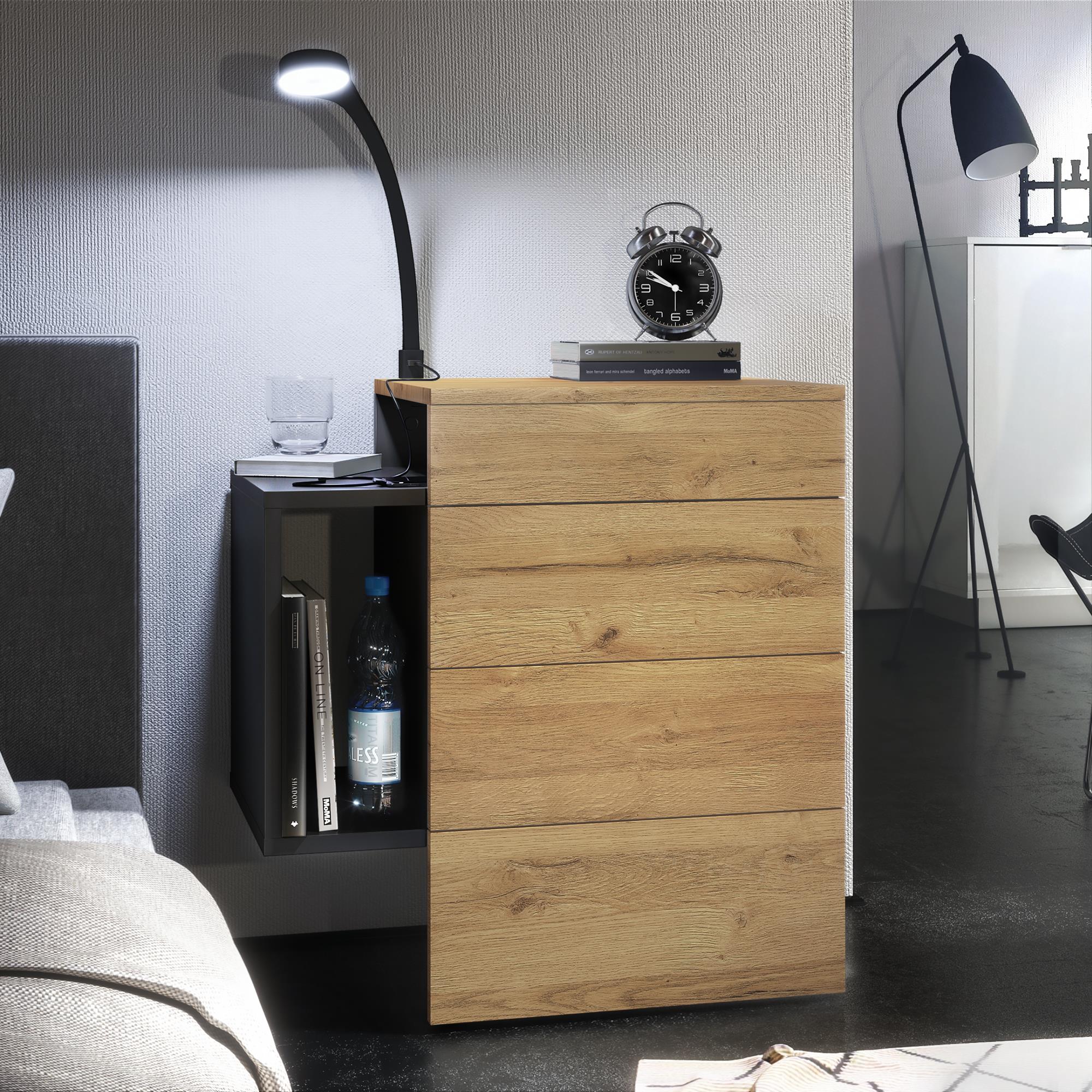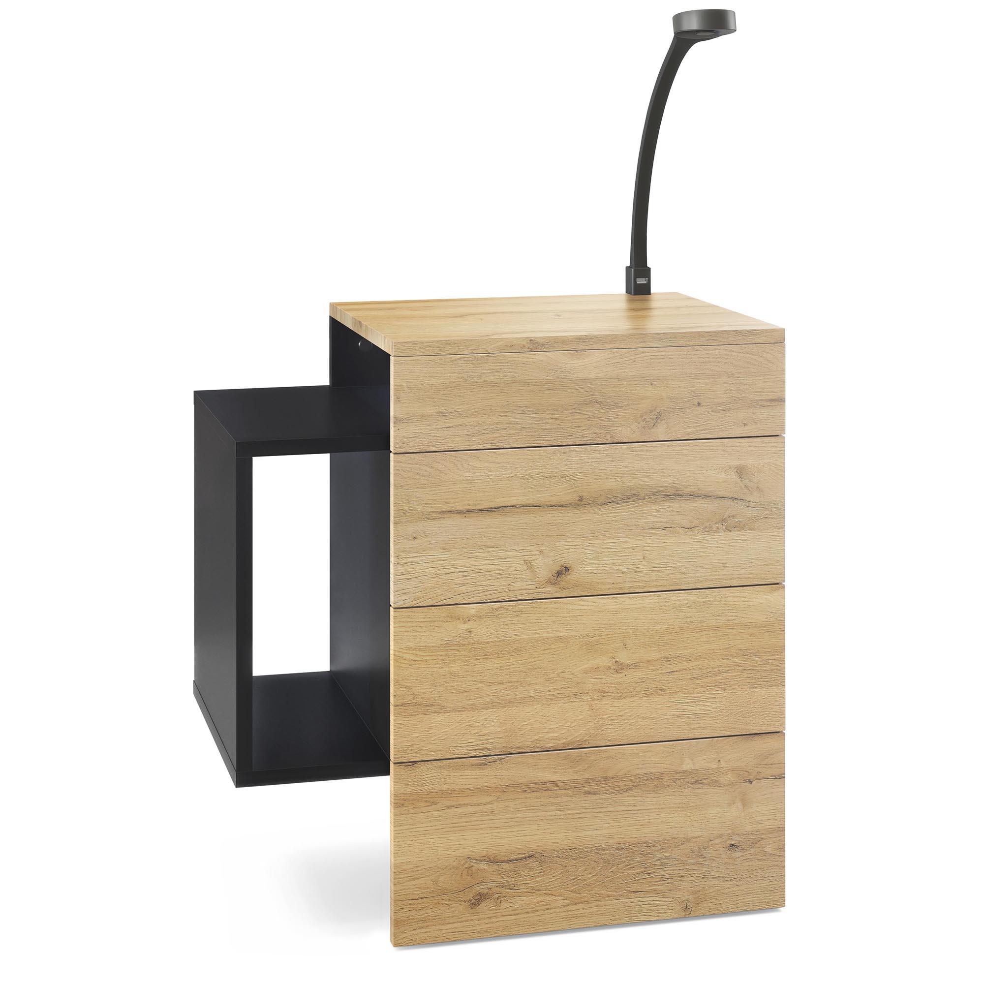 Produktinformationen "Nachttisch Queens und 1 seitlichem Fach zur Wandmontage Schwarz matt/Eiche Natur inkl. LED Flexi Lampe (60 x 63 x 36 cm)"
