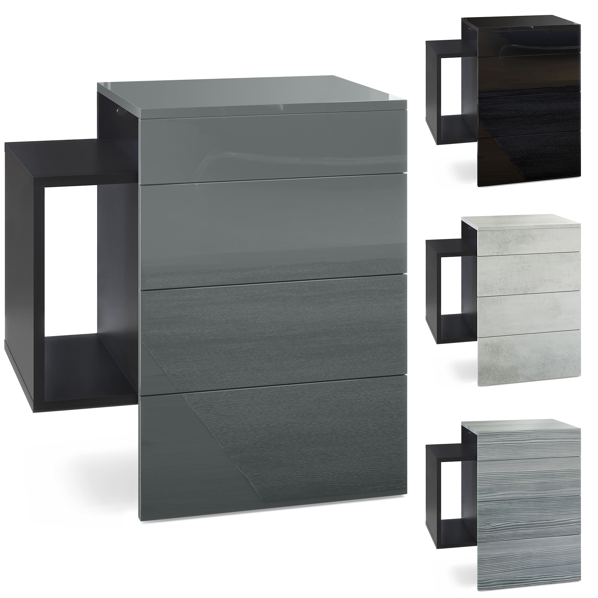 Durch das schlichte, moderne Design lässt sich das Nachtschränkchen mit vielen verschiedenen Einrichtungsstilen kombinieren und sowohl im Schlafzimmer beispielsweise als Nachtkästchen neben dem Boxspringbett, als auch in anderen Wohnräumen, z.B. als Beistelltisch oder Telefontisch, einsetzen. Für eine besondere Eleganz sorgen die Fronten des Nachtkastens, erhältlich in vielen verschiedenen Farbvarianten, die Ihnen eine Vielzahl an Kombinationsmöglichkeiten bieten. Durch die Oberflächenbeschichtung erhalten Sie ein besonders pflegeleichtes Produkt. Für die Reinigung können Sie auf Chemie verzichten - es reicht ein leicht angefeuchtetes Tuch, um die wasserfeste Oberfläche angemessen zu reinigen.