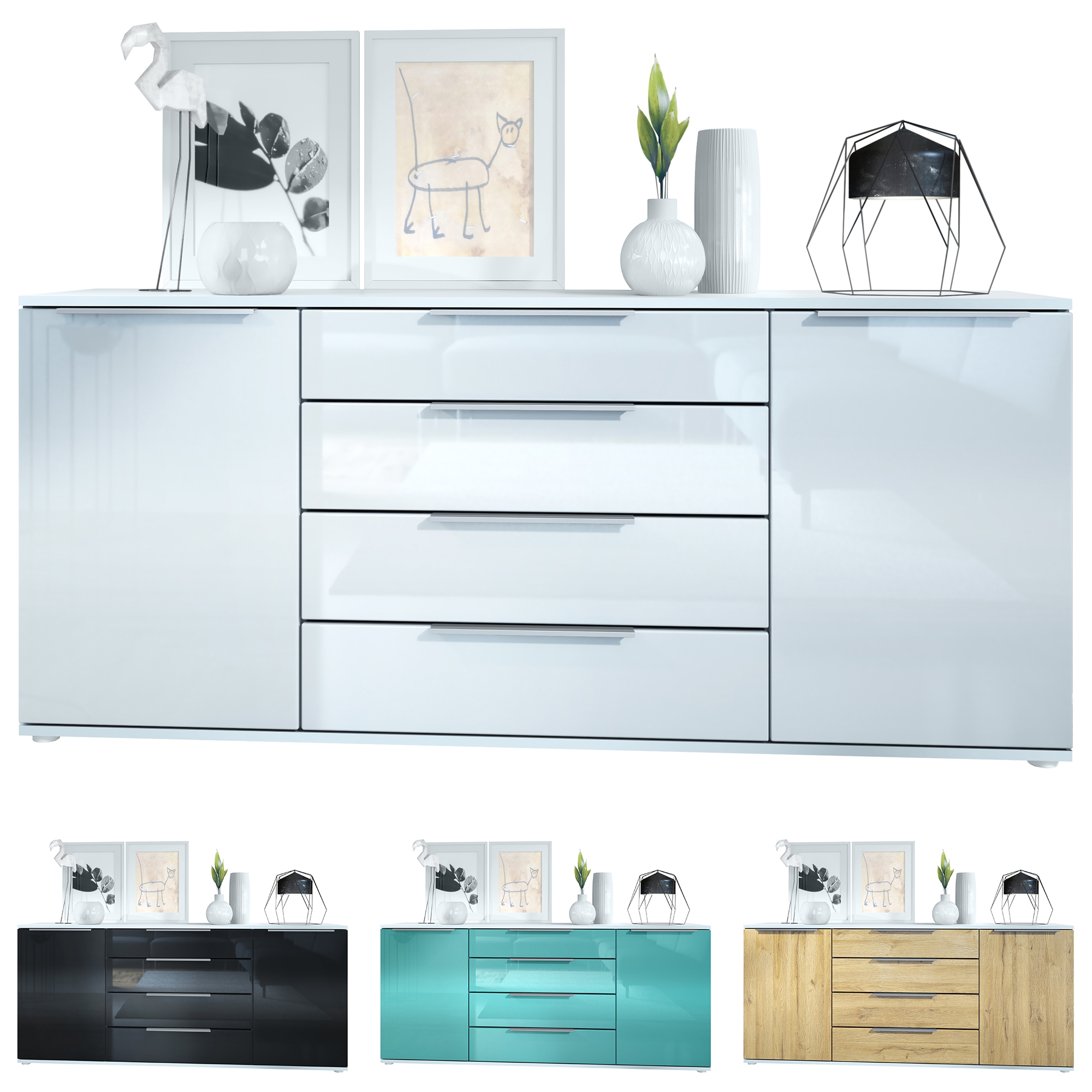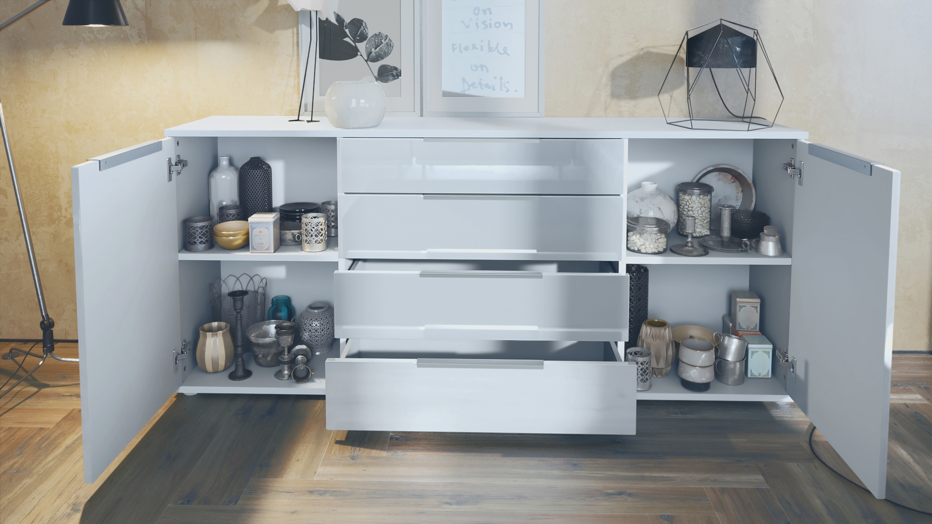 Im Aufbau und der Handhabung ist dieses Möbelstück äußerst benutzerfreundlich und spart nicht an Flächen für Stauraum: Hinter zwei Türen und vier Schubladen finden sich insgesamt 8 großflächige Möglichkeiten, diverse Gegenstände vor neugierigen Augen zu verstecken und in der Wohnung die gewünschte Ordnung wiedereinkehren zu lassen. Verstaue hier z.B. Bücher, Zeitschriften, Ordner, Dekorationsgegenstände, Blu-rays, Multimedia-Geräte oder jegliche andere Objekte deiner Wahl.