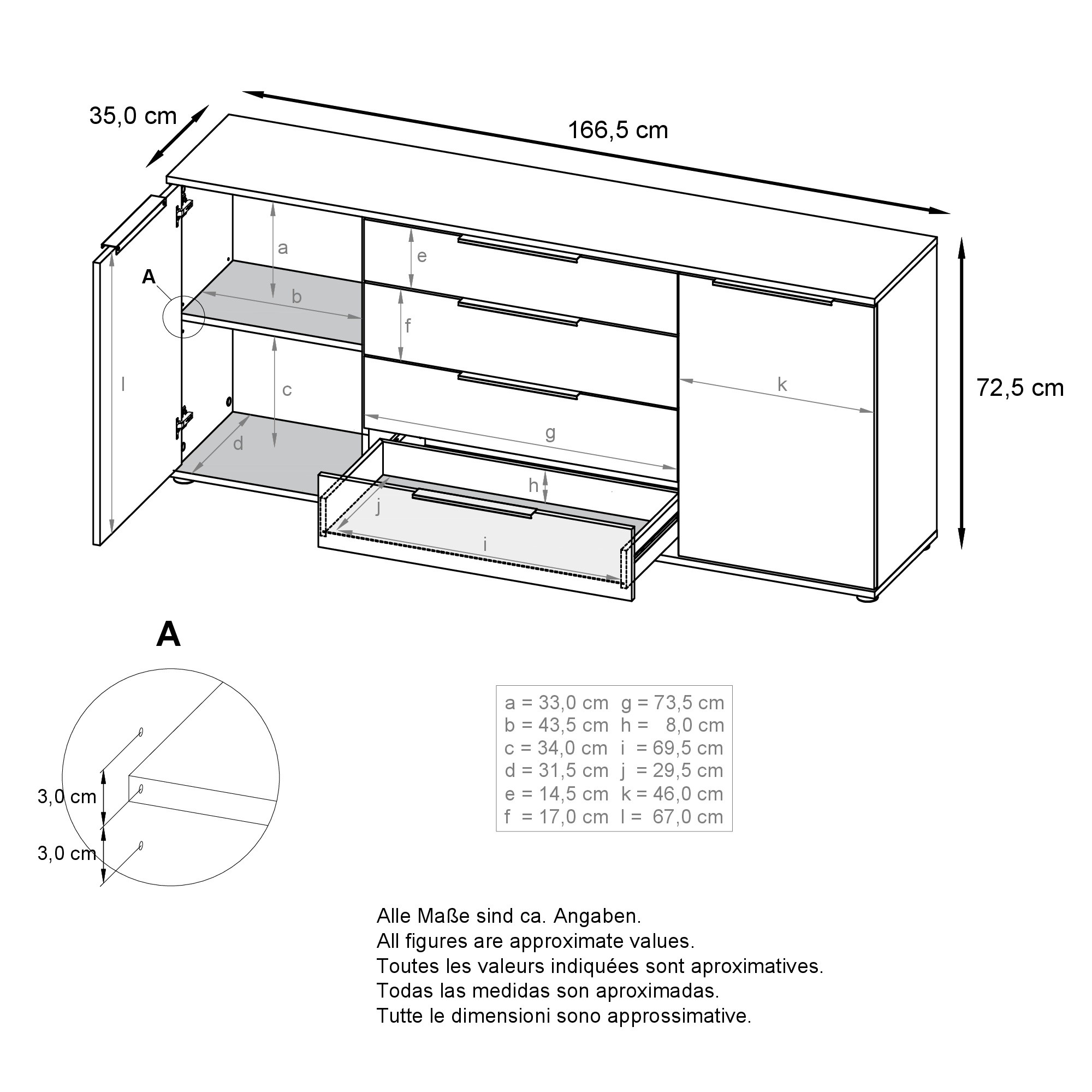 Maße des Sideboards ca. (BxHxT): 166,5 x 72,5 x 35 cm.