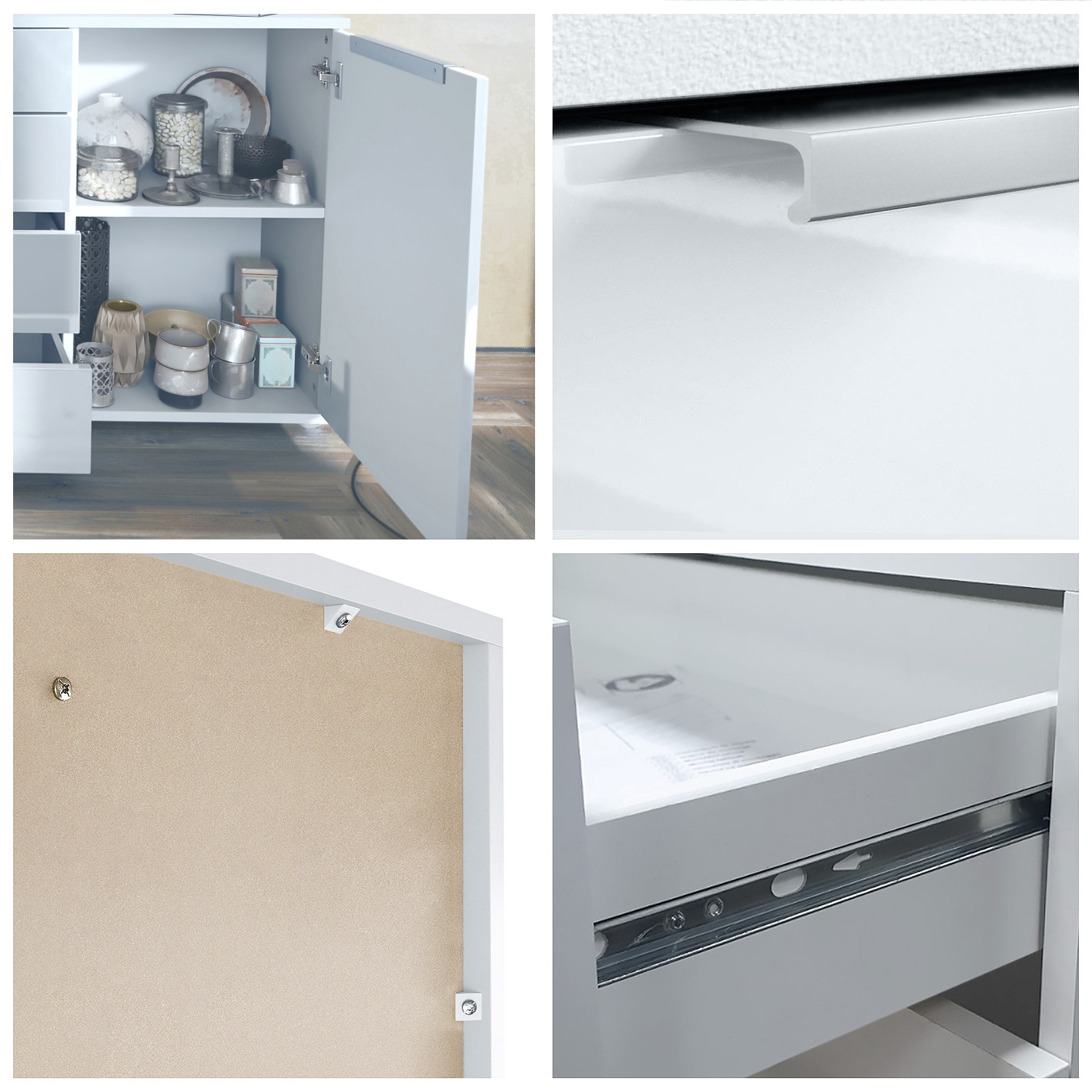 Die Schubkästen laufen auf kugelgelagerten Metallführungen, welche durch ihre Ausdauer für sowohl Stabilität als auch Langlebigkeit des Sideboards sorgen. Auch das im Lieferumfang enthaltene Montagezubehör ist aus Metall, wodurch eine sichere und stabile Montage gewährleistet werden kann.