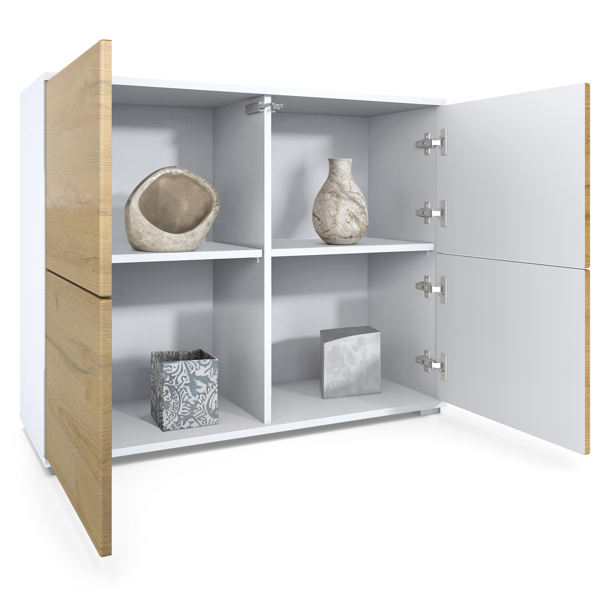 Ob als modernes Sideboard im Wohnzimmer, Kommodenschrank für‘s Schlafzimmer, Anrichte im Flur oder als Küchenschrank in der Küche - die geräumige Kommode Rova V3 präsentiert sich als praktisches Möbelstück mit modernem Design, hergestellt in Deutschland. Der Beistellschrank ist mit 4 Türen ausgerüstet. Hinter den Türen befindet sich jeweils 1 geräumiges Fach. Die Türen sind mit unserem Push-to-Open-System ausgestattet. Eine Rückwand in Holzoptik aus Hartfaserplatten ist im Lieferumfang enthalten.