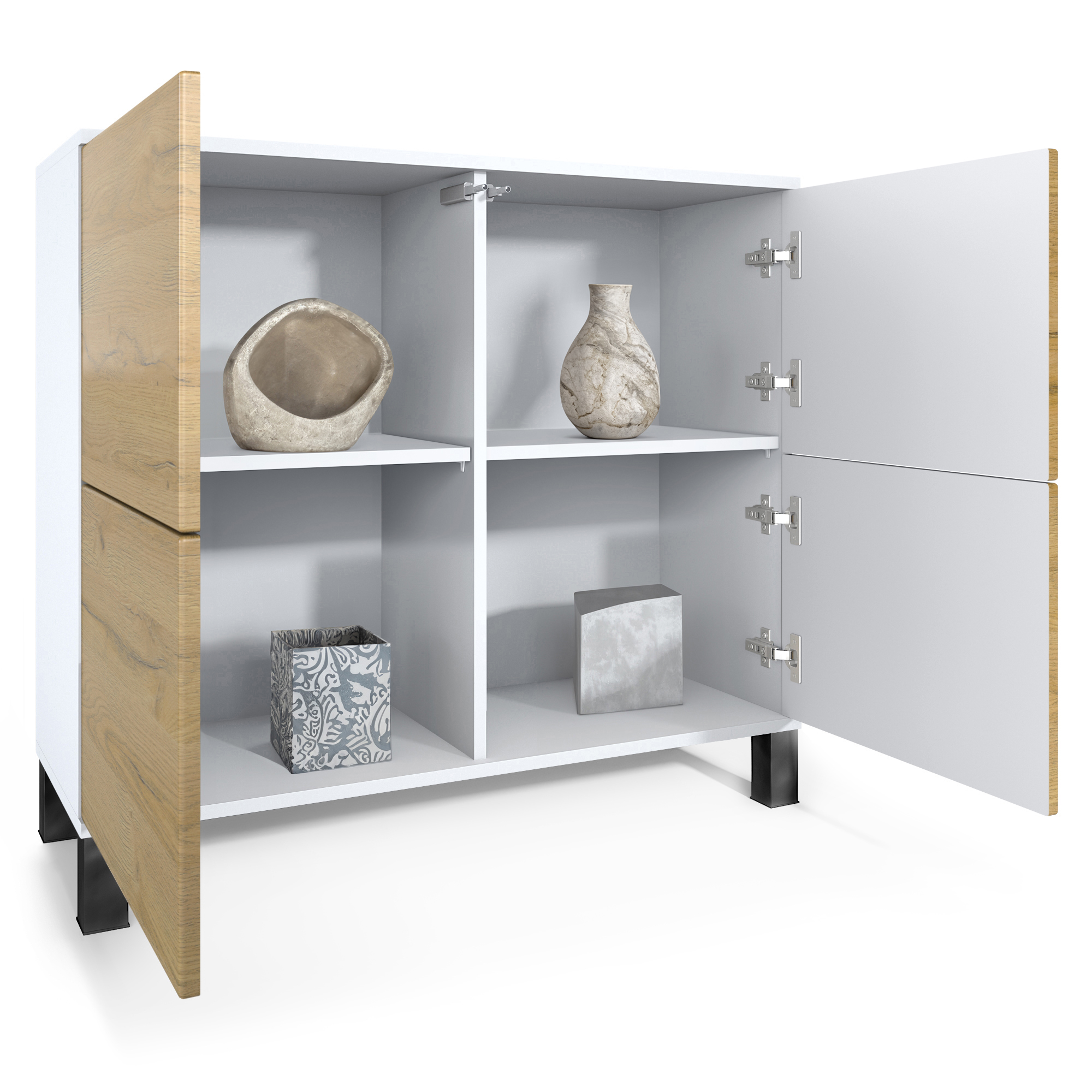 Ob als modernes Sideboard im Wohnzimmer, Kommodenschrank für‘s Schlafzimmer, Anrichte im Flur oder als Küchenschrank in der Küche - die geräumige Kommode Rova V3 präsentiert sich als praktisches Möbelstück mit modernem Design, hergestellt in Deutschland. Der Beistellschrank ist mit 4 Türen ausgerüstet. Hinter den Türen befindet sich jeweils 1 geräumiges Fach. Die Türen sind mit unserem Push-to-Open-System ausgestattet. Eine Rückwand in Holzoptik aus Hartfaserplatten ist im Lieferumfang enthalten.