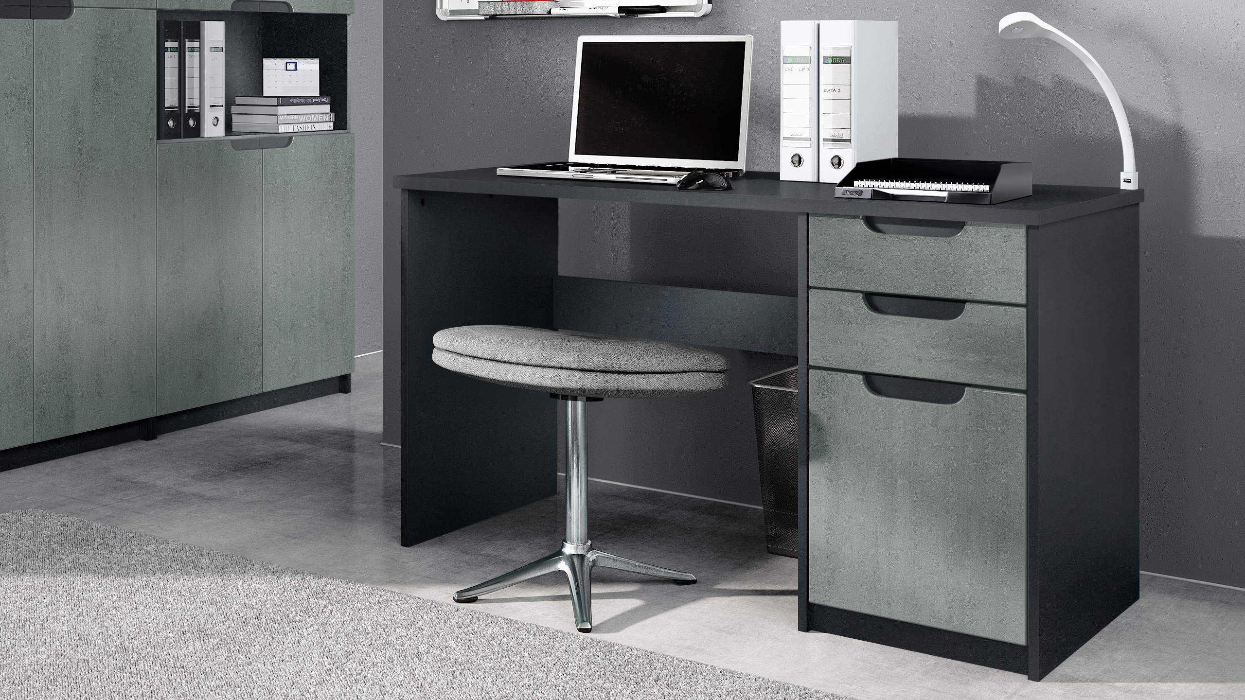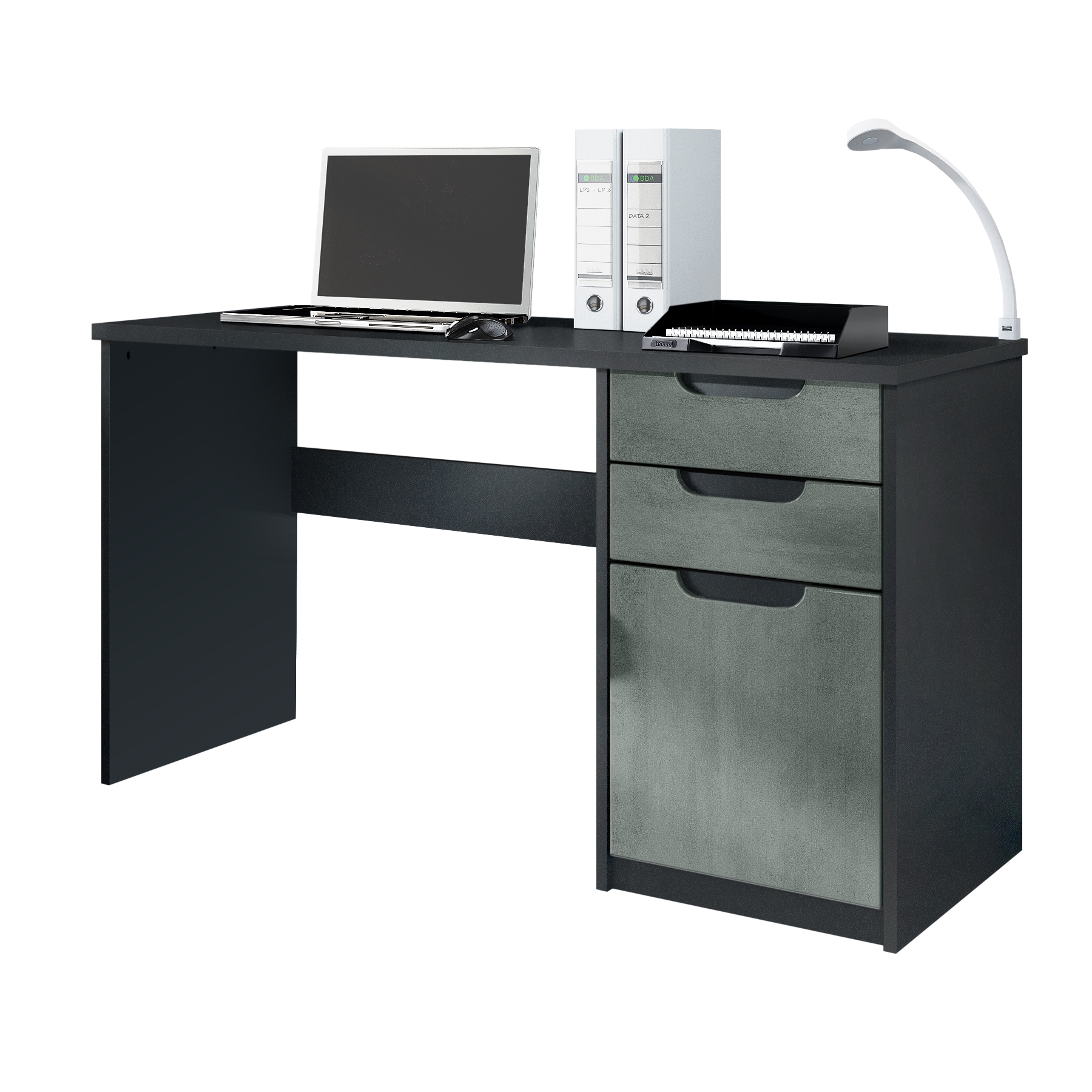 Produktinformationen "Schreibtisch Logan mit 2 Schubladen und 1 Tür Schwarz matt/Beton dunkel Optik (129 x 76 x 60 cm)"