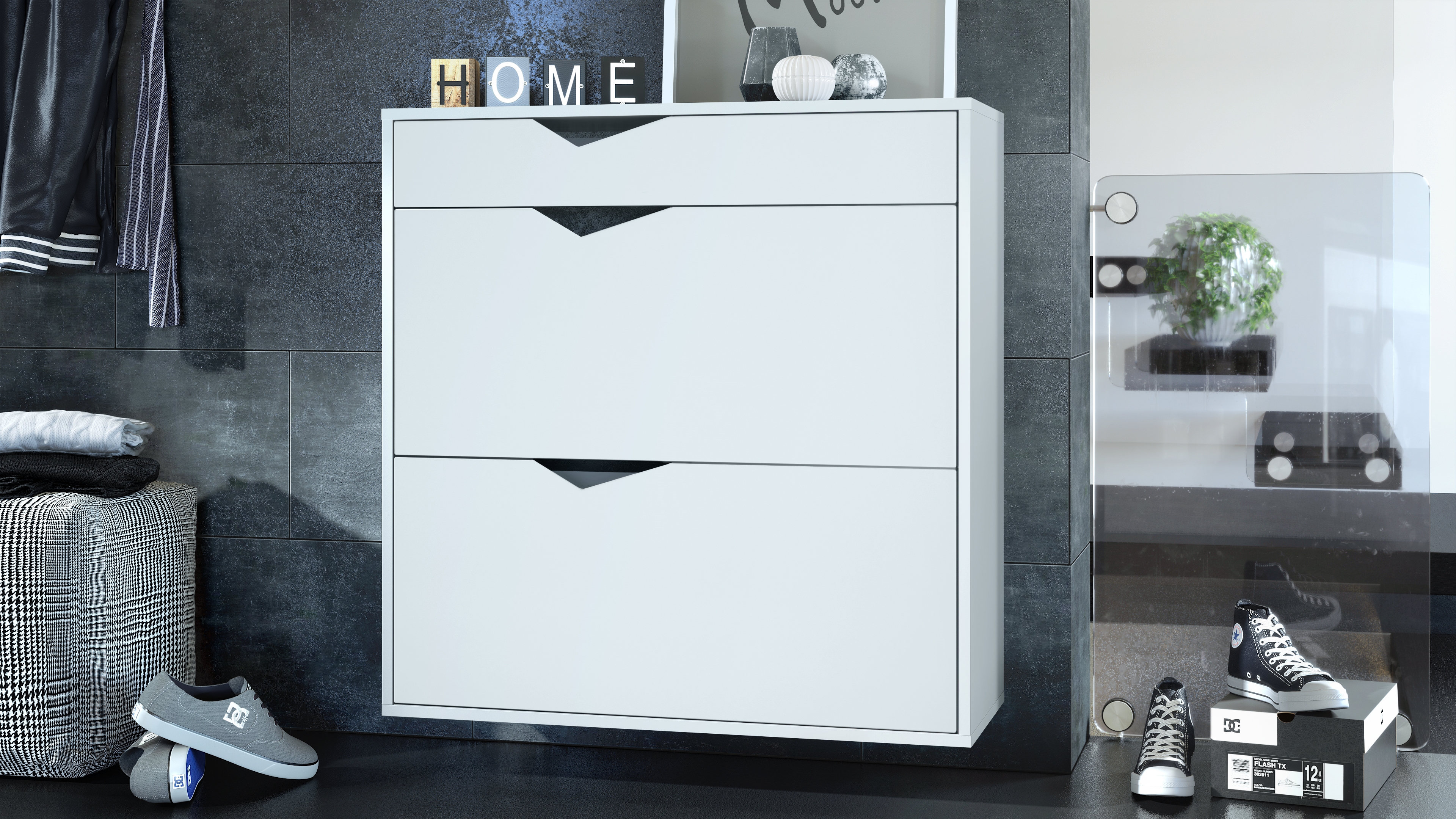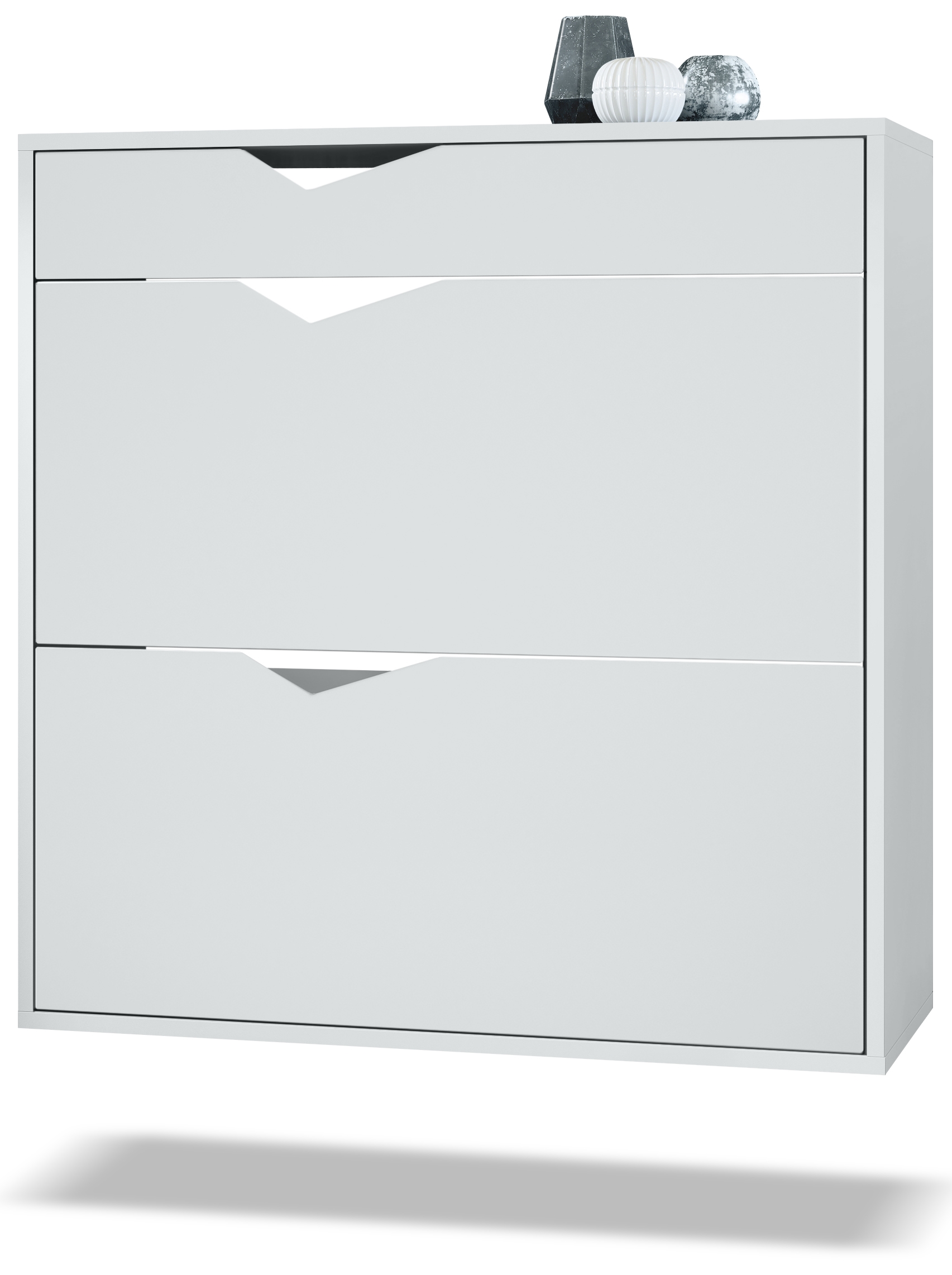 Der Korpus des Schuhschranks hat die Farbe Weiß matt. Um dem Möbelstück einen futuristischen Stil zu verleihen, wird es hängend an der Wand befestigt. Dadurch ist der Schrank kippsicher und wirkt, als würde er schweben.