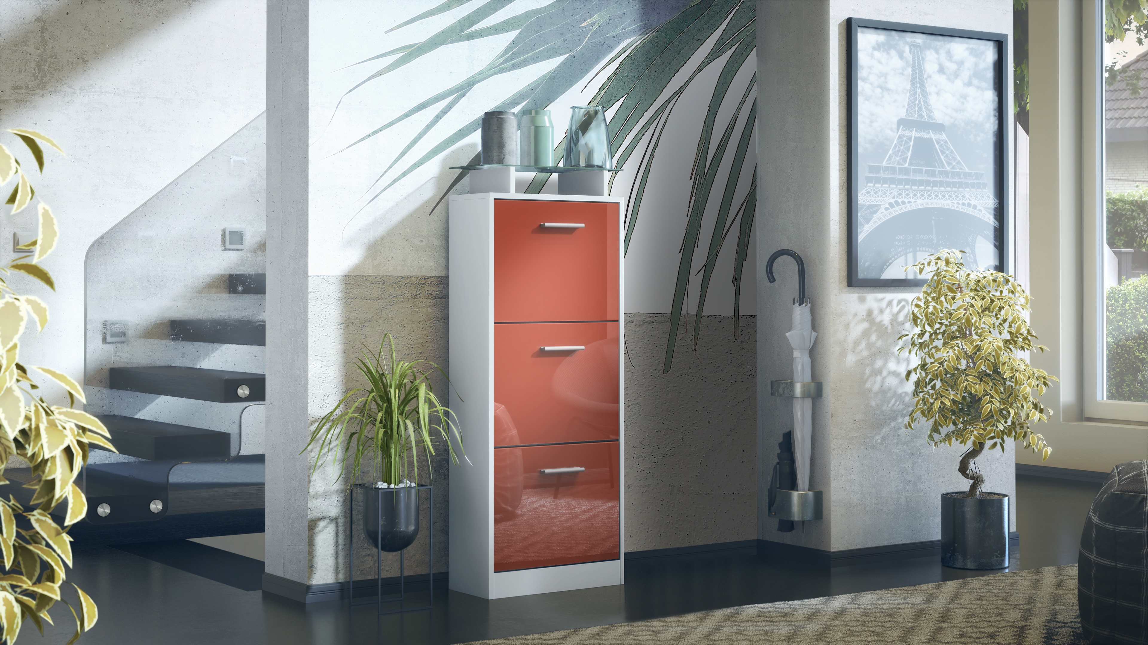 Durch das schlichte, moderne Design lässt sich der schmale Schuhschrank mit vielen verschiedenen Einrichtungsstilen kombinieren. Für eine besondere Eleganz sorgen die Fronten des Schuhkippers, die in vielen verschiedenen Farbvarianten erhältlich sind und Ihnen eine Vielzahl an Kombinationsmöglichkeiten bieten. Dank der Oberflächenbeschichtung erhalten Sie ein besonders pflegeleichtes Produkt. Zur Reinigung genügt ein leicht angefeuchtetes Tuch, um die wasserfeste Oberfläche angemessen zu säubern, ganz ohne den Einsatz von Chemie.