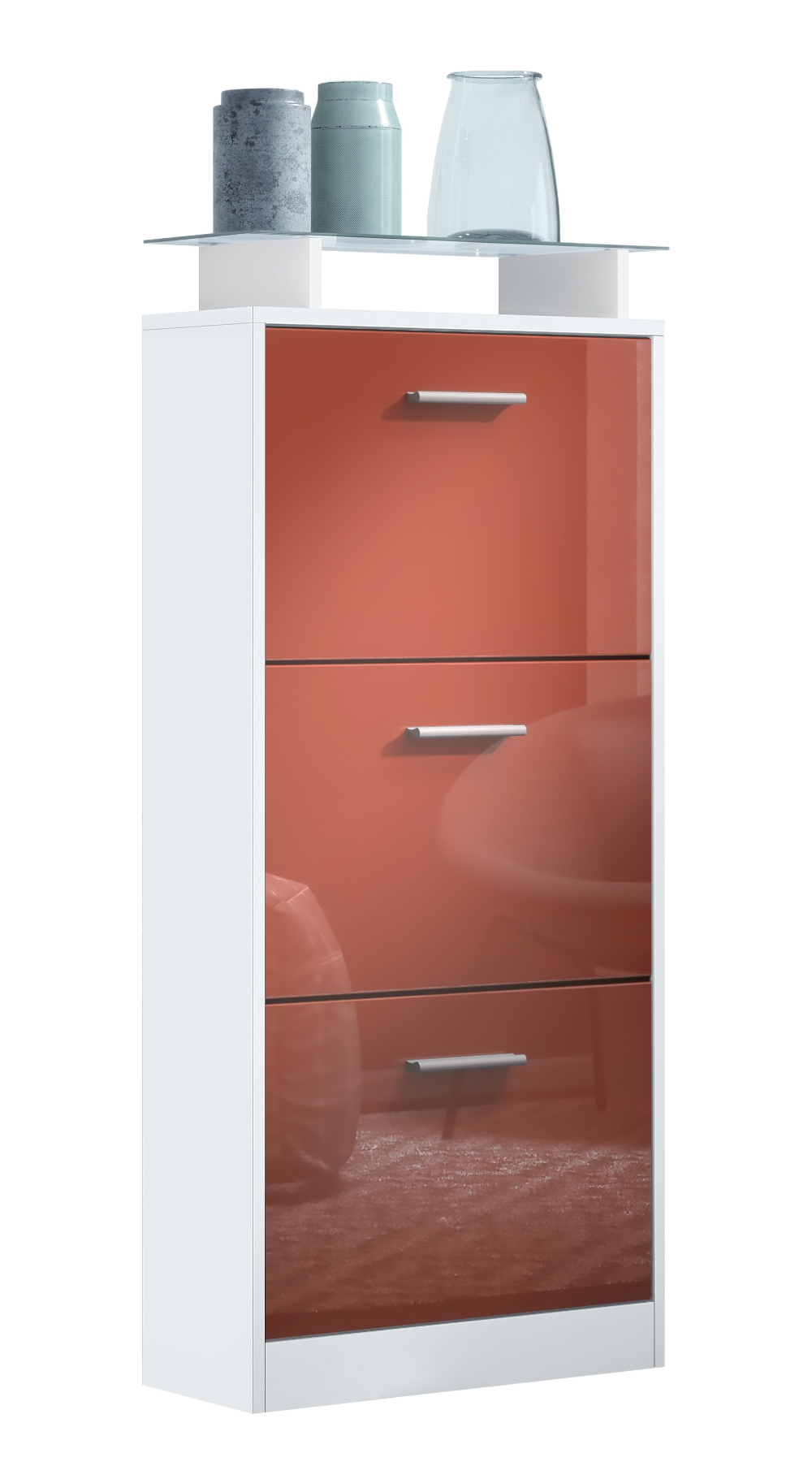 Produktinformationen "Schuhschrank Lavia V2 Weiß matt für 12 Paar Schuhe mit 3 Klappen und Glasablage Weiß matt/Bordeaux Hochglanz (46 x 128 x 23 cm)"