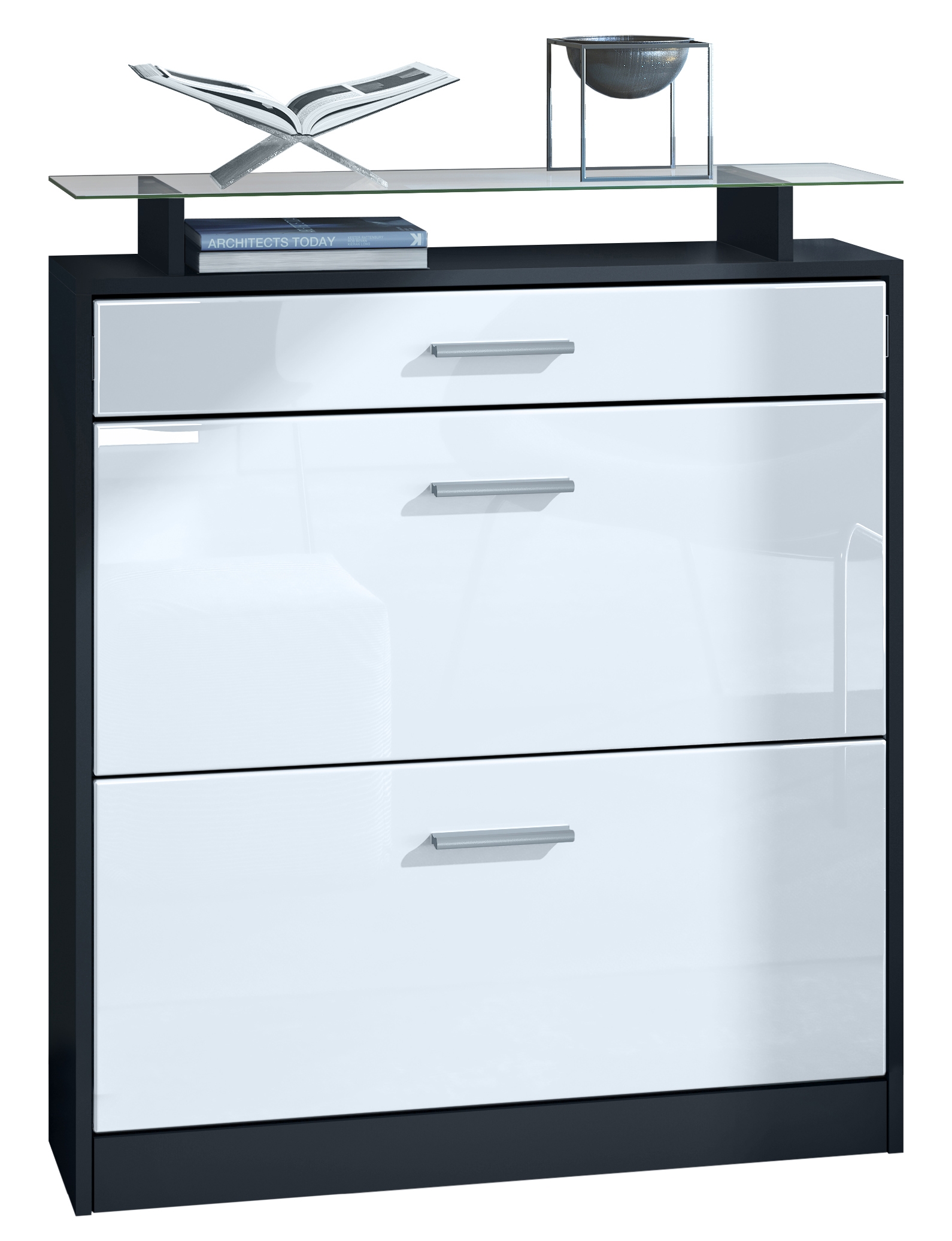 Das geräumige Schuhschregal Loret präsentiert sich als praktisches Möbelstück mit modernem Design für die Diele, hergestellt in Deutschland. Der schmale Schuhschrank ist mit zwei Schuhkippern mit doppelten Schuhhalterungen und mit einer leichtgängigen Schublade ausgerüstet. Diese verläuft dank Laufschienen aus Metall nahezu geräuschlos und sorgt für eine leichte Handhabung. Der Schuhorganizer ist mit dezenten, silbernen Griffen ausgestattet. Zusätzlich gibt es eine aufgesetzte Glasablage für den Schuhschrank. Der Glasaufsatz bietet weitere Ablagefläche und lädt zum Dekorieren ein. Mit den inkludierten Beschlägen fixieren Sie das Schuhregal für zusätzliche Sicherheit an der Wand. Eine Rückwand ist nicht enthalten.