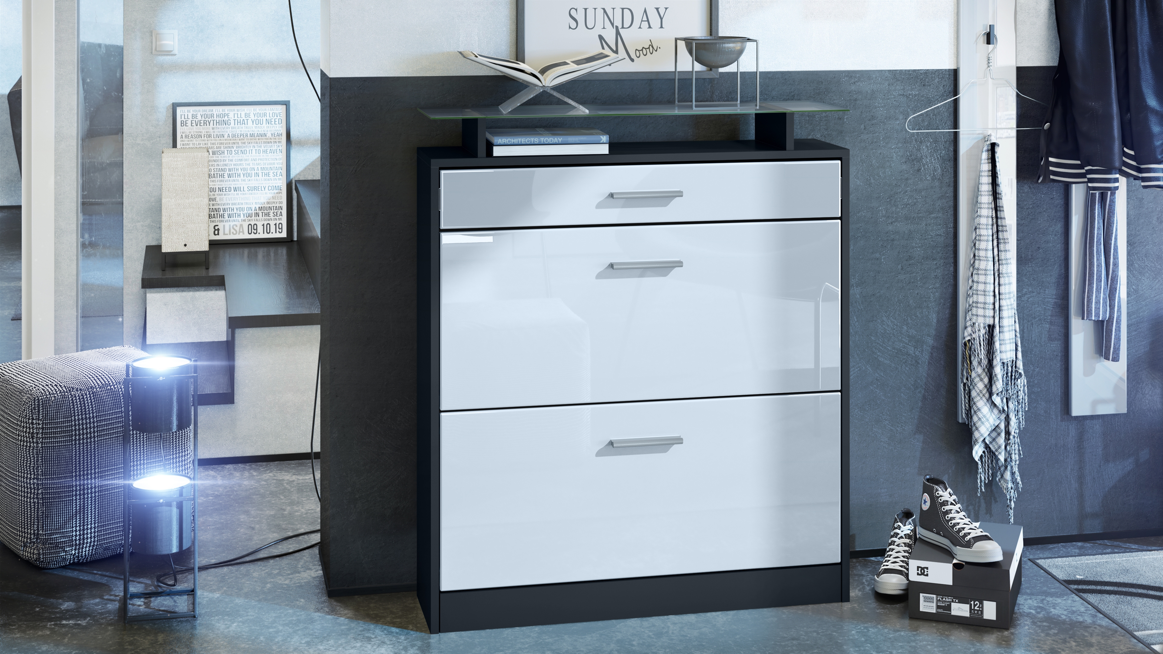 Produktinformationen "Schuhschrank Loret mit 2 Klappen und 1 Schublade und Glasablage Schwarz matt/Weiß Hochglanz (89 x 104 x 23 cm)"