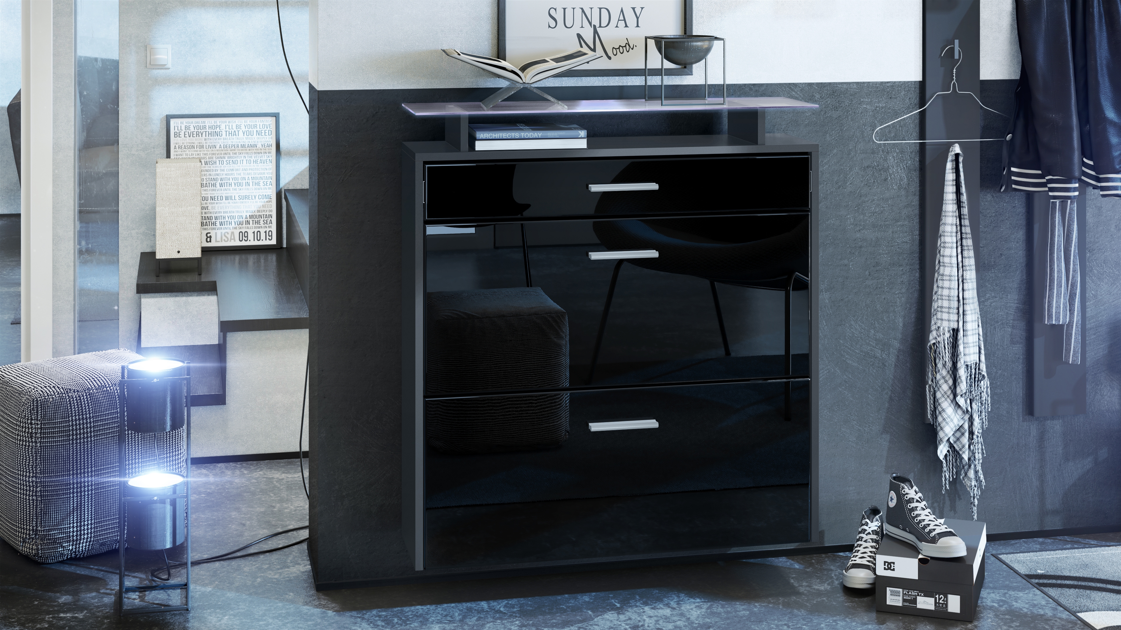 Produktinformationen "Schuhschrank Malea mit 2 Klappen und 1 Schublade und Glasablage Anthrazit matt/Schwarz glänzend, mit Beleuchtung weiß(89x96x23 cm)"