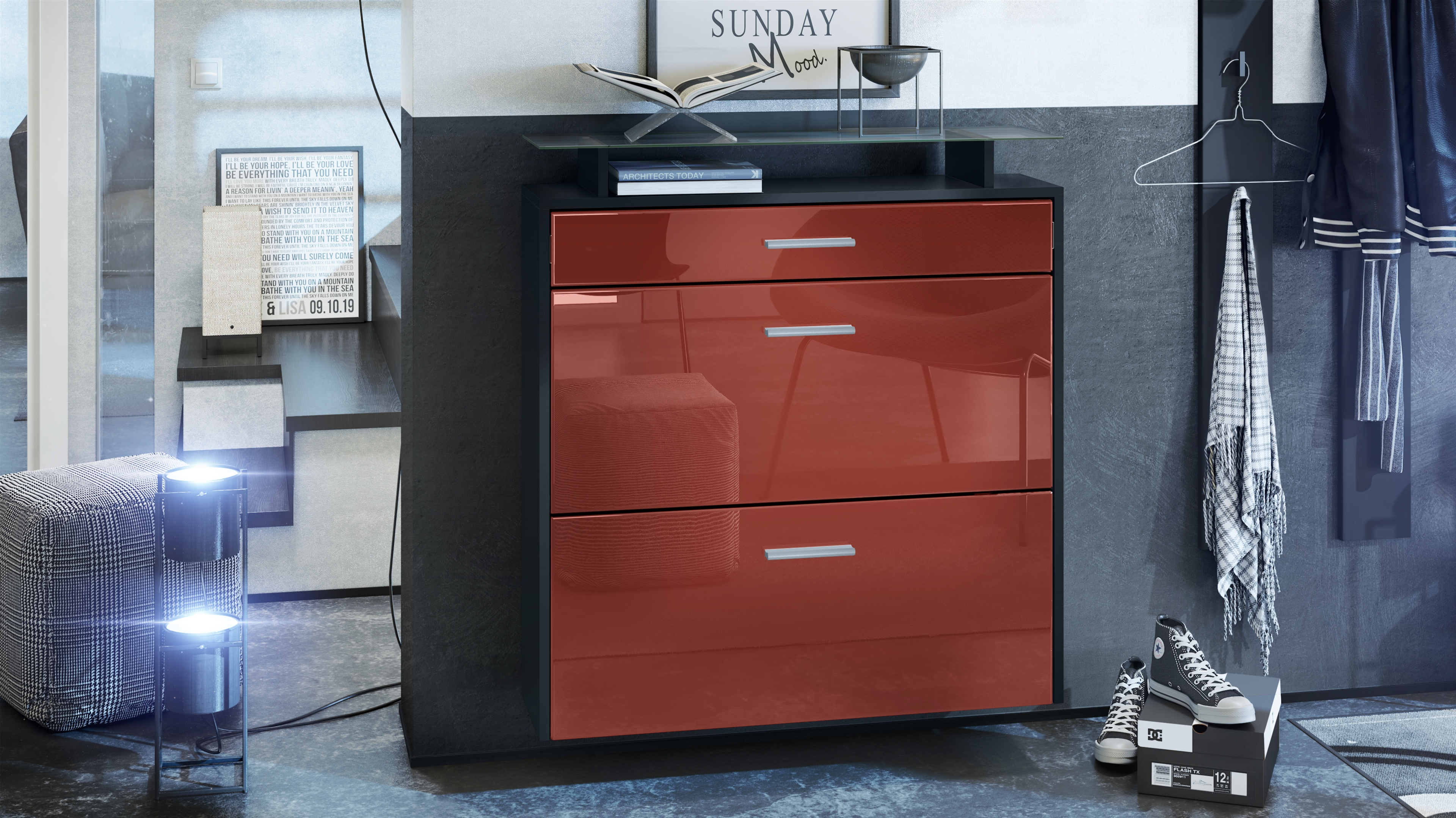 Produktinformationen "Schuhschrank Malea mit 2 Klappen und 1 Schublade und Glasablage Schwarz matt/Bordeaux Hochglanz (89 x 96 x 23 cm)"