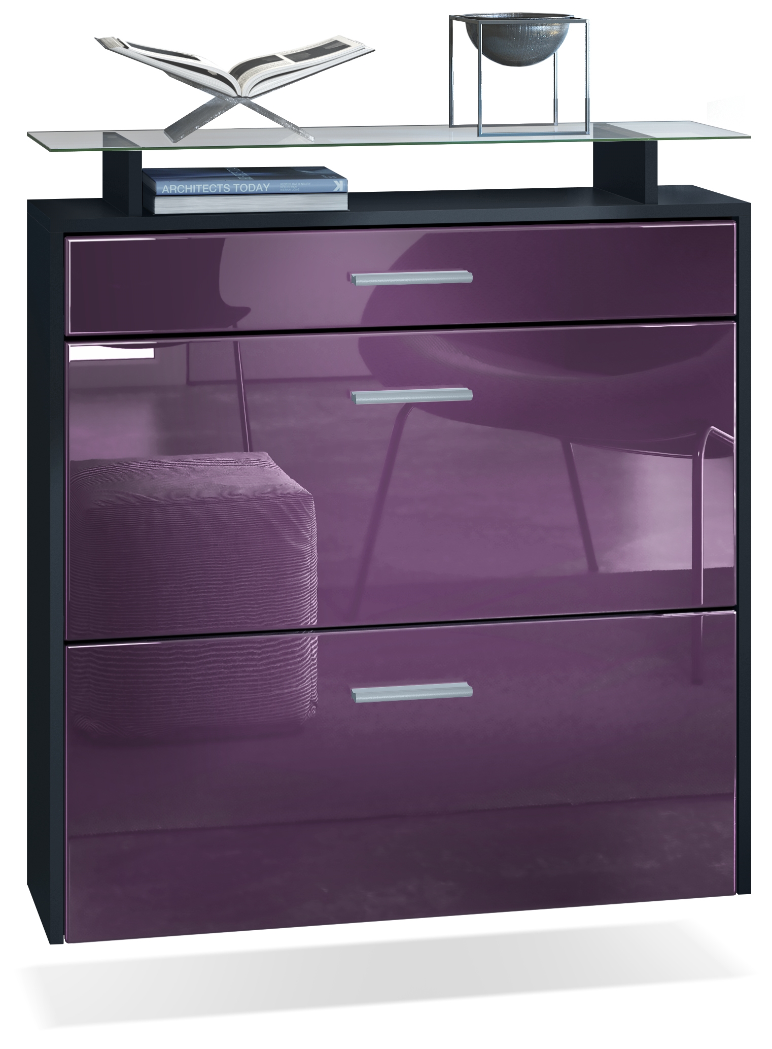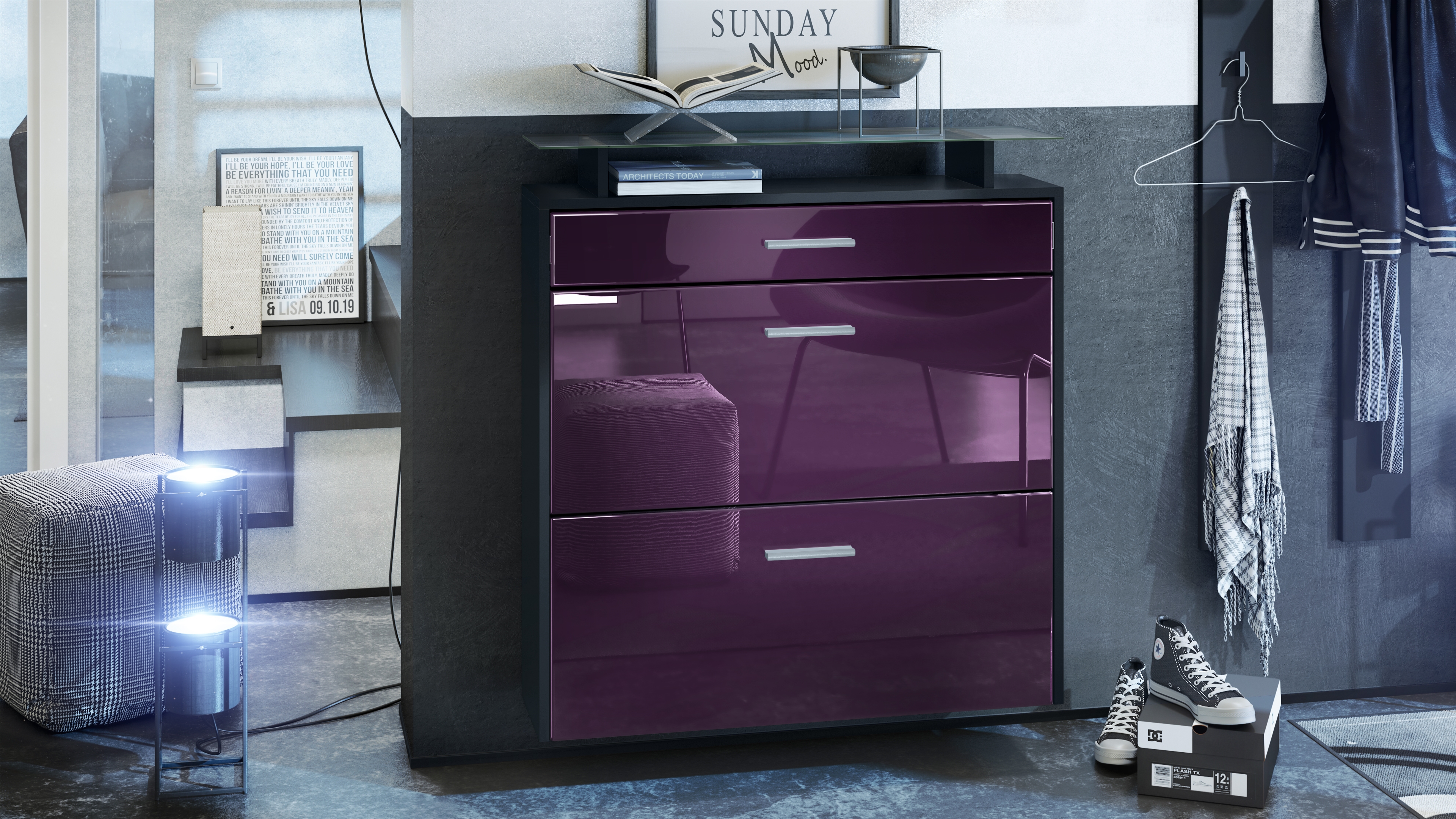 Produktinformationen "Schuhschrank Malea mit 2 Klappen und 1 Schublade und Glasablage Schwarz matt/Brombeer Hochglanz (89 x 96 x 23 cm)"