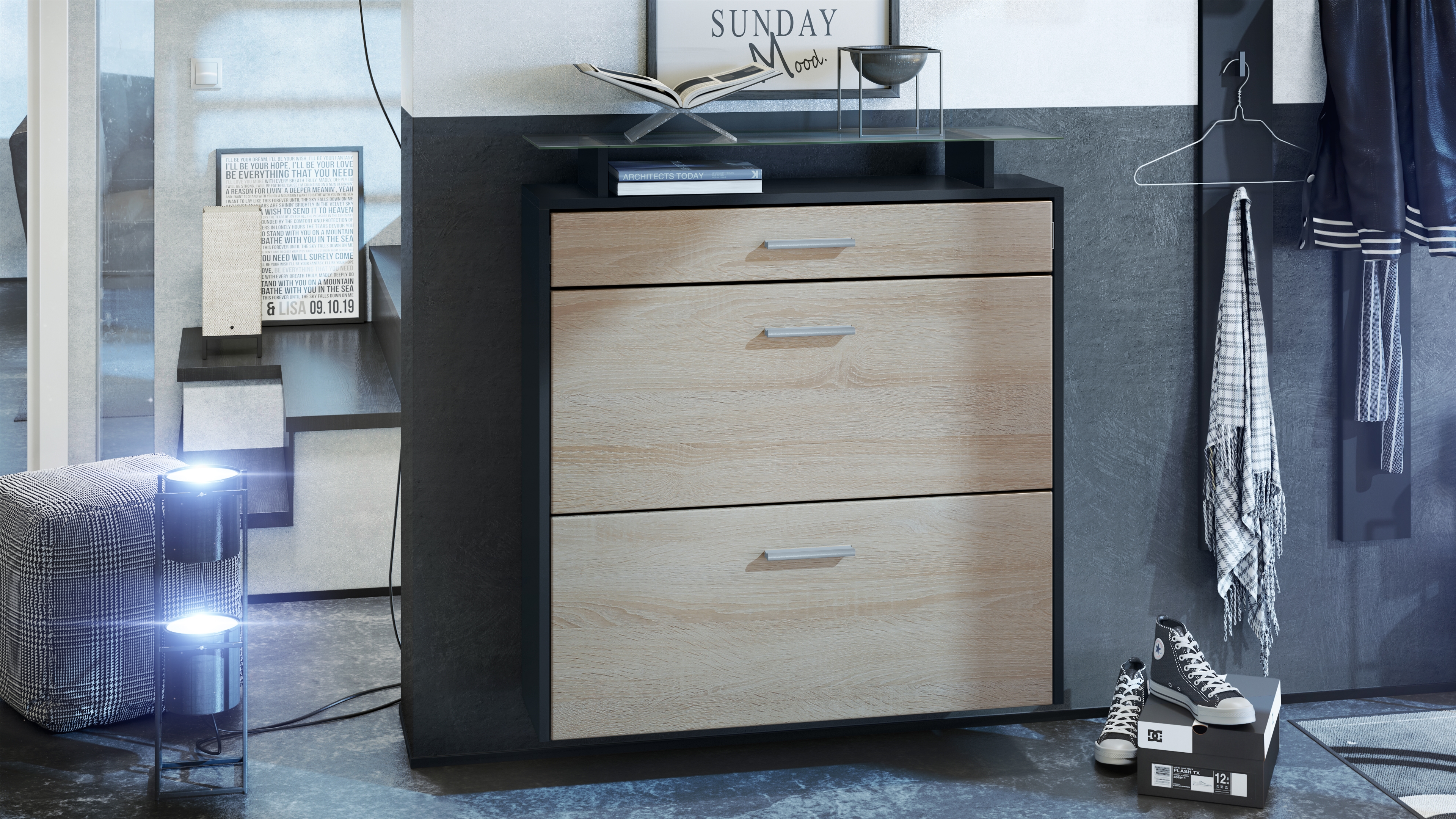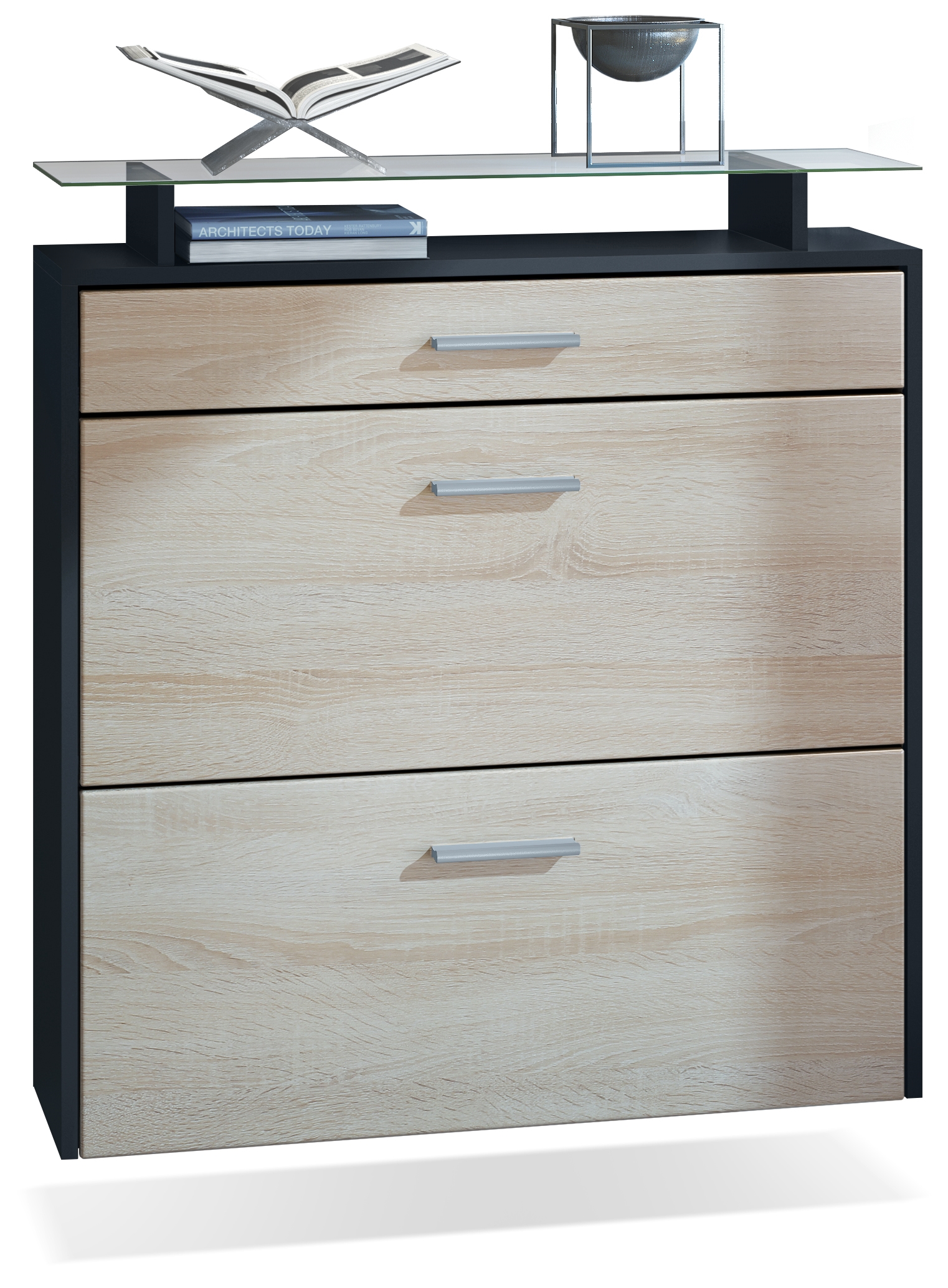 Produktinformationen "Schuhschrank Malea mit 2 Klappen und 1 Schublade und Glasablage Schwarz matt/Eiche Sägerau (89 x 96 x 23 cm)"