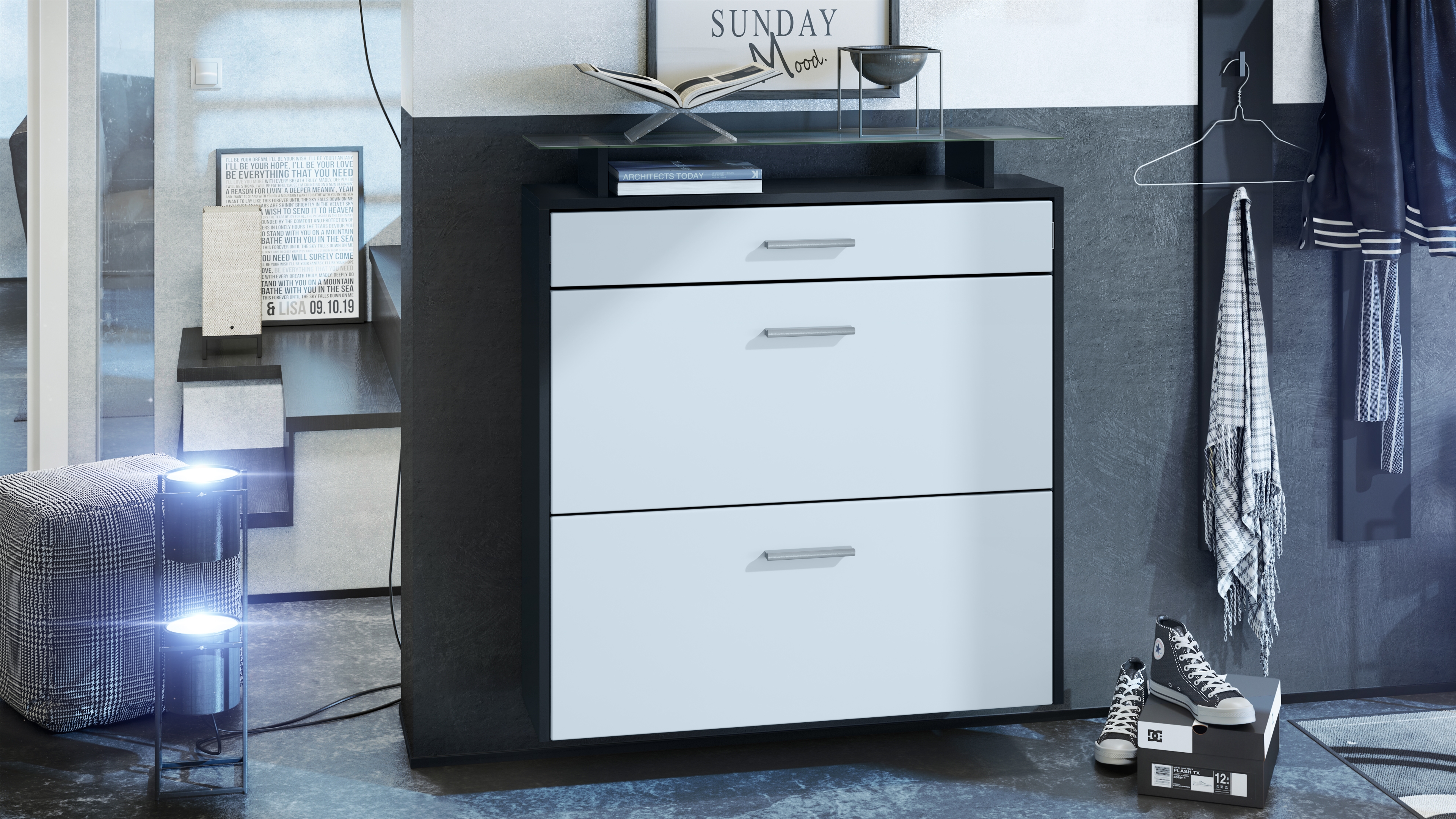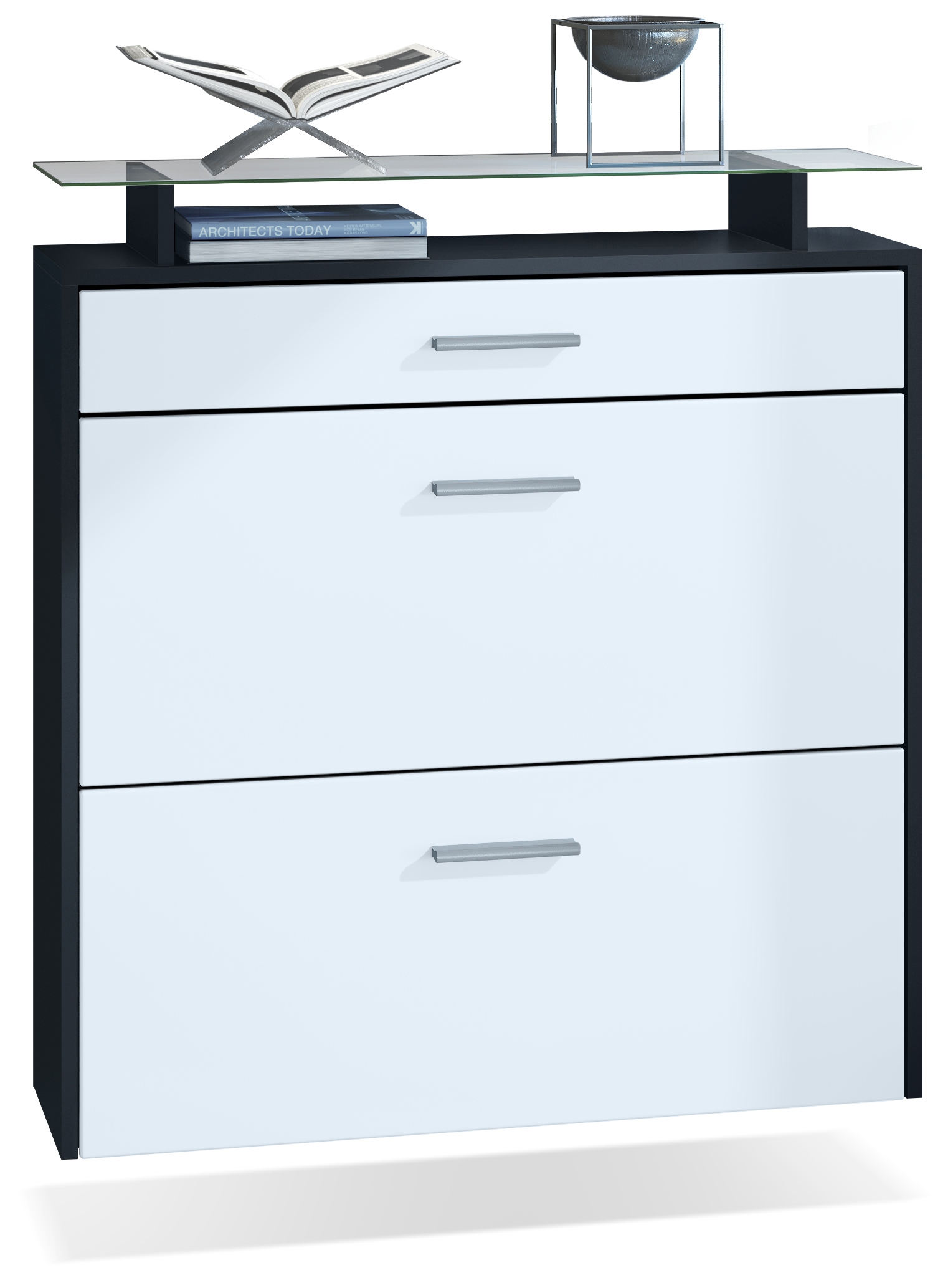 Produktinformationen "Schuhschrank Malea mit 2 Klappen und 1 Schublade und Glasablage Schwarz matt/Weiß matt (89 x 96 x 23 cm)"