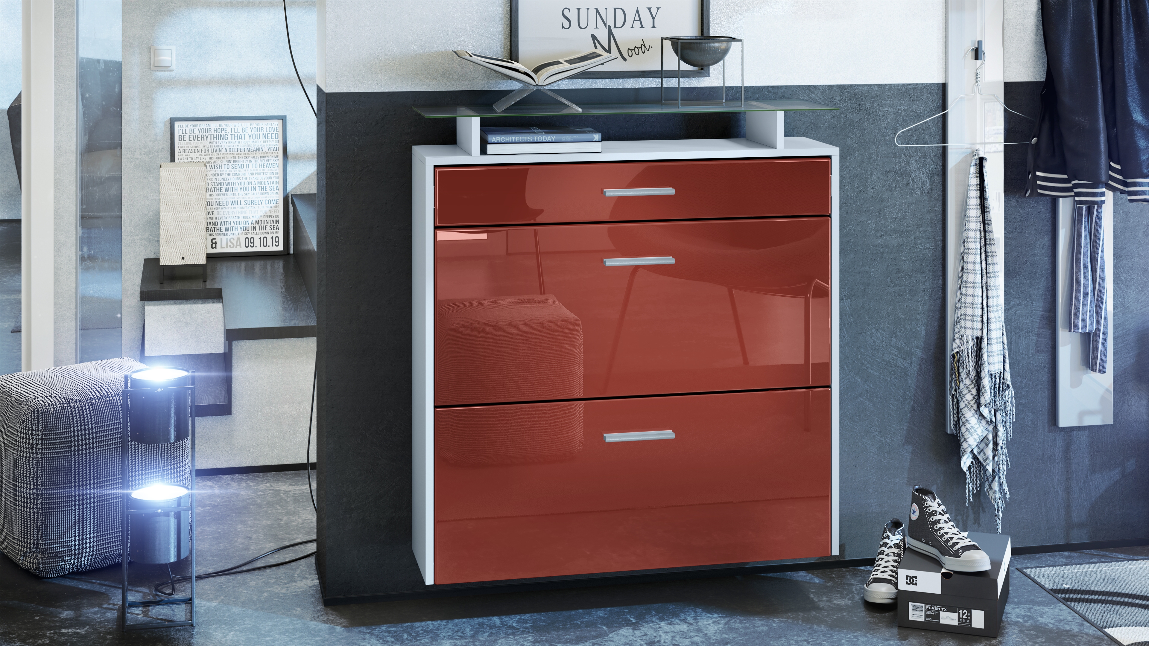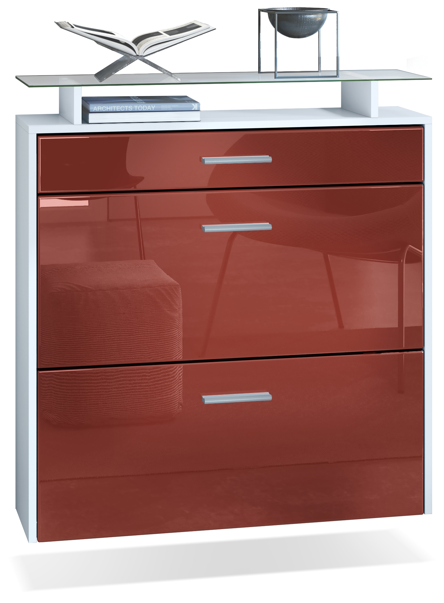 Produktinformationen "Schuhschrank Malea mit 2 Klappen und 1 Schublade und Glasablage Weiß matt/Bordeaux Hochglanz (89 x 96 x 23 cm)"
