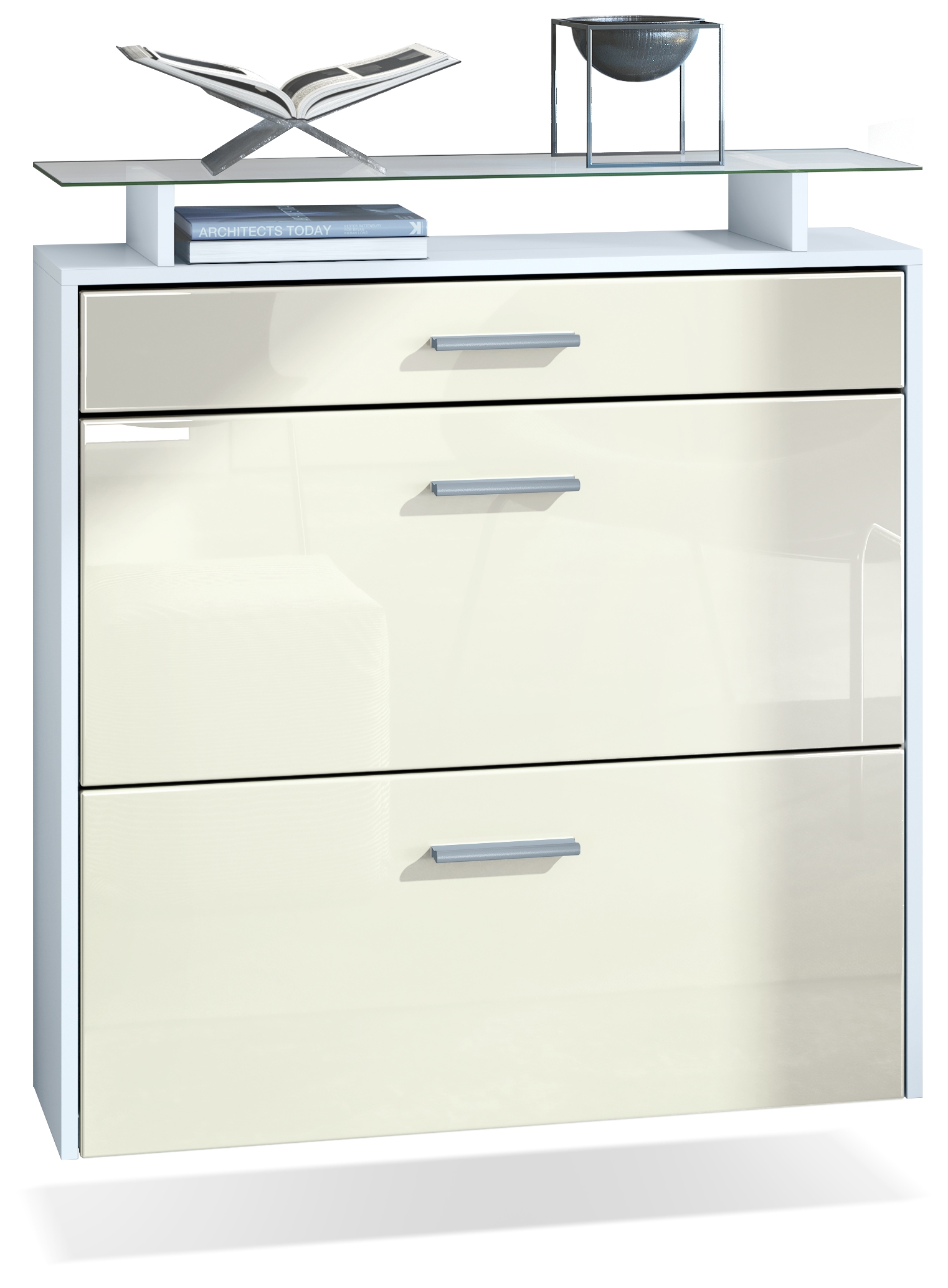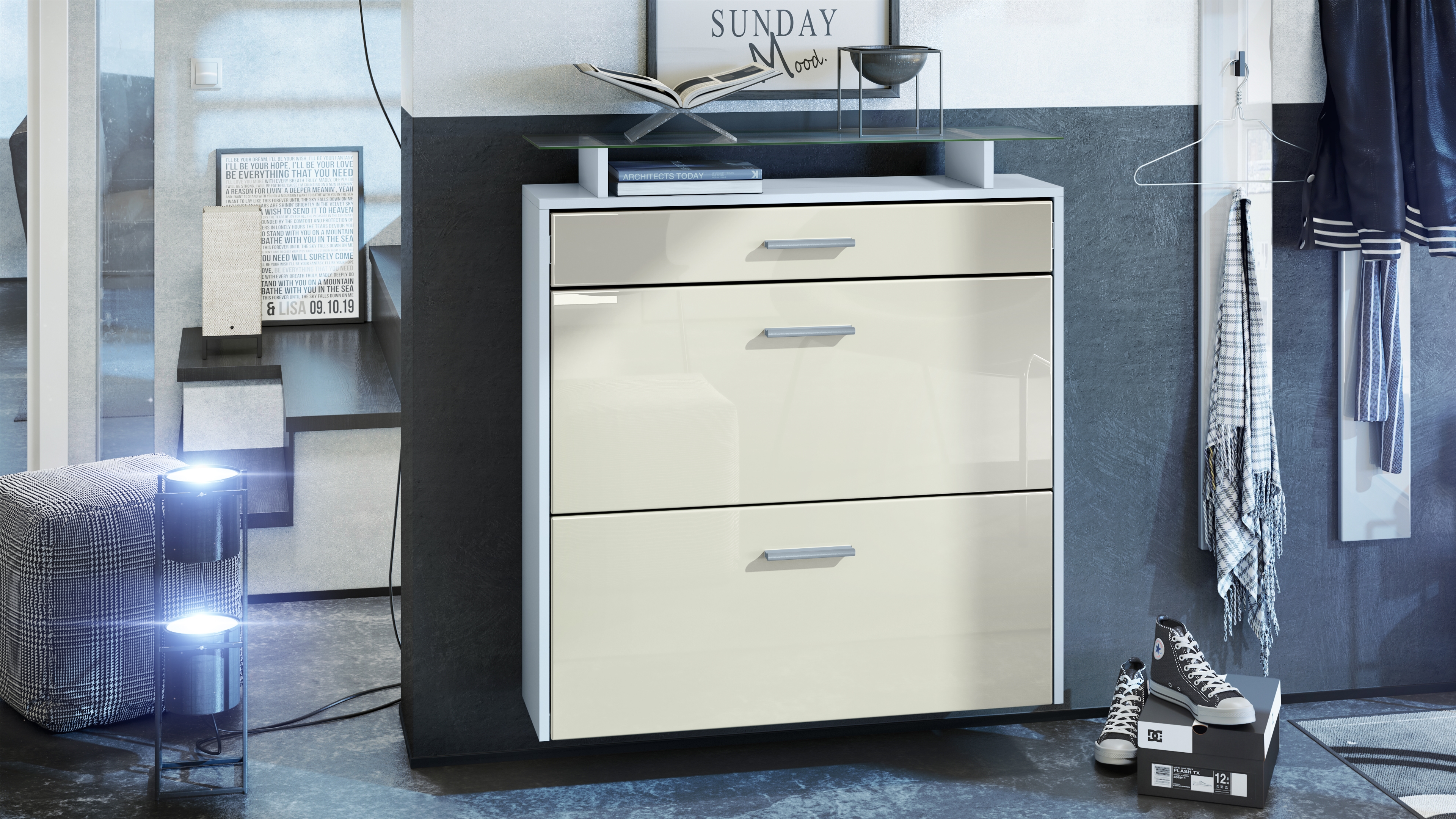 Produktinformationen "Schuhschrank Malea mit 2 Klappen und 1 Schublade und Glasablage Weiß matt/Creme Hochglanz (89 x 96 x 23 cm)"