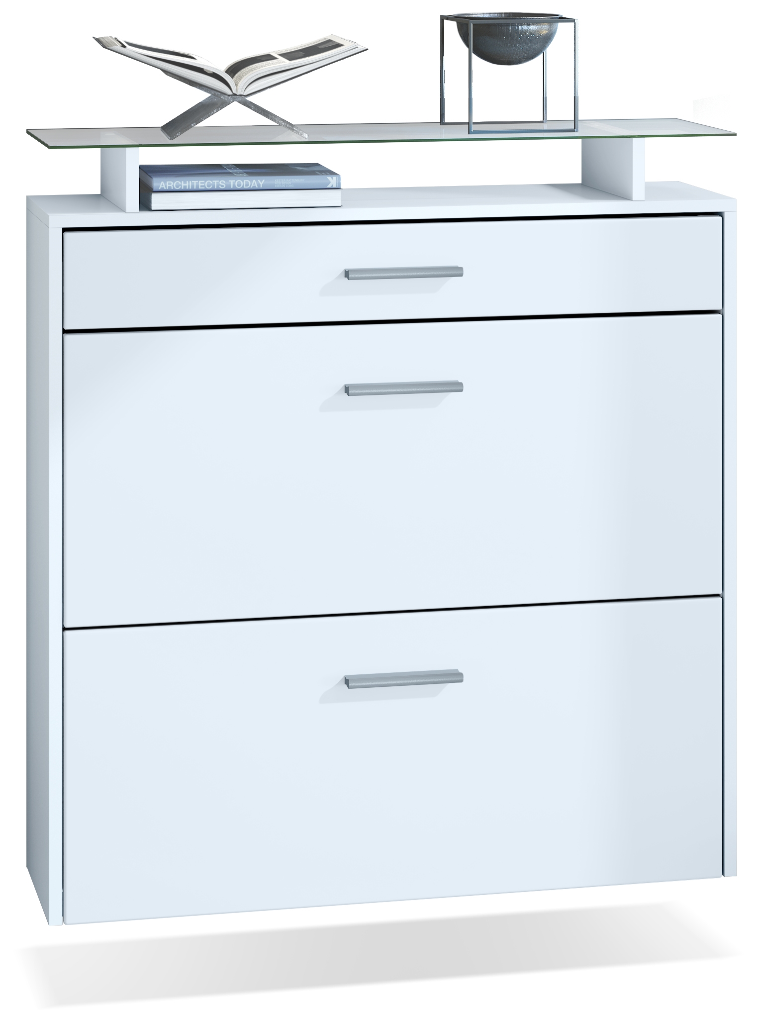 Das hängende Schuhschregal Malea präsentiert sich als praktisches Möbelstück mit modernem Design für die Diele, hergestellt in Deutschland. Der schmale Schuhschrank ist mit zwei Schuhkippern mit doppelten Schuhhalterungen und mit einer leichtgängigen Schublade ausgerüstet. Diese verläuft dank Laufschienen aus Metall nahezu geräuschlos und sorgt für eine leichte Handhabung. Der Schuhorganizer ist mit dezenten, silbernen Griffen ausgestattet. Zusätzlich gibt es eine aufgesetzte Glasablage für das Schuhregal. Mit dem inkludierten Material zur Wandmontage fixieren Sie den Schuhschrank hängend an der Wand.