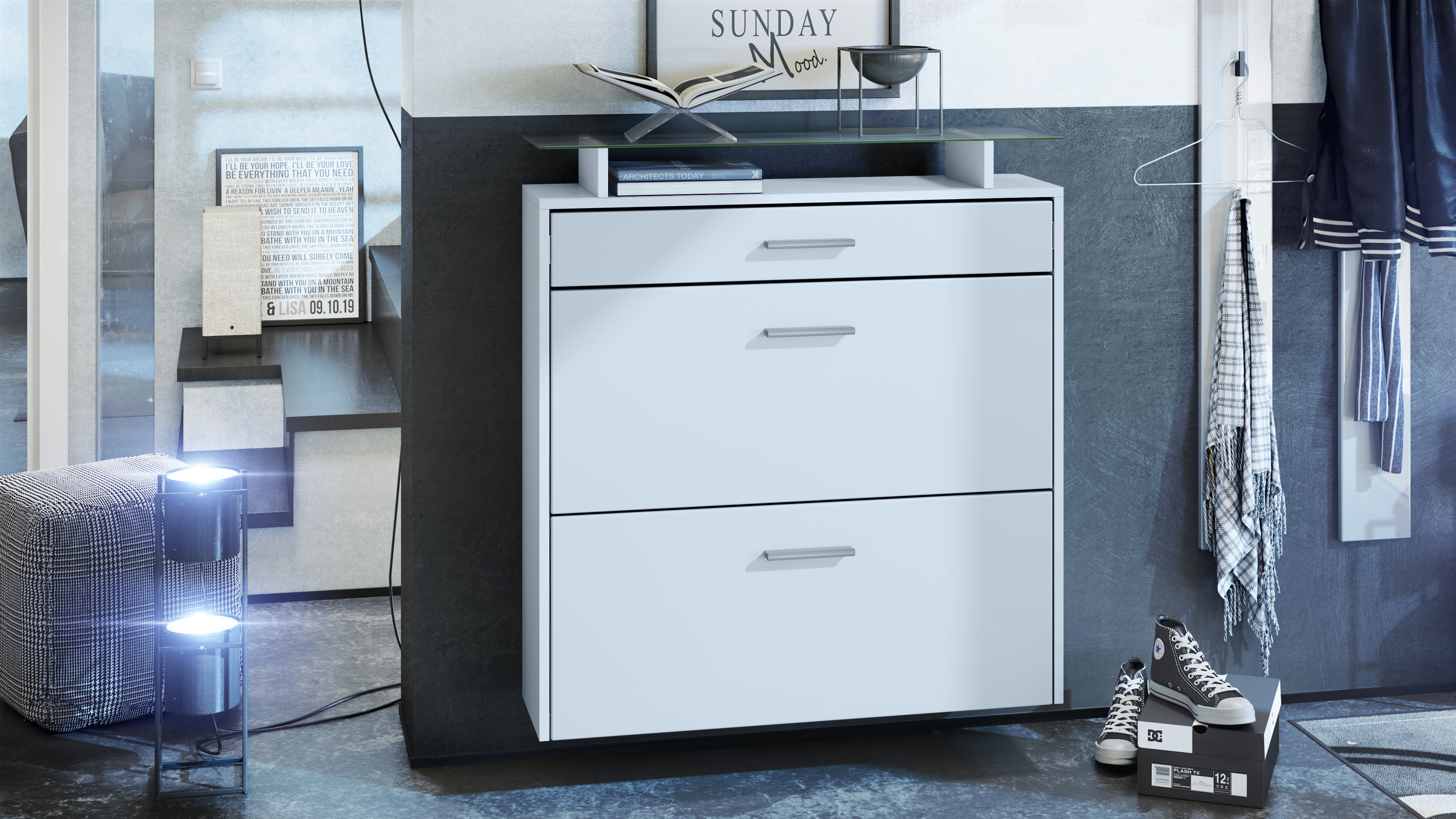 Produktinformationen "Schuhschrank Malea mit 2 Klappen und 1 Schublade und Glasablage Weiß matt (89 x 96 x 23 cm)"