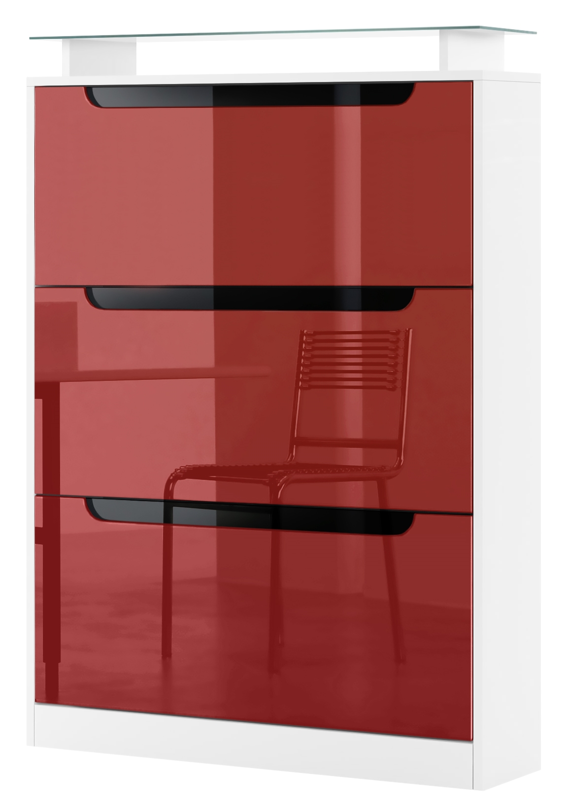 Produktinformationen "Schuhschrank Space für 24 Paar Schuhe mit 3 Klappen und Glasablage Weiß matt/Bordeaux glänzend/Absetzung Schwarz glänzend (89x128x23 cm)"