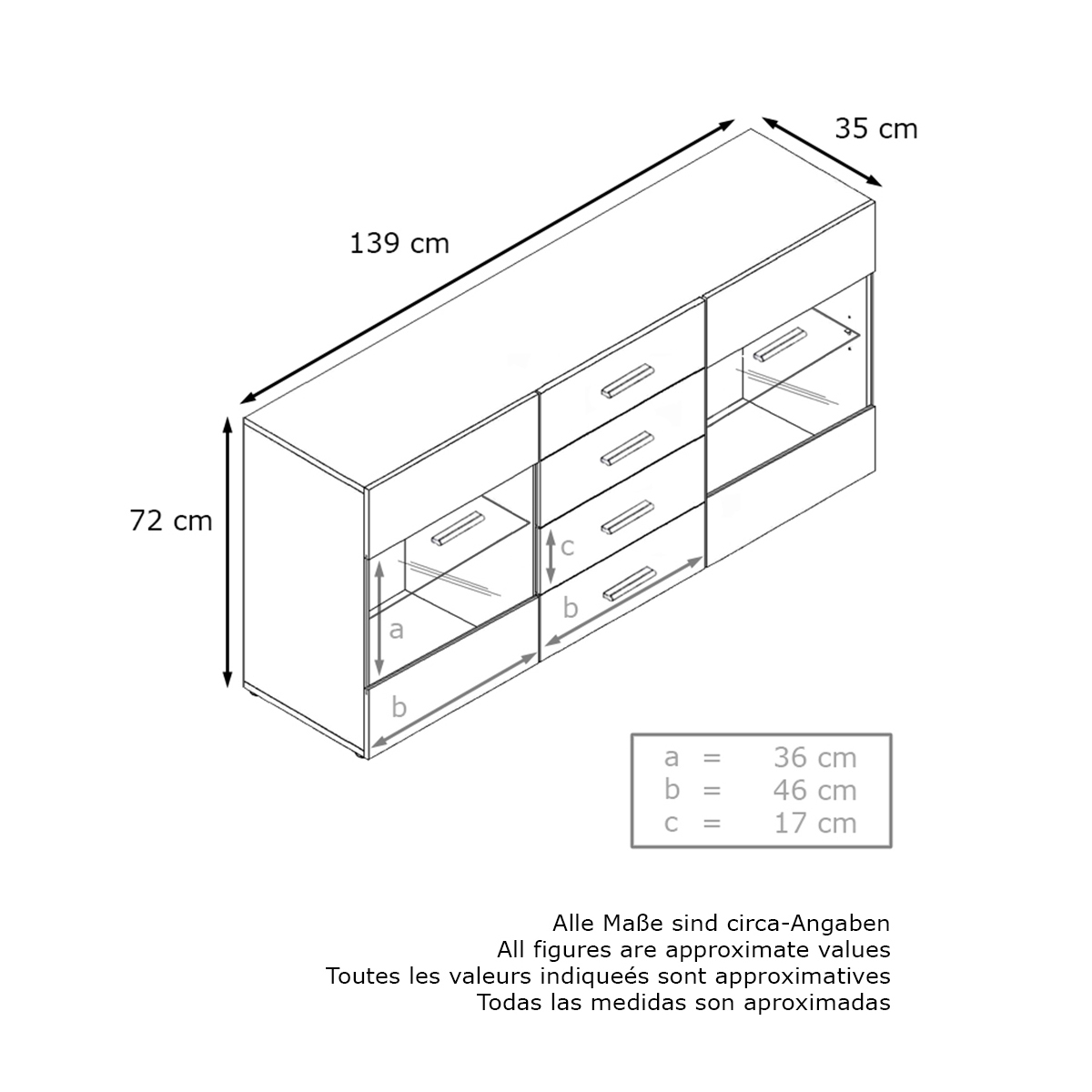 Mit den Maßen 139 x 72 x 35 cm (BxHxT) bietet das Carlos V1 Sideboard ausreichend Platz für Kleidung, Geschirr, Bücher und andere Alltagsgegenstände. Schubladen und Türen ermöglichen eine übersichtliche und geordnete Aufbewahrung.