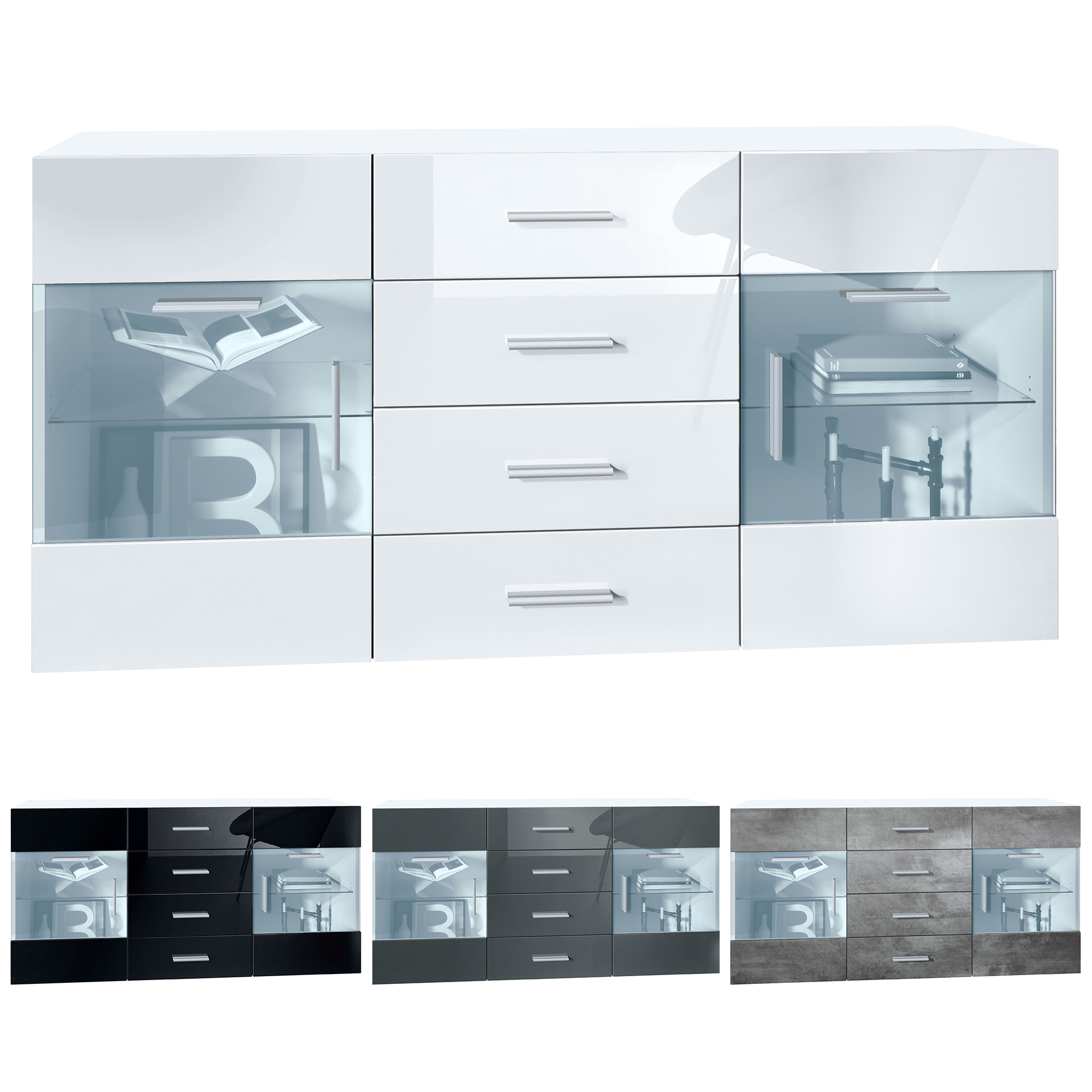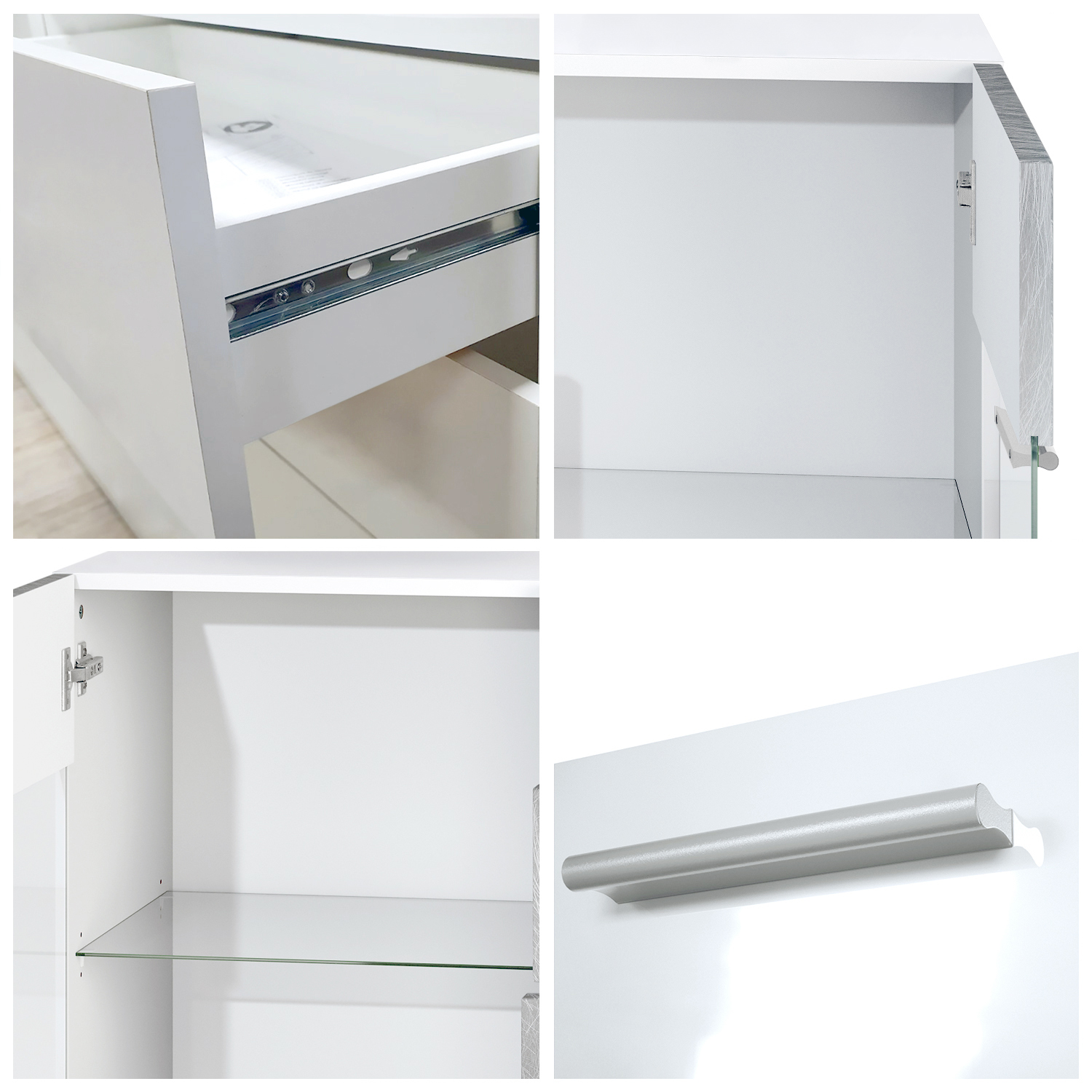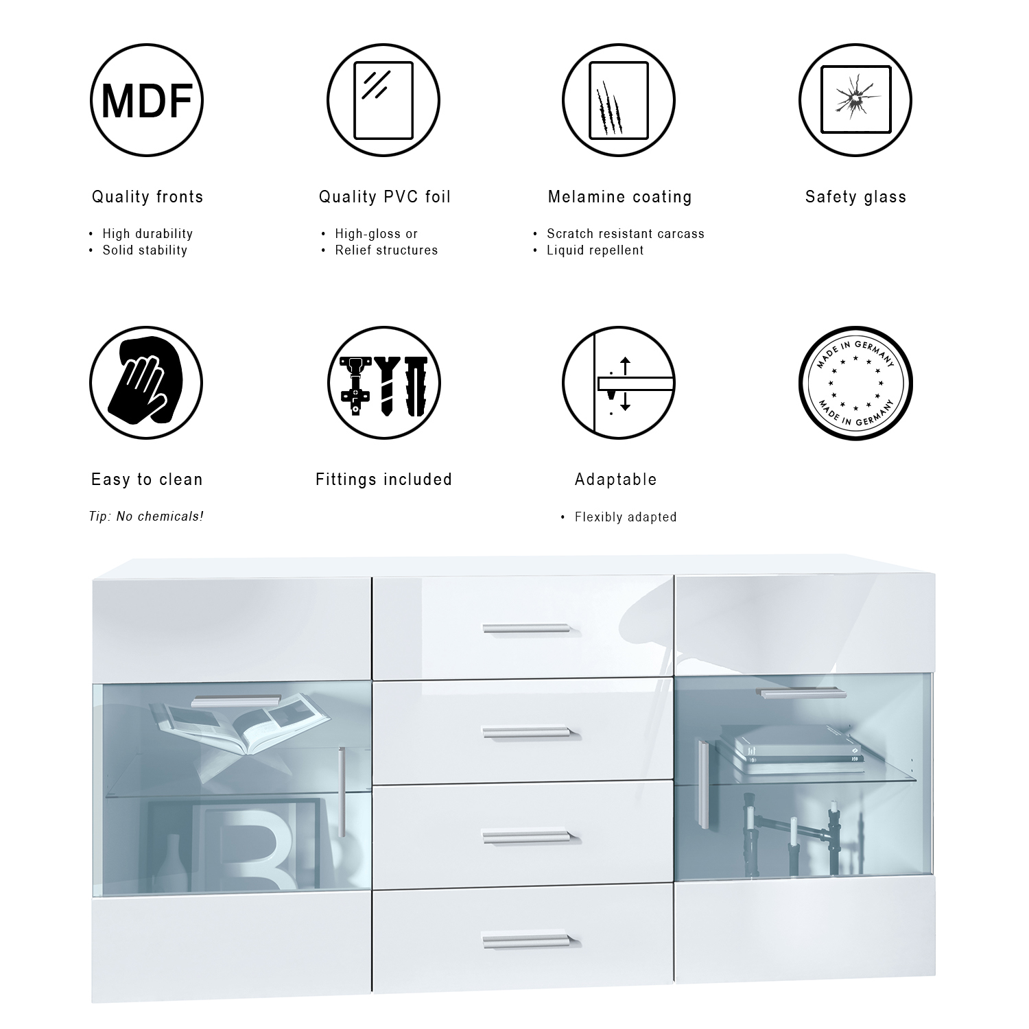 Silberfarbene Kunststoffgriffe fügen sich harmonisch ins Design ein. Der stabile Korpus des Carlos V1 Sideboards aus melaminbeschichteter Spanplatte und hochwertig foliierte MDF-Fronten garantieren Langlebigkeit, einfache Pflege und einen glänzenden Look.