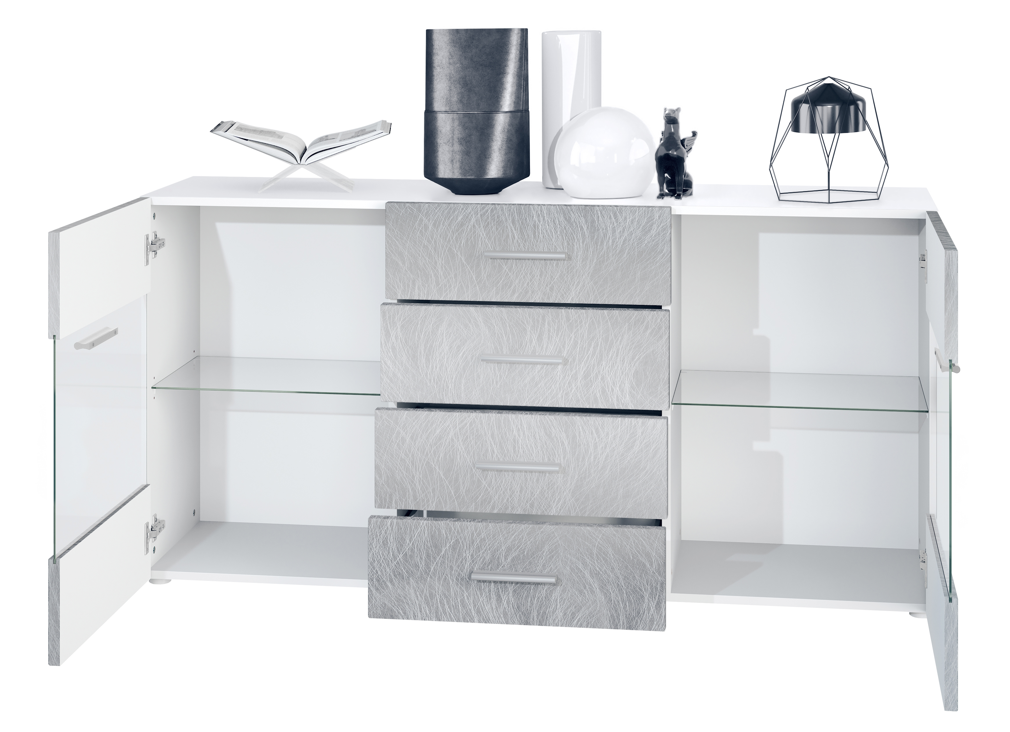 Das Carlos V1 Sideboard verfügt über vier geräuschlos laufende Schubladen auf Metall-Teleskopschienen, ideal zur staubgeschützten Aufbewahrung kleiner Alltagsgegenstände. An den Seiten befinden sich zwei Türen mit rahmenloser Verglasung und Glaseinlegeböden, die Platz für Dekoration oder Lieblingsaccessoires bieten und ein offenes, modernes Erscheinungsbild schaffen.