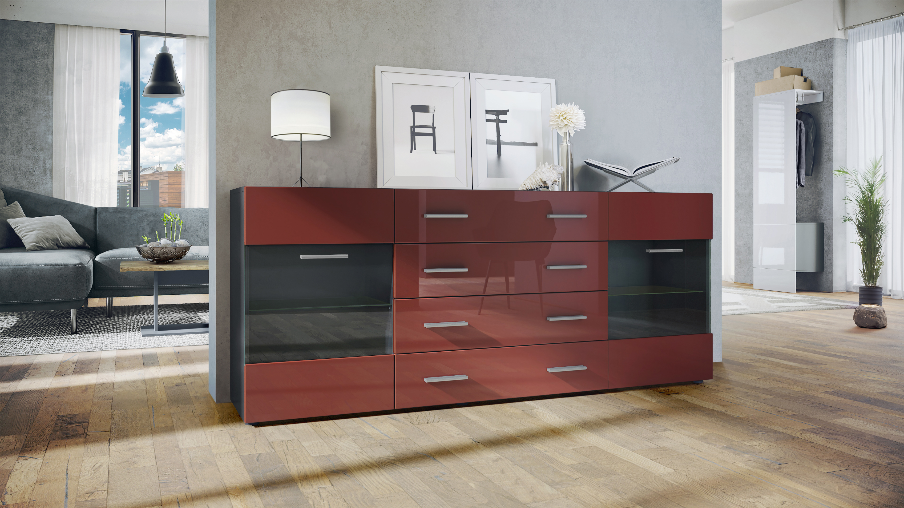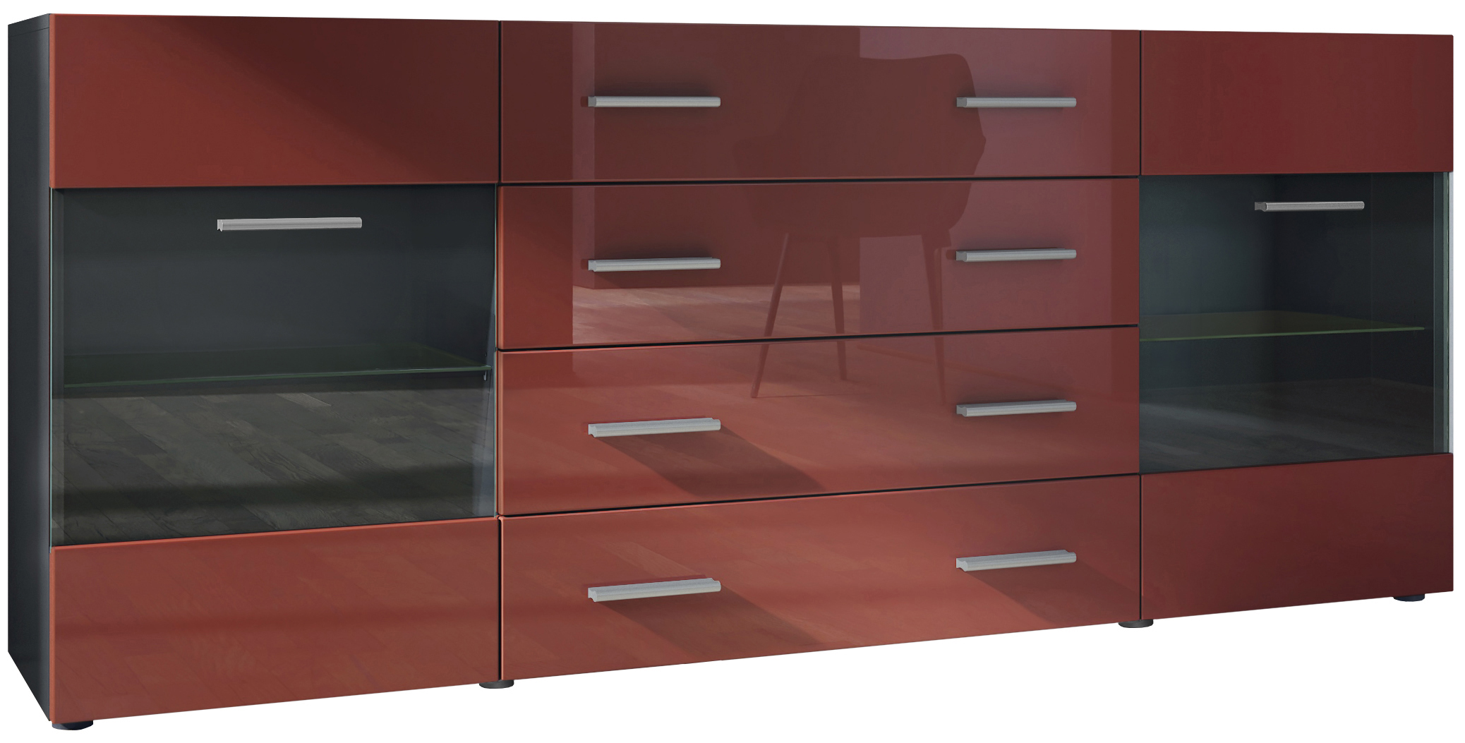 Produktinformationen "Sideboard Carlos V2 4 Schubladen und 2 flexible Glaseinlegeböden Schwarz matt/Bordeaux Hochglanz (166 x 72 x 35)"