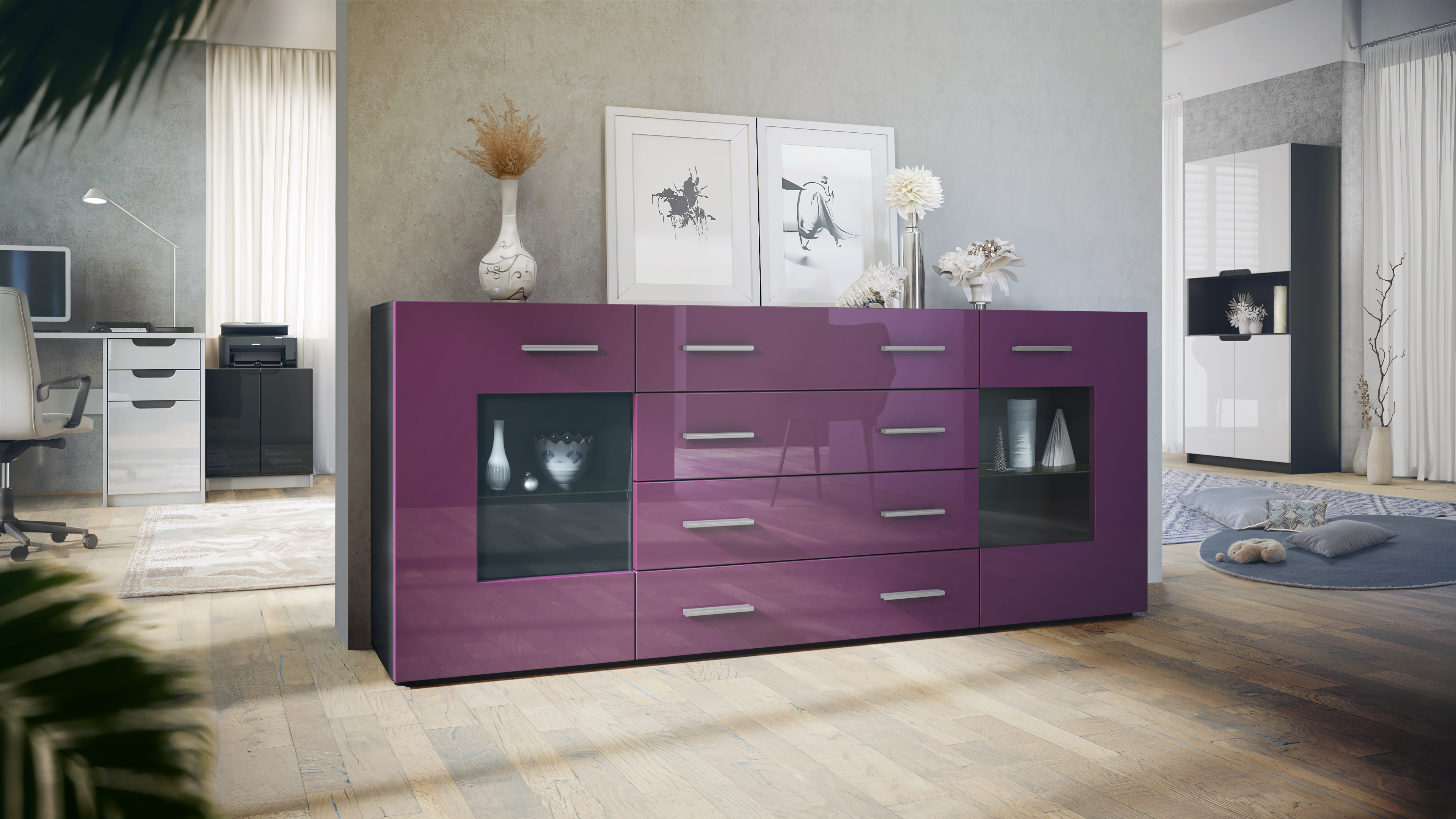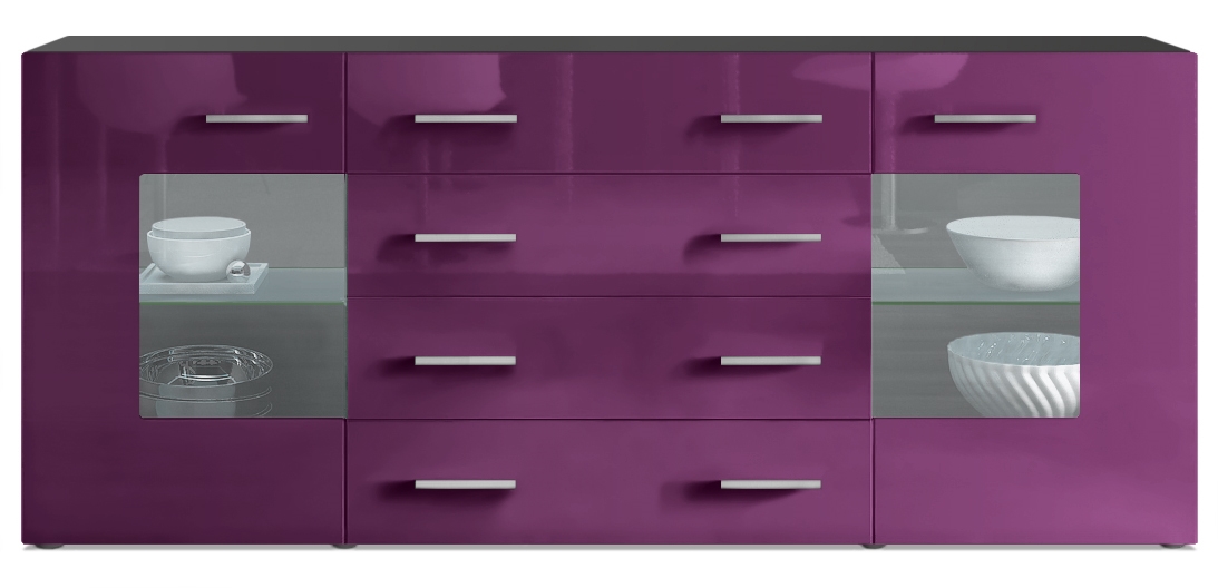 Produktinformationen "Sideboard Noah V2 4 Schubladen und 2 flexible Glaseinlegeböden Schwarz matt/Brombeer Hochglanz (166 x 72 x 35)"